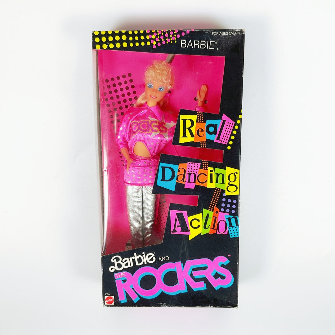 A classic Barbie and The Rockers Real Dancing Action doll from the 1980s, in original box. She features vibrant rock-and-roll fashion and the signature “real dancing” pose mechanism that collectors love. A standout piece for any vintage Barbie collection.