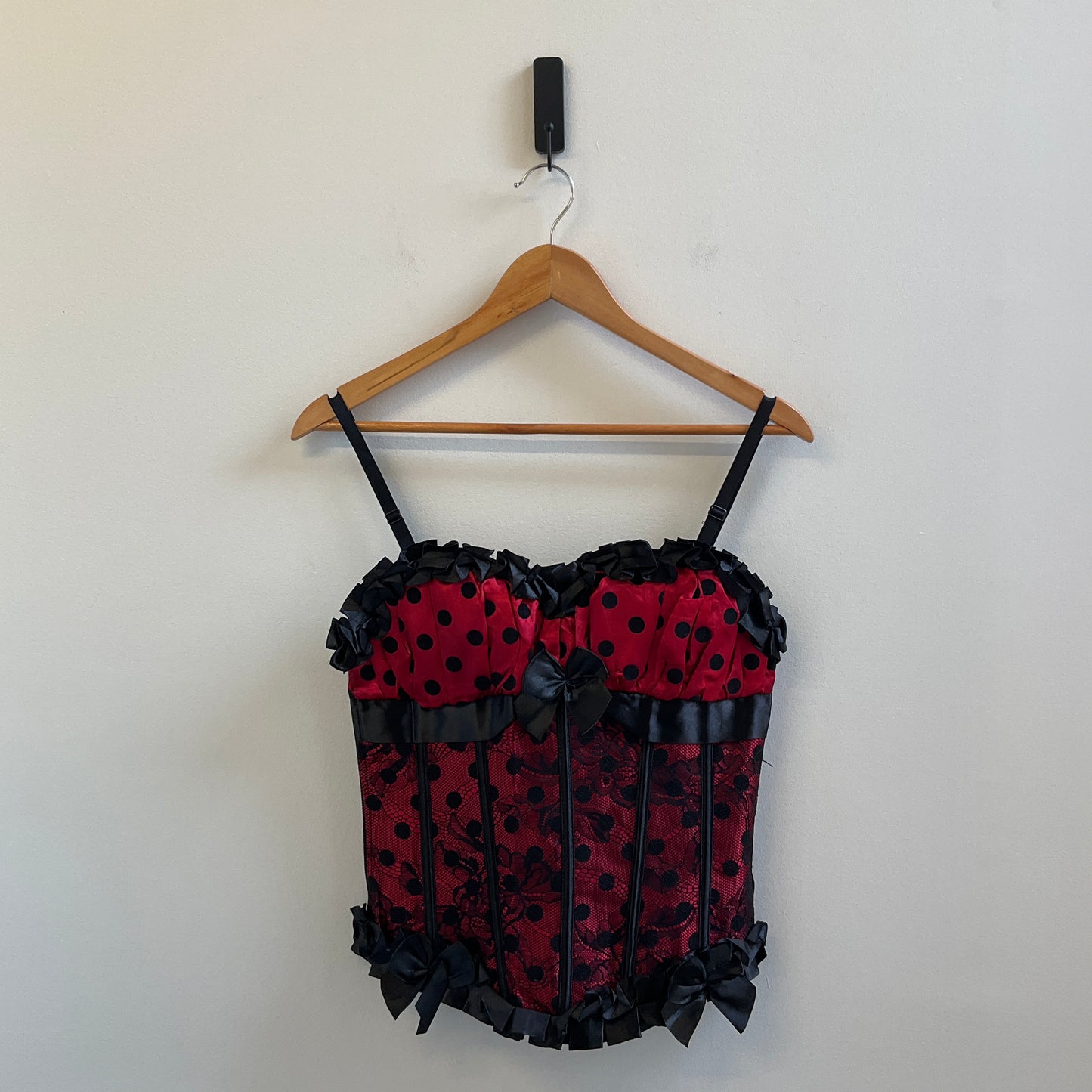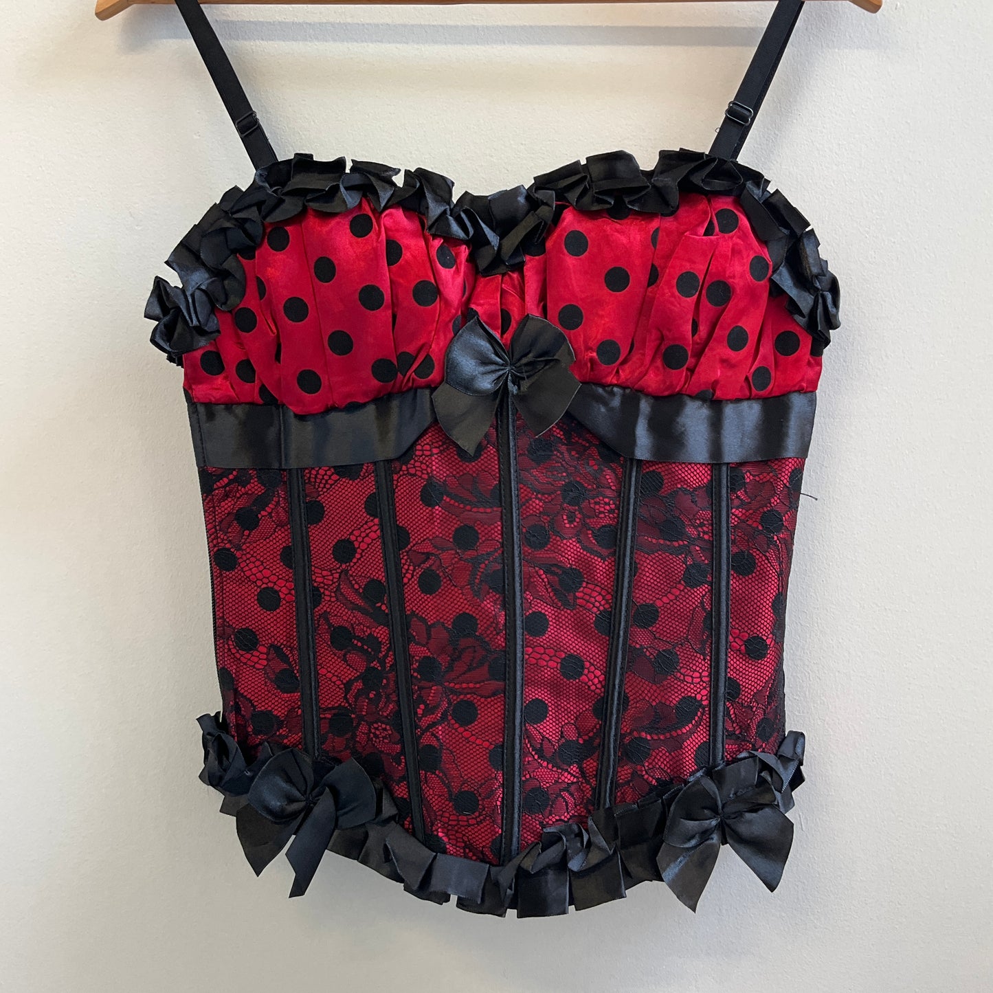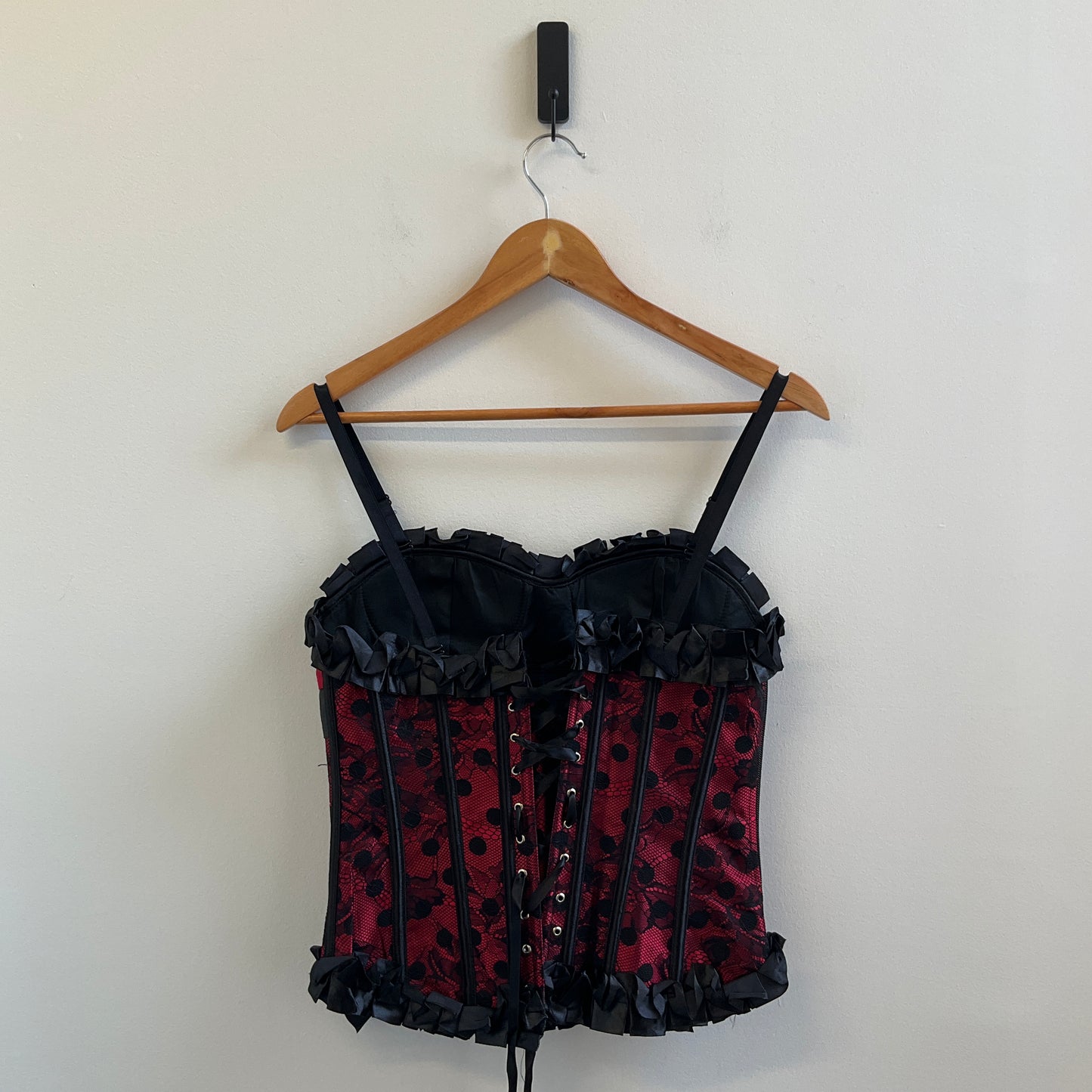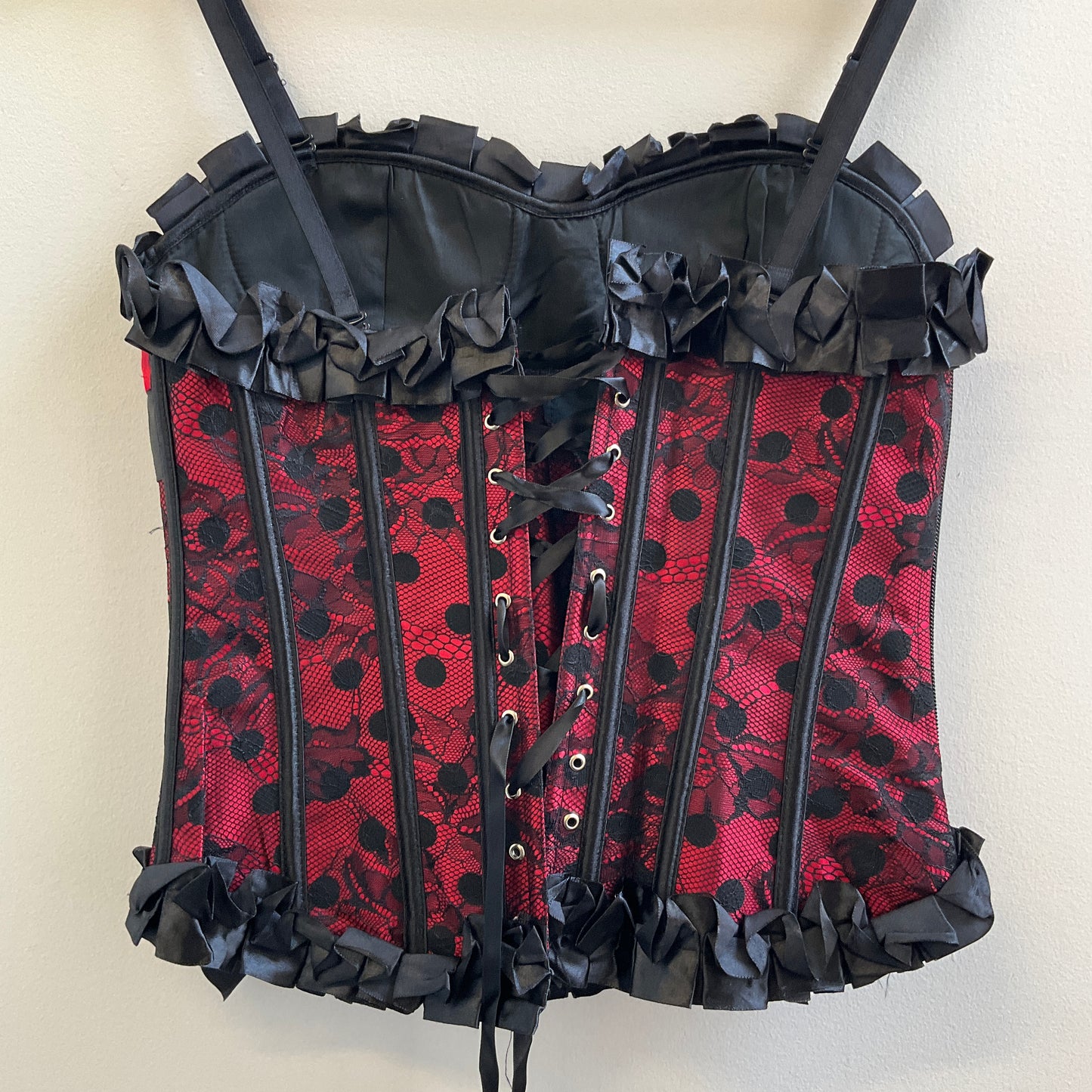 Gorgeous black and red corset. Has side zip to put the corset on as well as tie straps at the back.