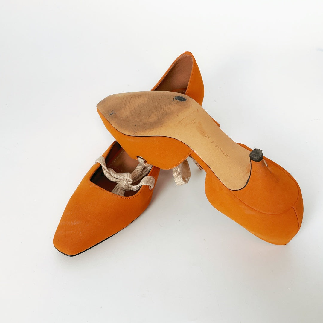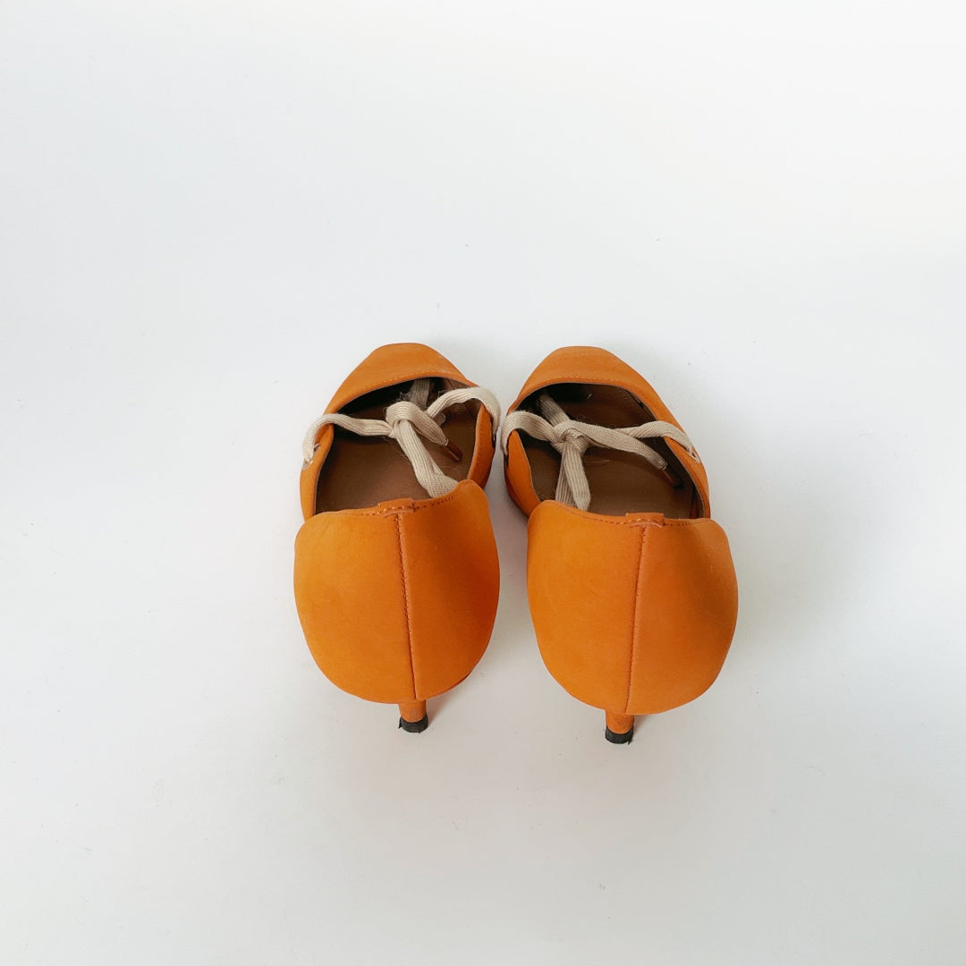 Make a confident statement with this vibrant orange pump. Featuring a sleek silhouette, it’s elevated by delicate lace detailing at the toe area — adding subtle texture and a modern twist to a classic shape, the bold colour brings energy to both neutral outfits and statement ensembles.