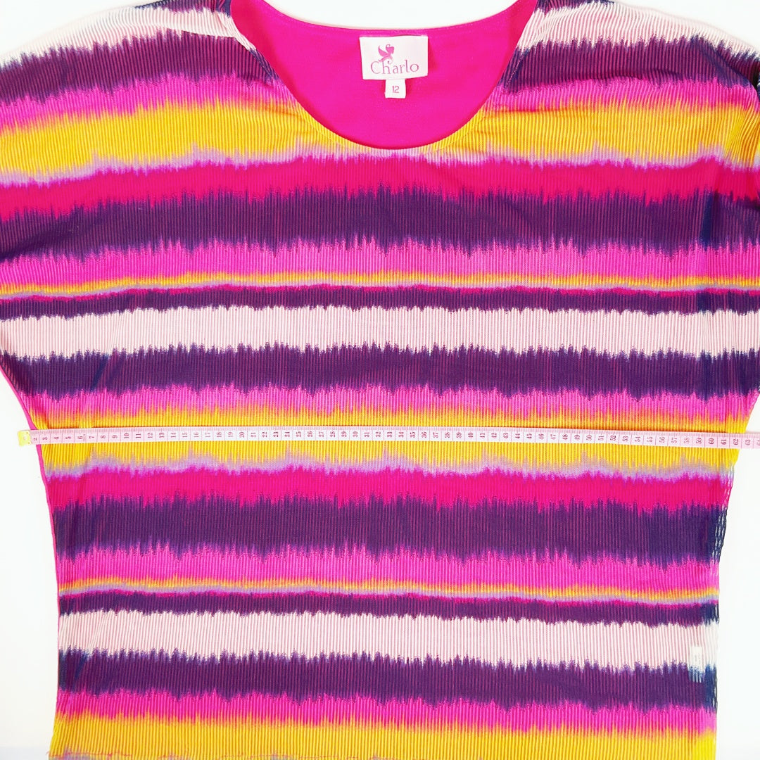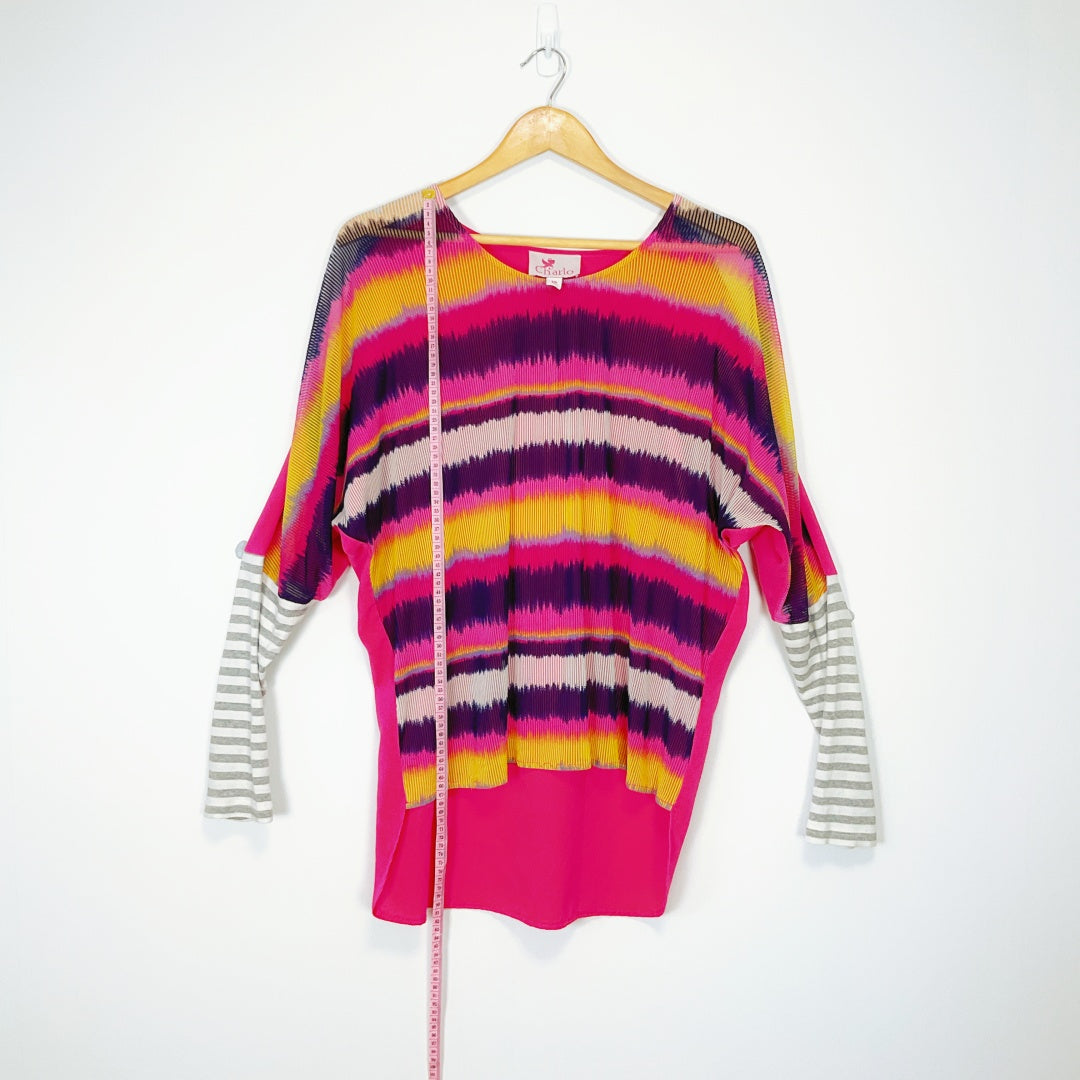 From the Charlo Wolf Me Wednesday collection, this vibrant coloured top is perfect for effortless summer styling. Featuring an eye-catching dye design at the front with a plain magenta back body. Designed with relaxed bat-wing sleeves and finished with grey and white striped ribbed sleeve cuffs, this piece combines comfort with standout styleβideal for warm-weather days and laid-back occasions.