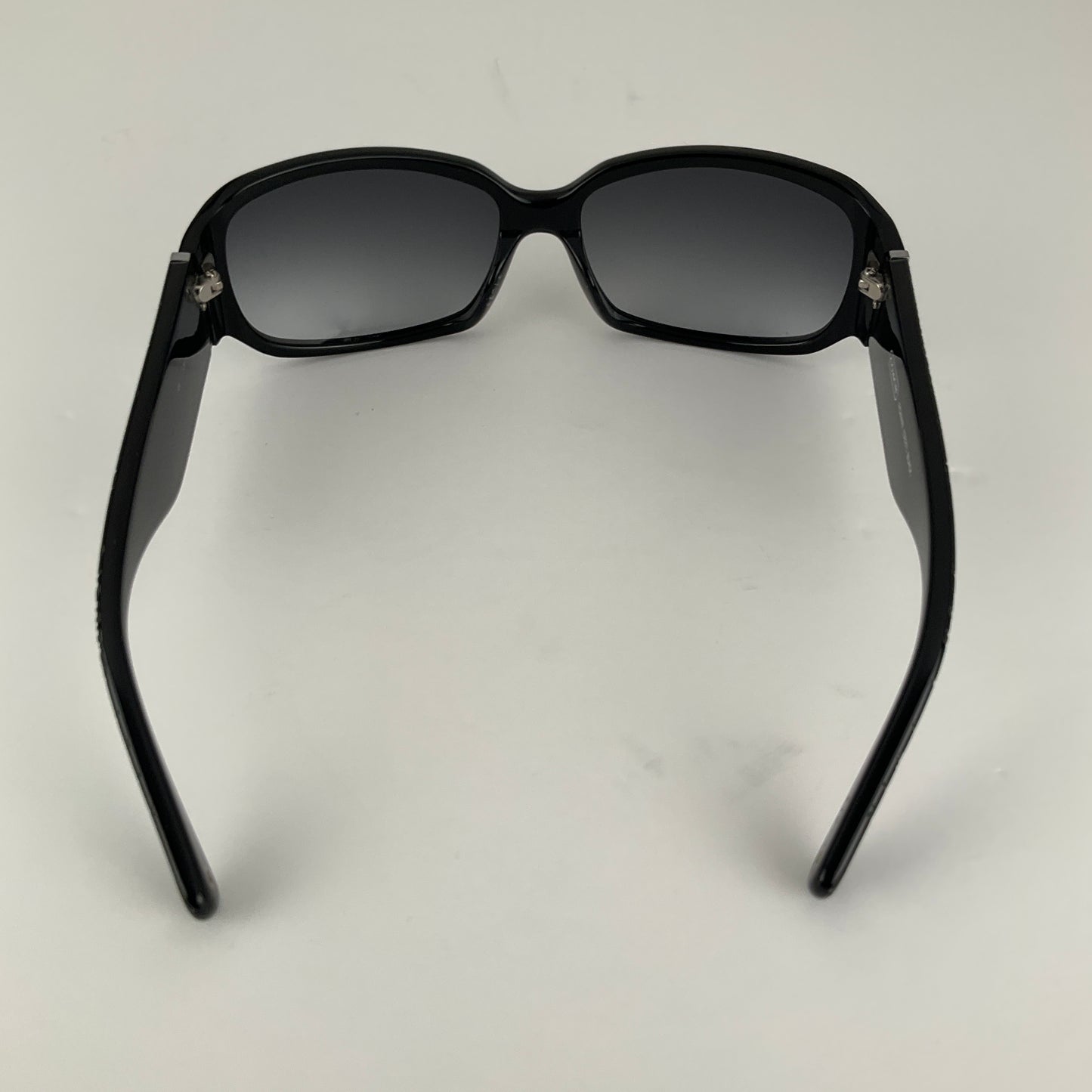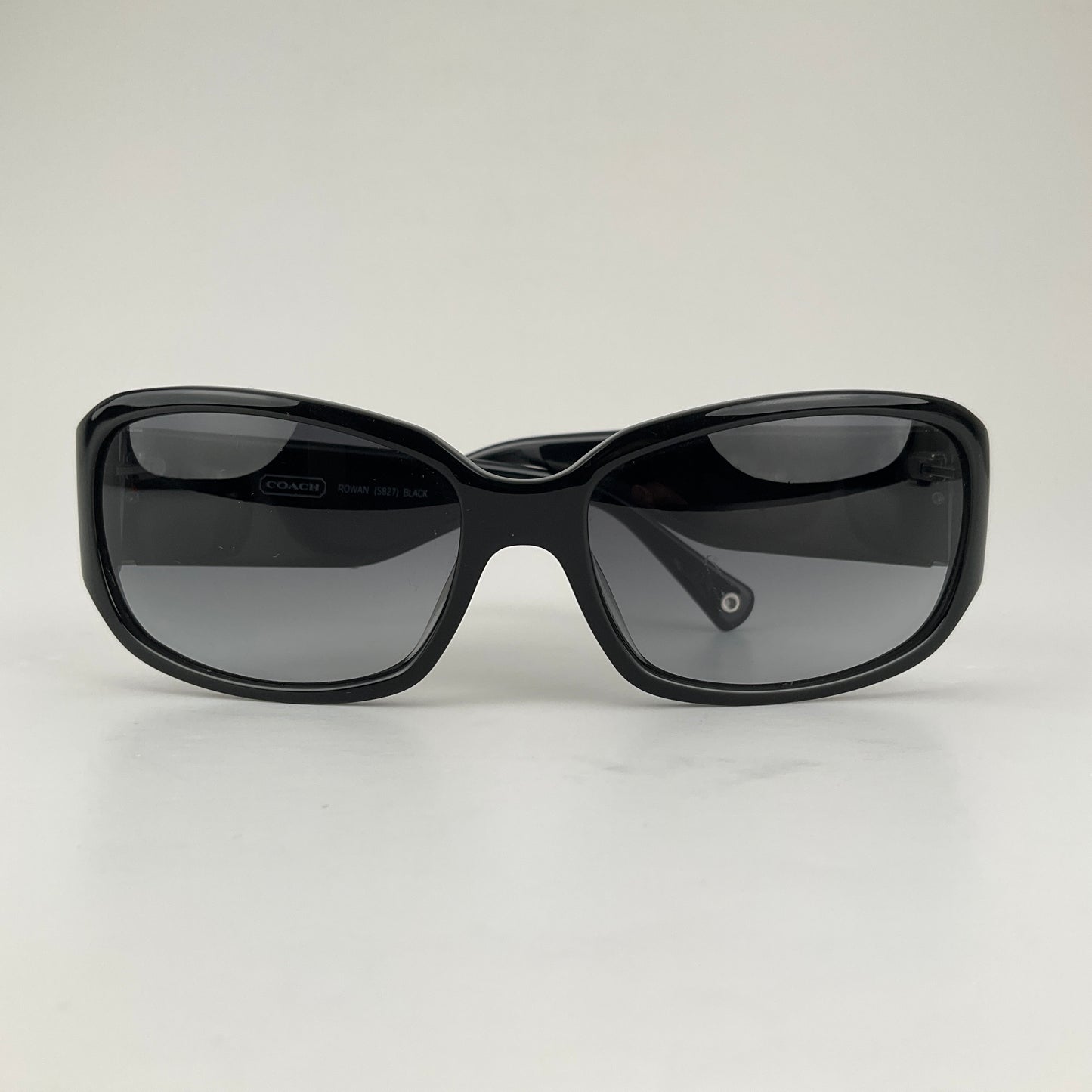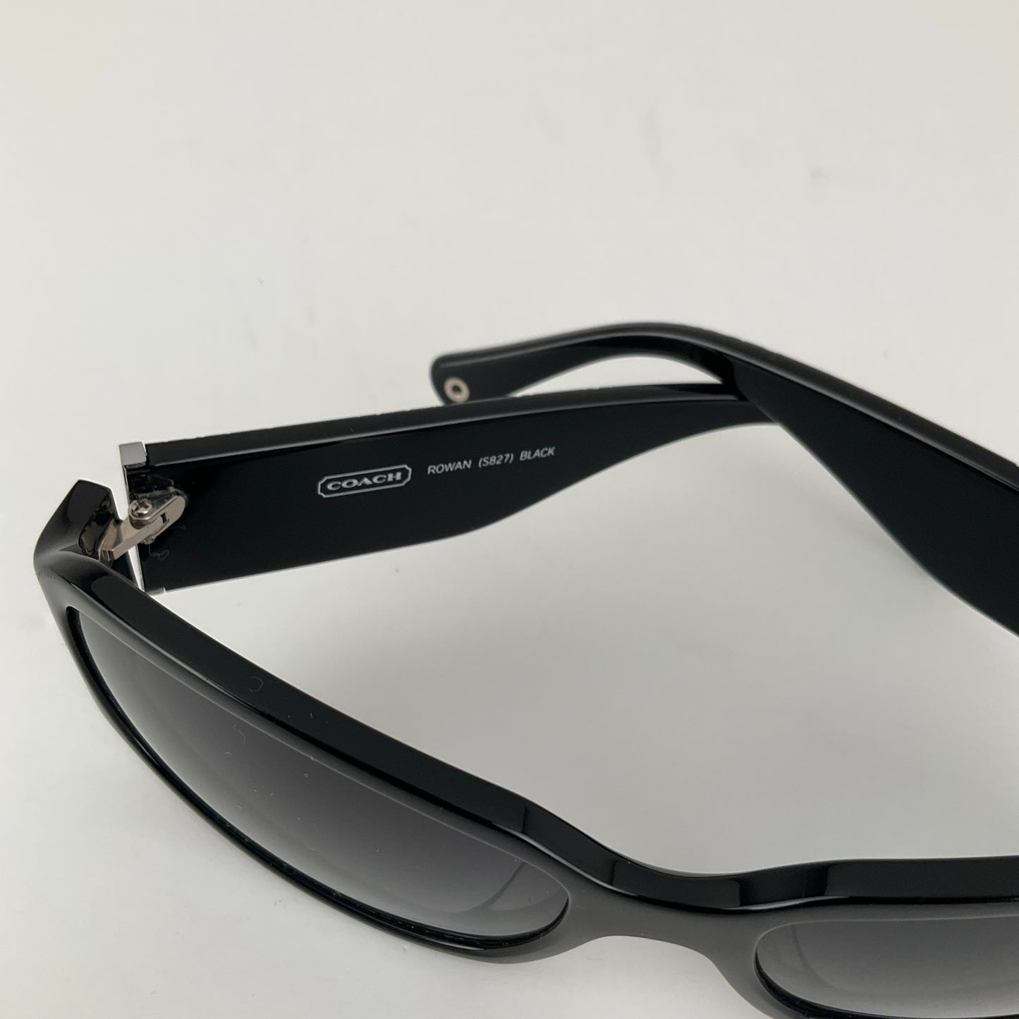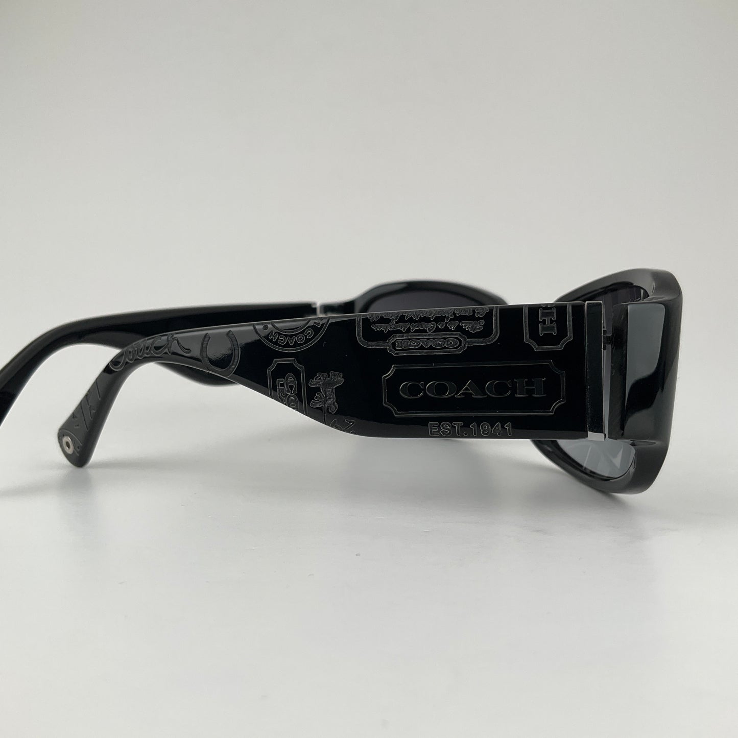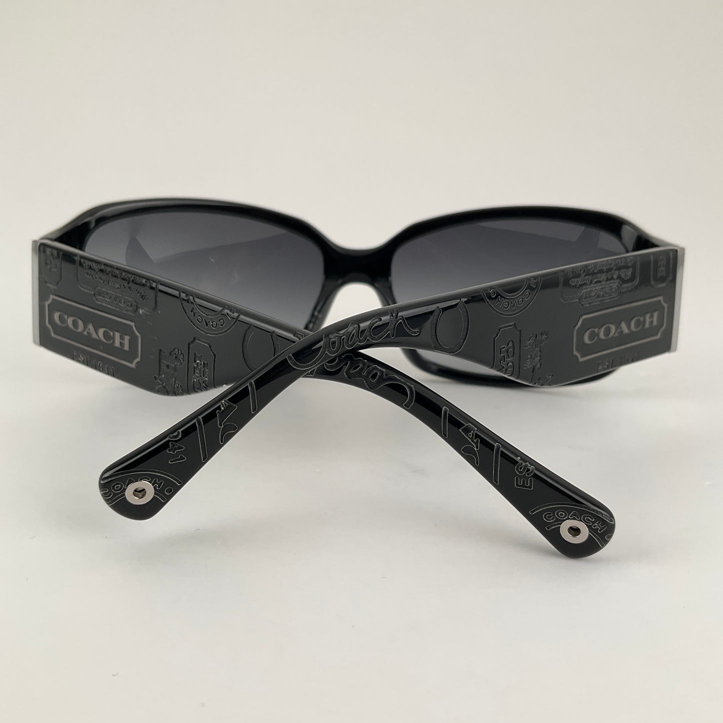 Ladies pair of Coach sunglasses. In black frame and tint. With the distinctive Coach styling and design on the arms.