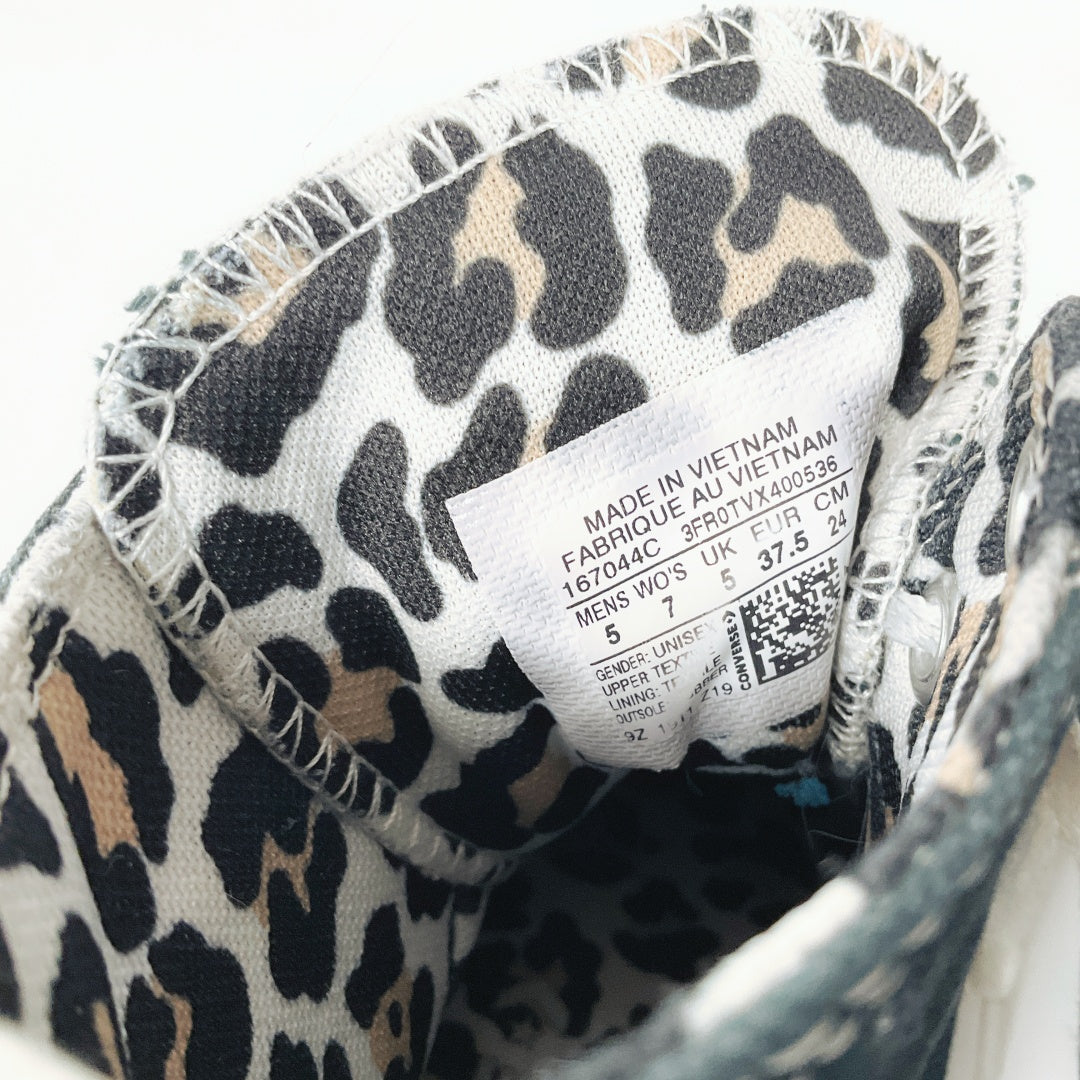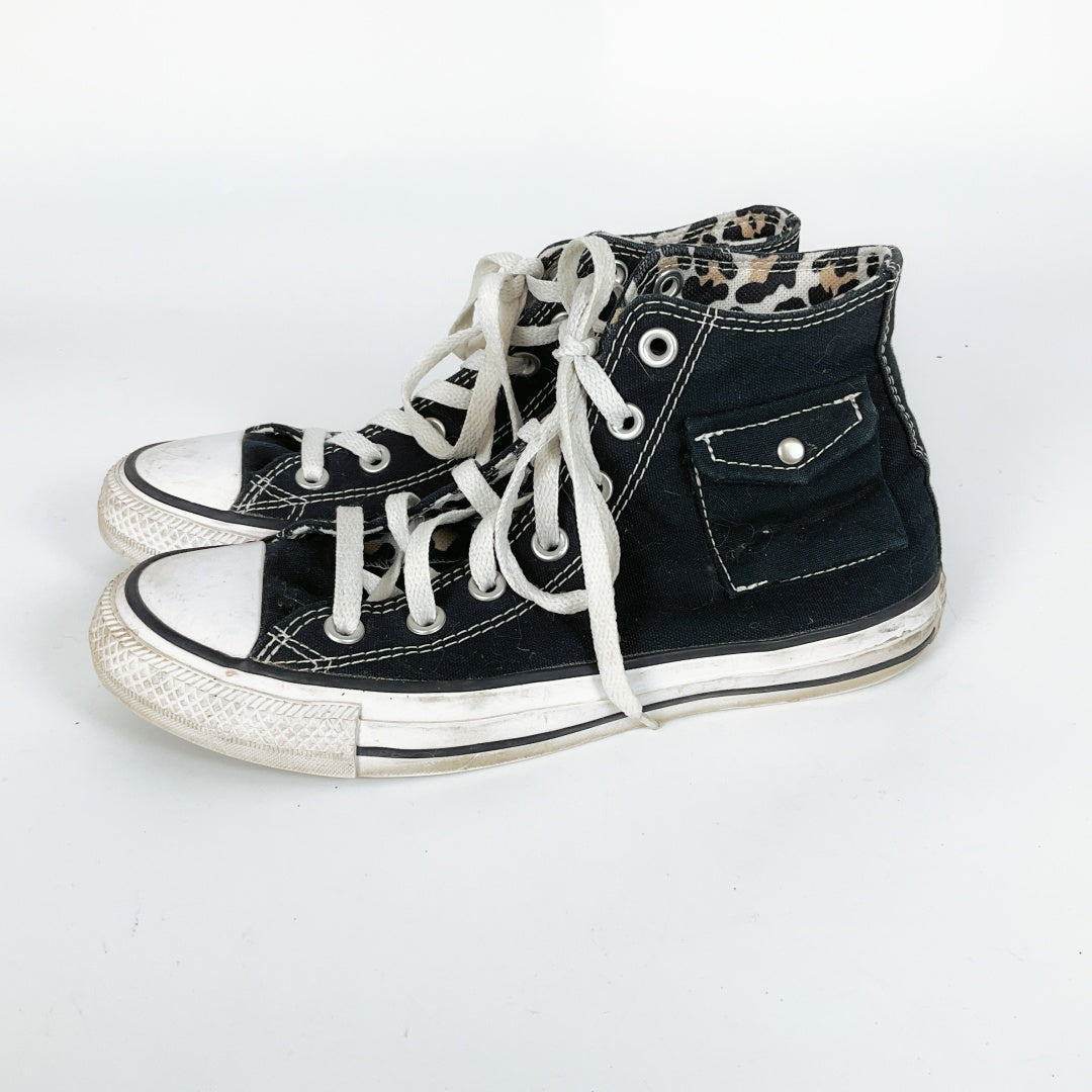 Black high tops with small pockets on the outside ankles, and cheetah print lining.Β