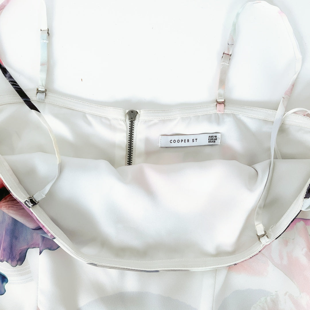 Beautiful off-shoulder top in white and pastel shades. Straps are removable. Top has a full zip closure at the back.Ā