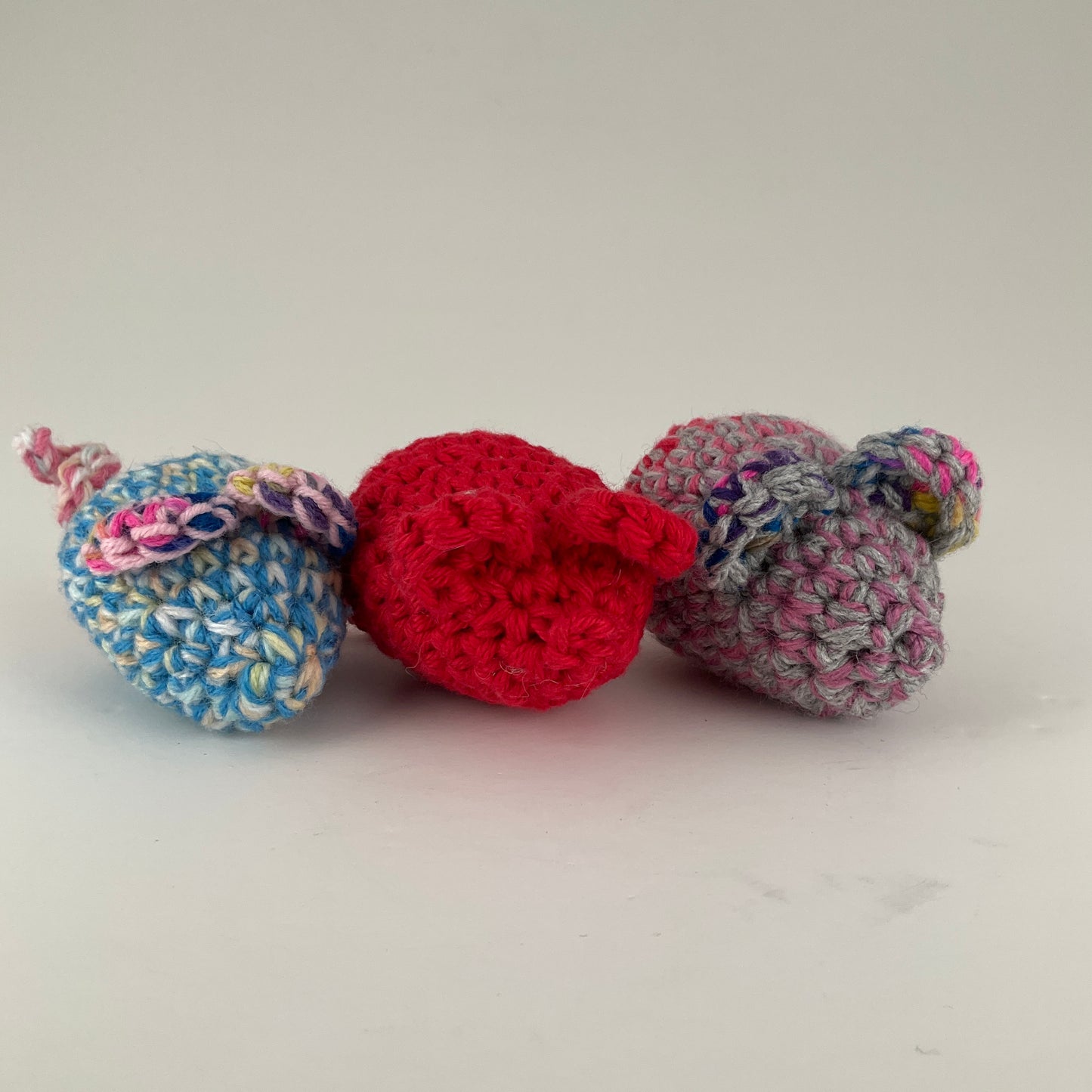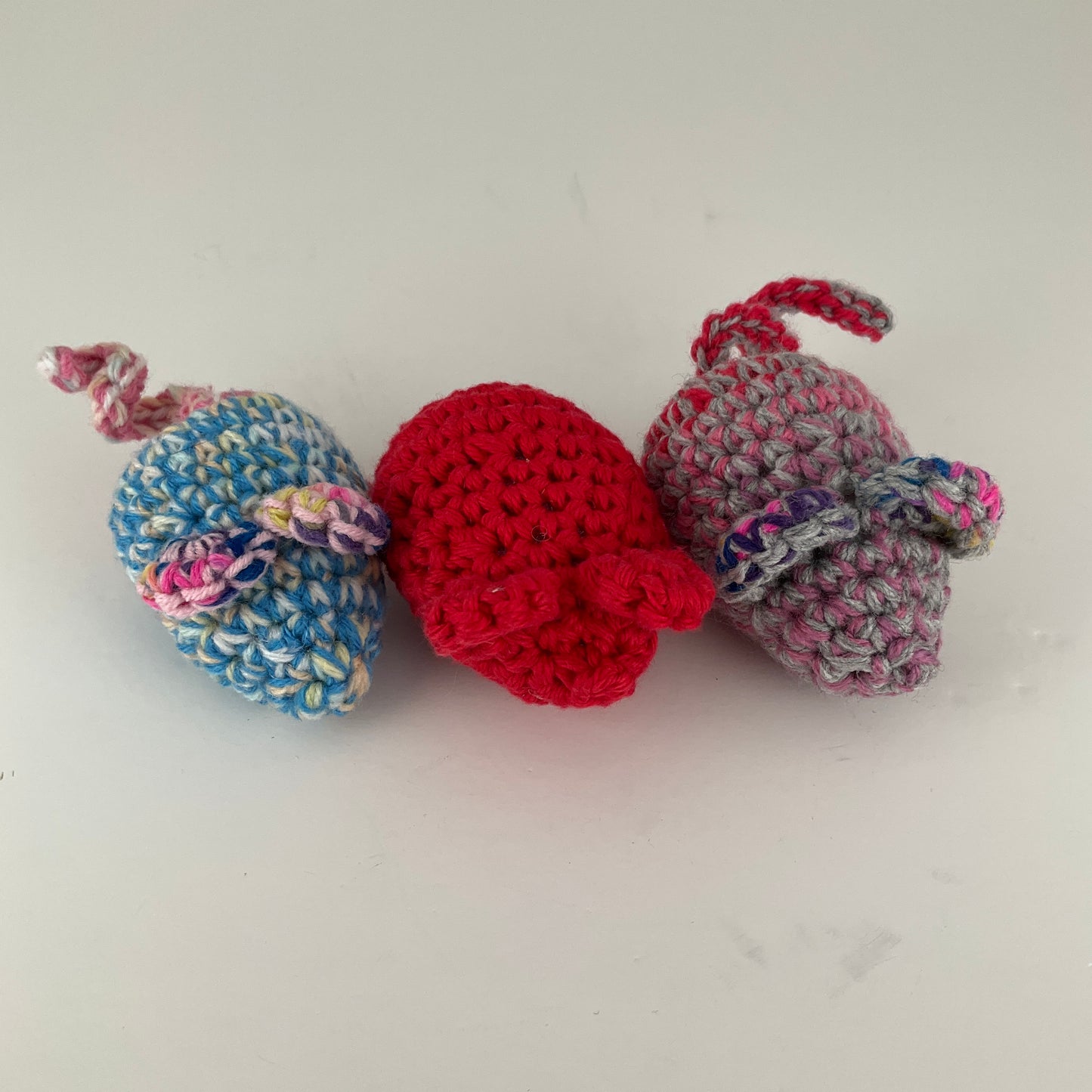 Set of 3 handknitted mice. The perfect gift for your beloved pet to keep them entertained for hours. Each mouse is unique and a one off. Kindly knitted by one of our wonderful volunteers.
