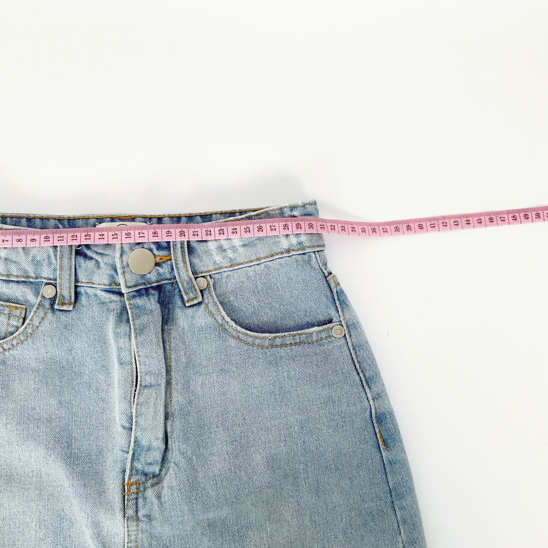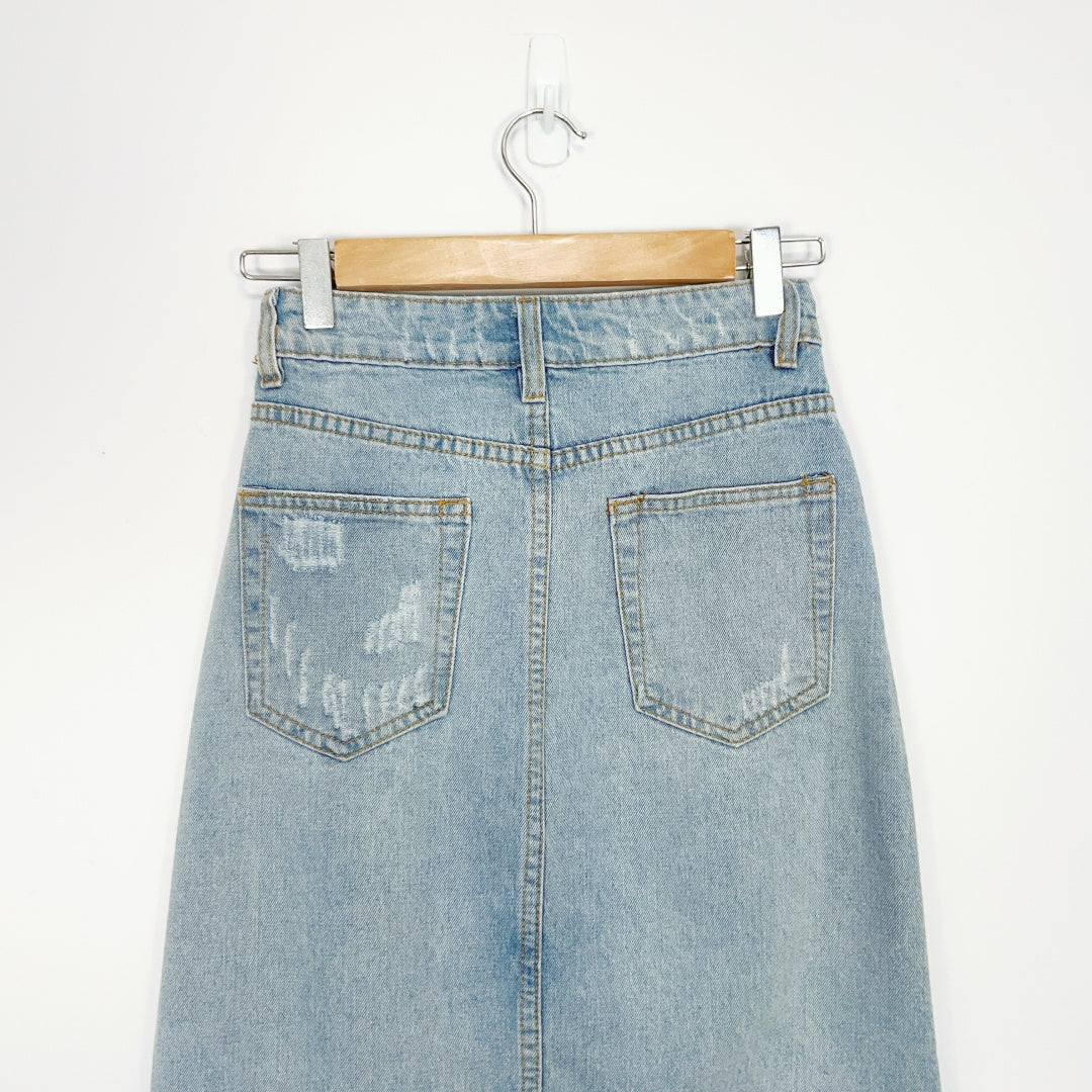 Denim midi skirt with front and back pockets, distressed hem, and front split measuring 14cm.