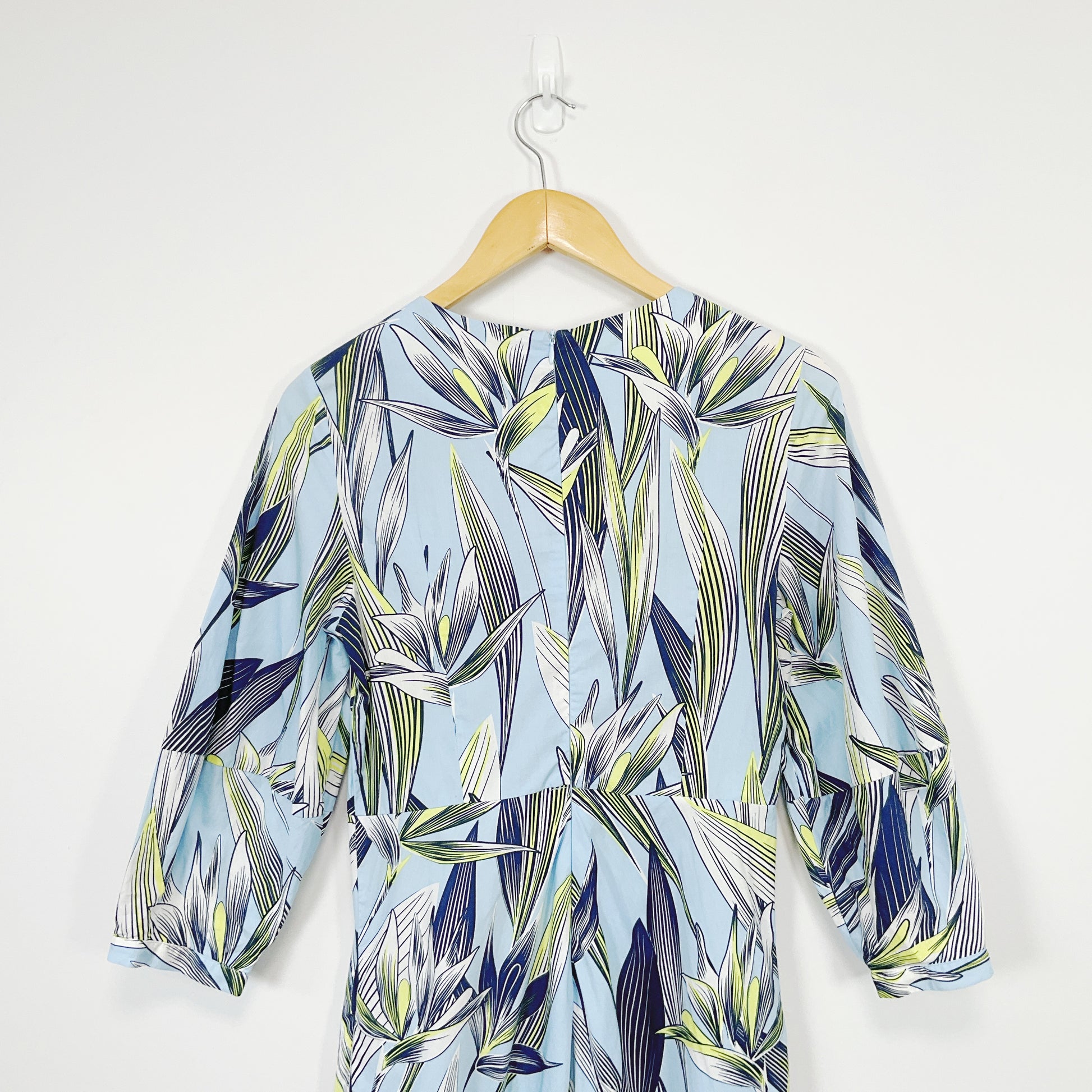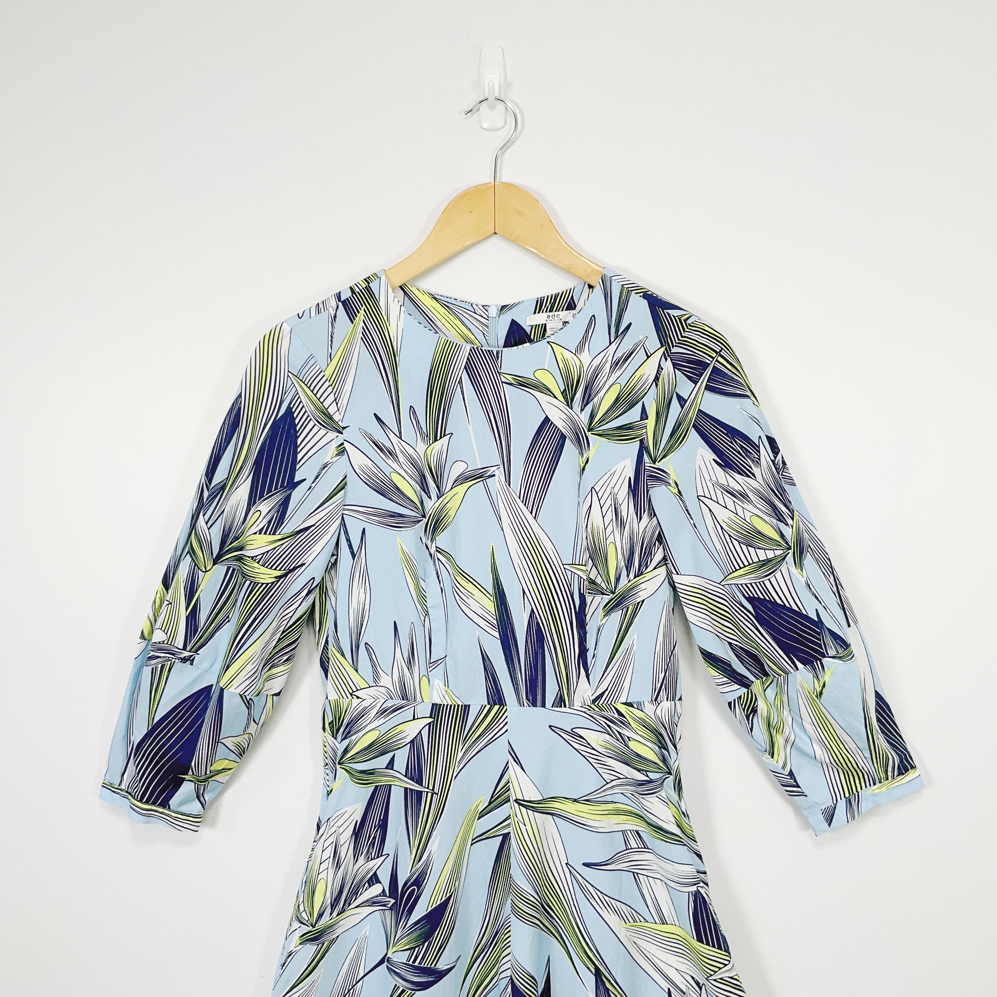 This stunning mid-length dress features a vibrant tropical leaf print on a soft blue background, with a flattering fit-and-flare silhouette. The 3/4 sleeves and lightweight fabric make it perfect for spring and summer occasions.