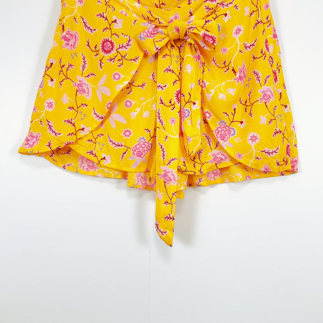 Yellow floral wrap shorts made from a lightweight, flowy fabric. It features an all-over print of pink and red flowers with green stems and leaves, and a self-tie bow at the front that adds a feminine touch. The shorts have a ruffled hemline and a relaxed fit, giving them a breezy, summery look.