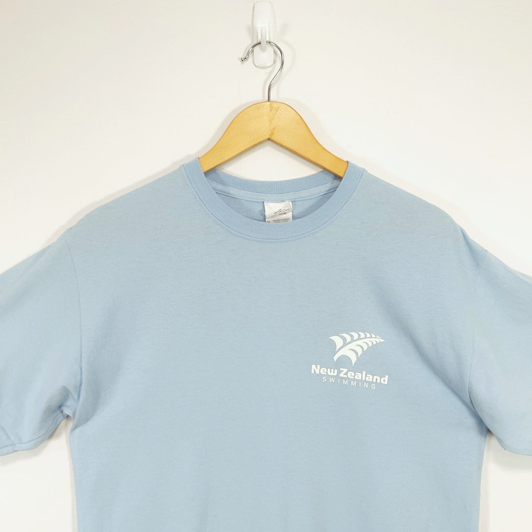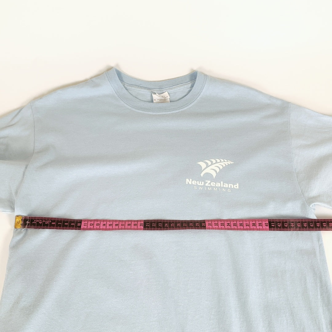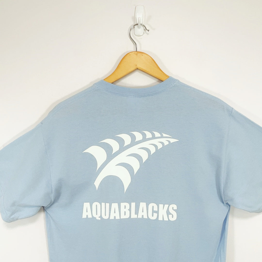 This Gildan Ultra Cotton (100% cotton) t-shirt in size M features a crisp white silver fern design on the back with “AQUABLACKS” printed below. It’s a classic Kiwi sports tee—lightweight yet durable, ideal for showing team pride.