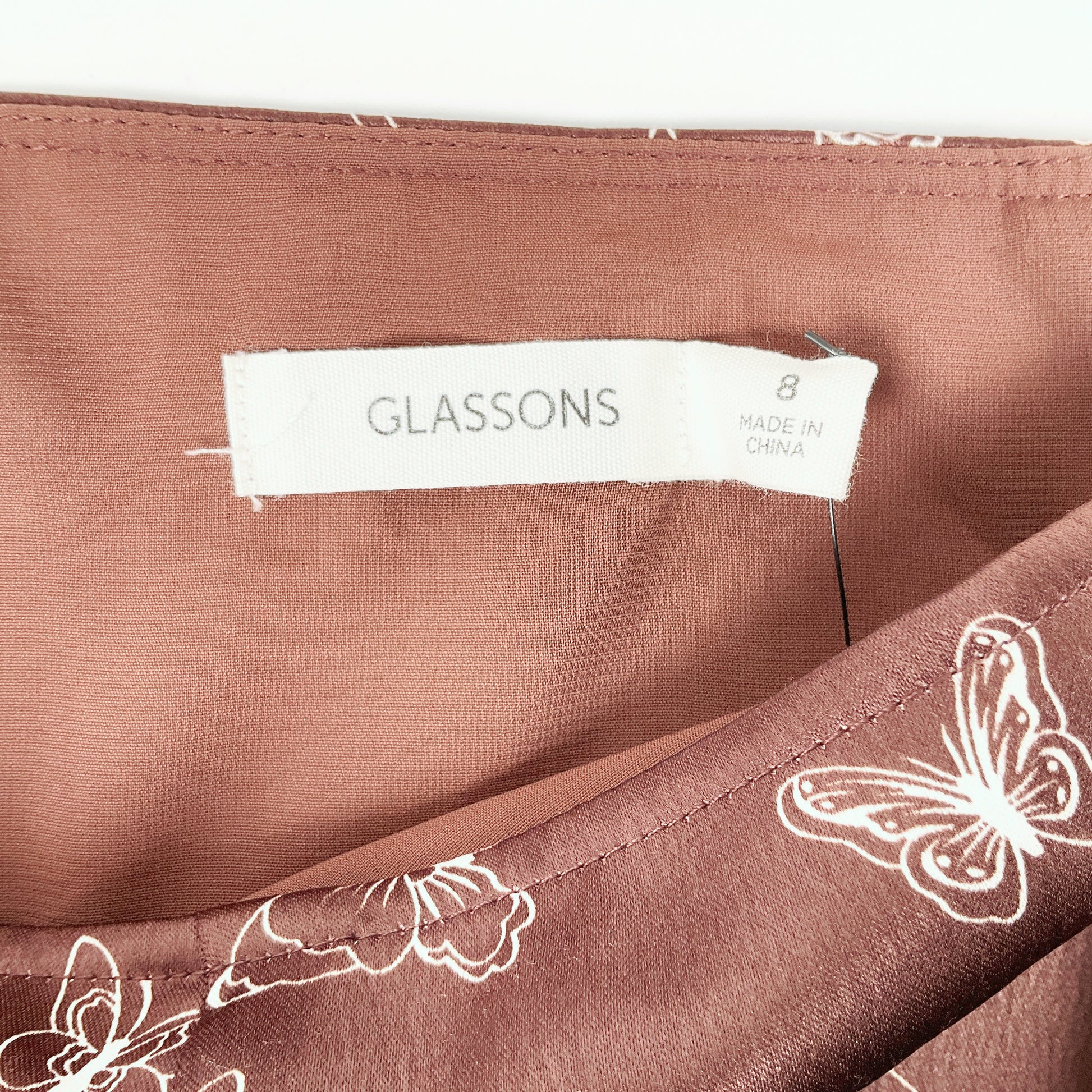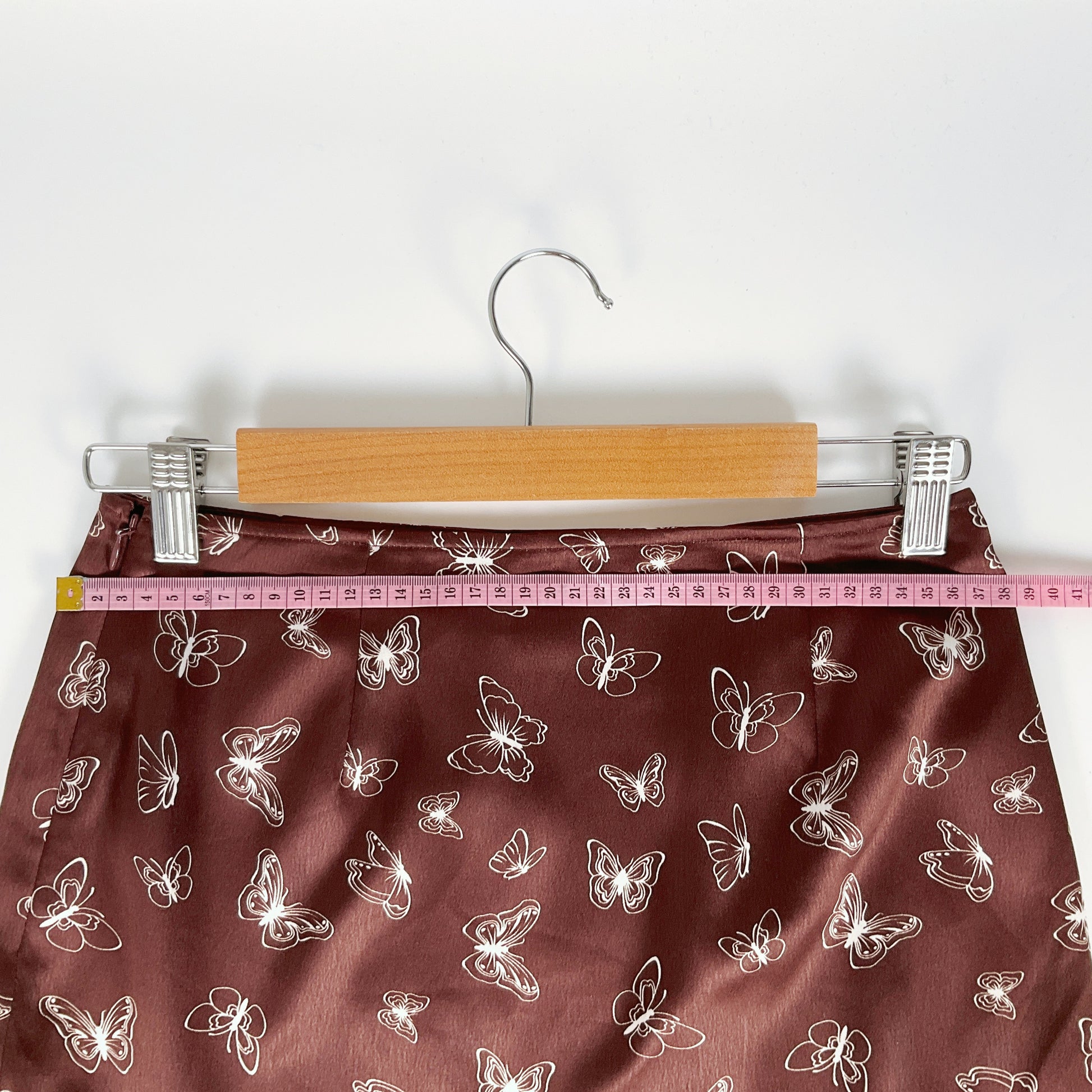 This skirt is a summer staple. It features a side zipper and a white butterfly pattern over a warm brown background.