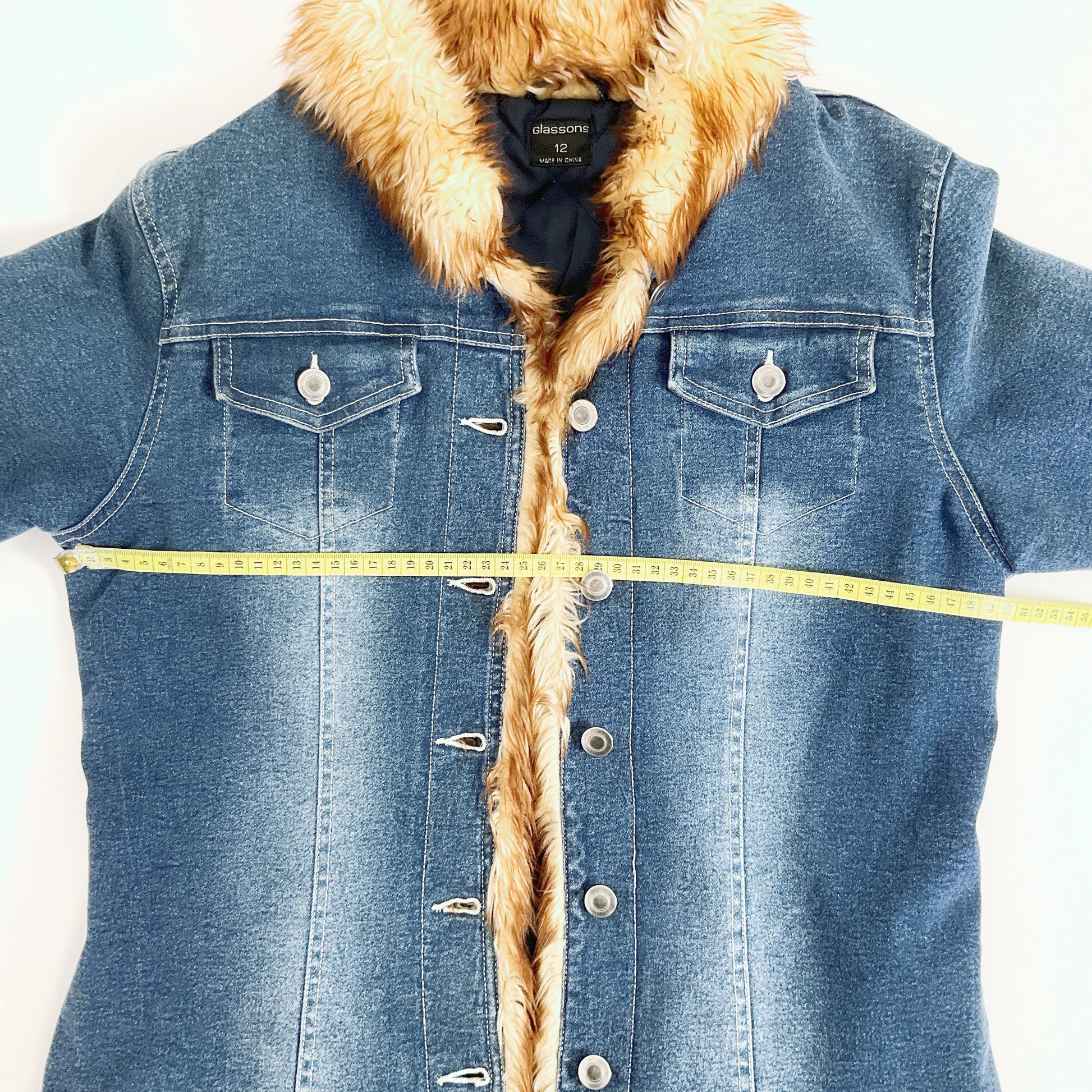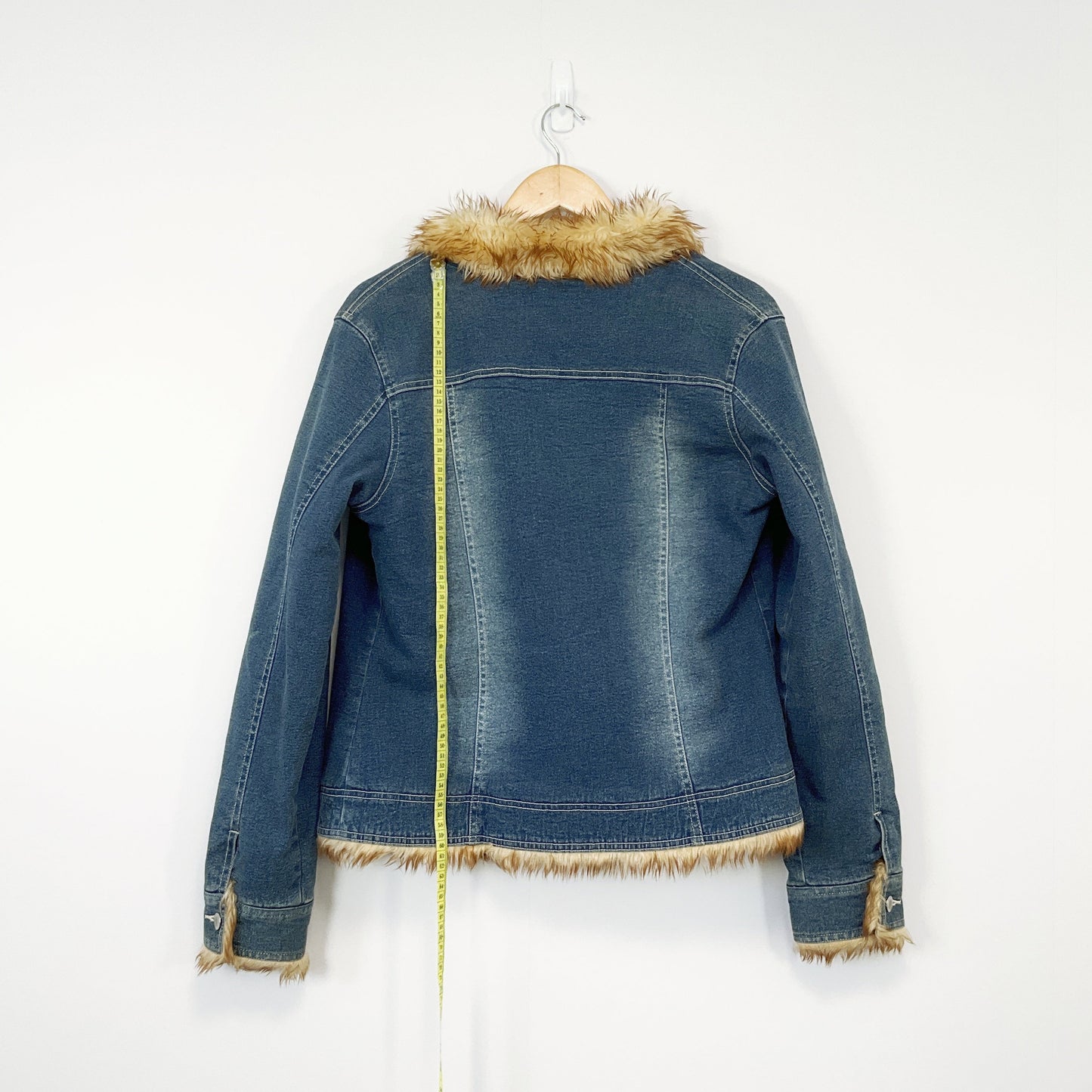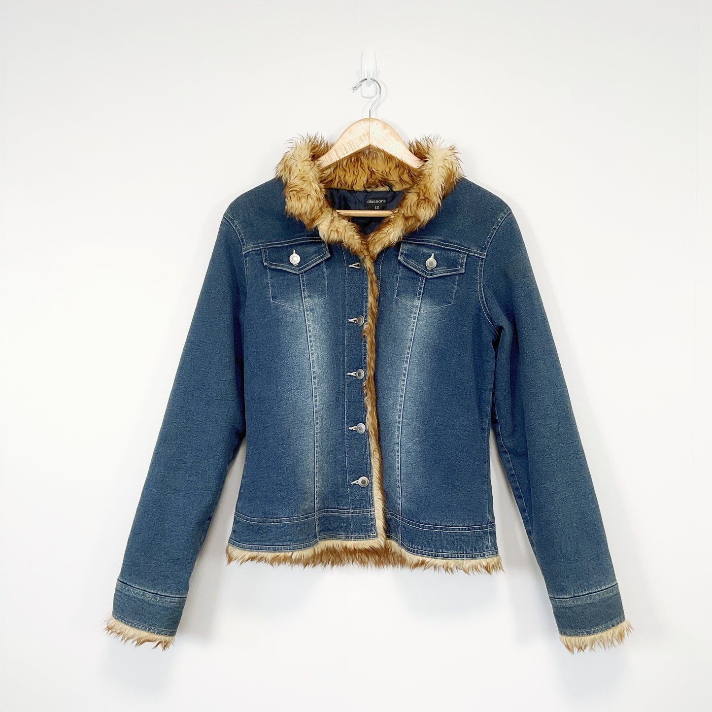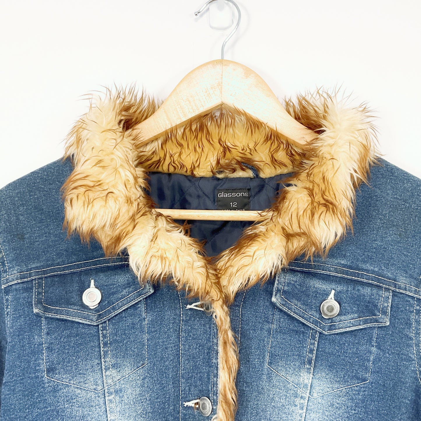 Denim Jacket with Faux Fur Trim in Navy is a stylish and versatile piece made from 100% cotton denim, offering durability and comfort. It features a removable faux fur trim along the collar, adding a touch of luxury and warmth, with lining and padding made from 100% polyester for extra coziness.