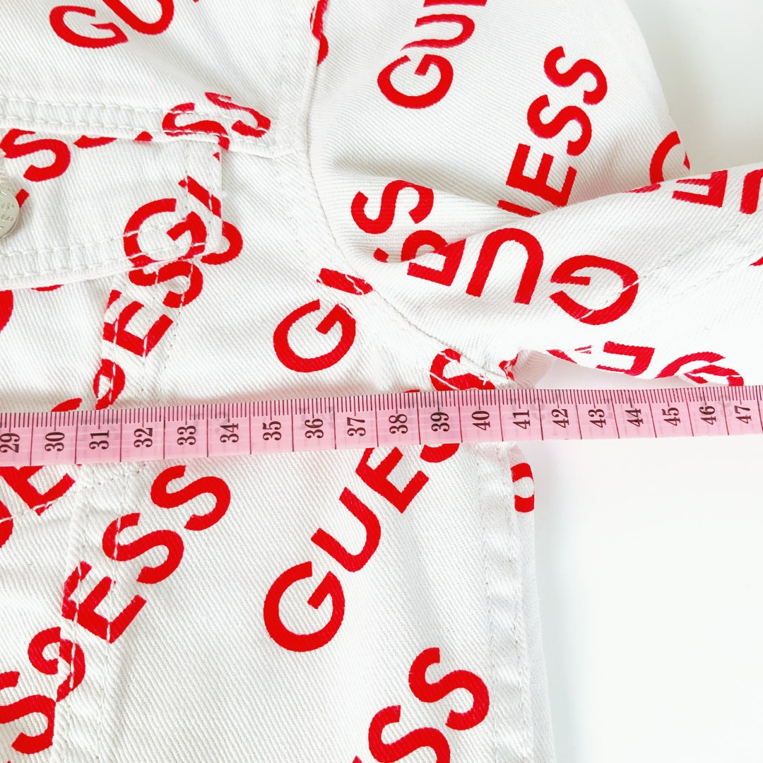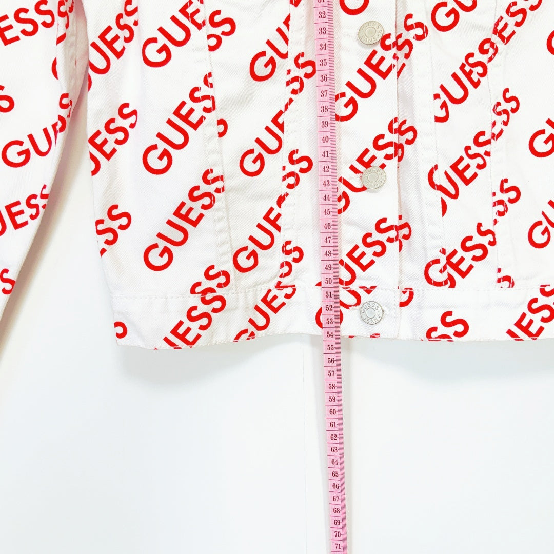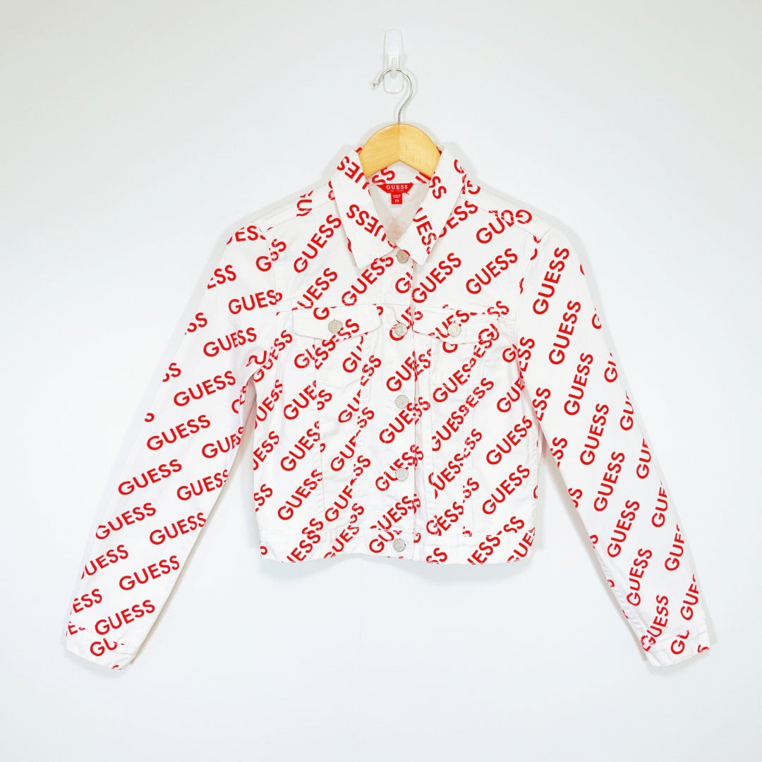 A fitted GUESS jacket featuring an all-over logo print. Made from soft cotton, this piece is great for casual outfits and pairs easily with jeans or skirts.