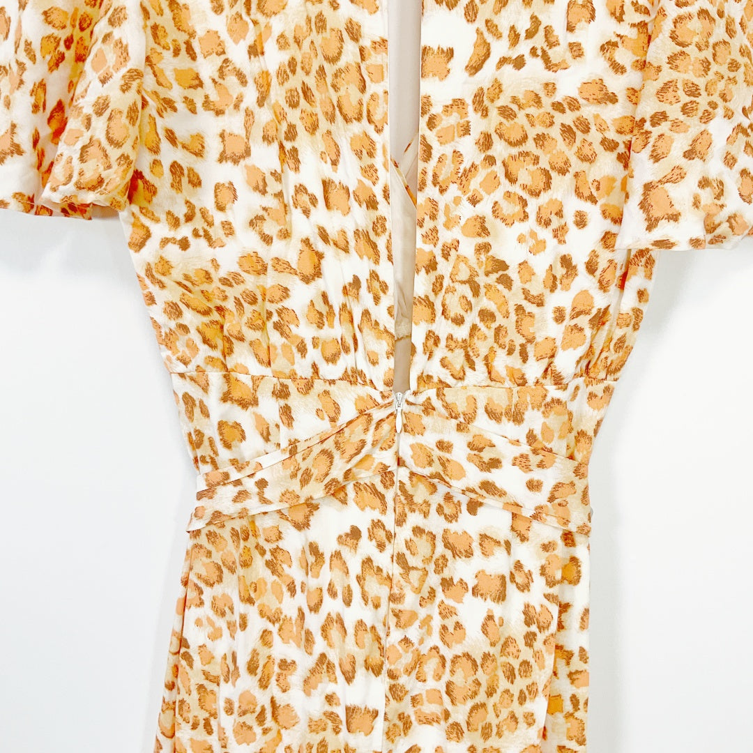 This dress from Here Comes The Sun features a chic tan-and-white leopard print and a flattering wrap-style bodice with flutter sleeves and an asymmetrical drop hem. Crafted in 100% rayon, it offers a soft, flowing drape perfect for both casual and semi-dressy occasions. Size 8 adds to its appeal for many wardrobes.