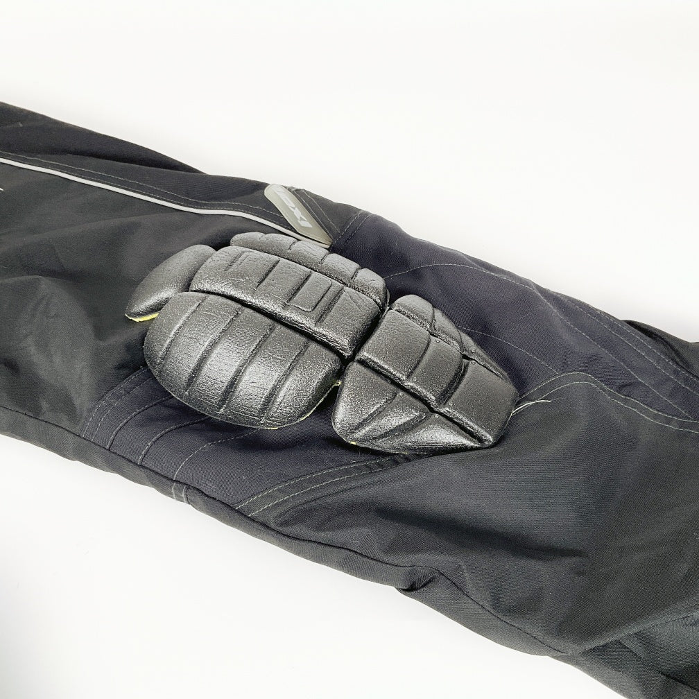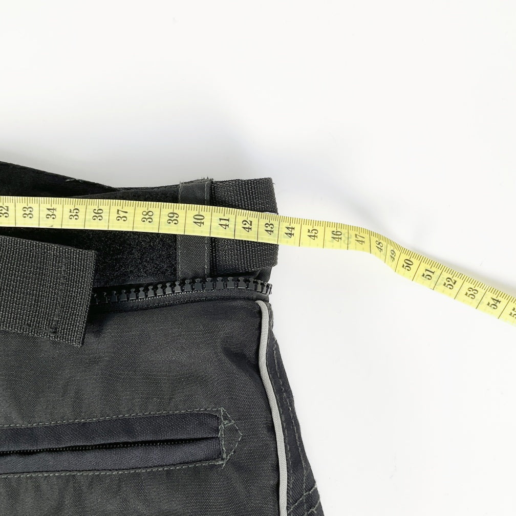 Rugged black touring motorcycle pants designed with contoured knee panels, sleek embroidered detailing, reflective side piping, and a secure high-waist Velcro closure for optimal comfort and protection during long rides.