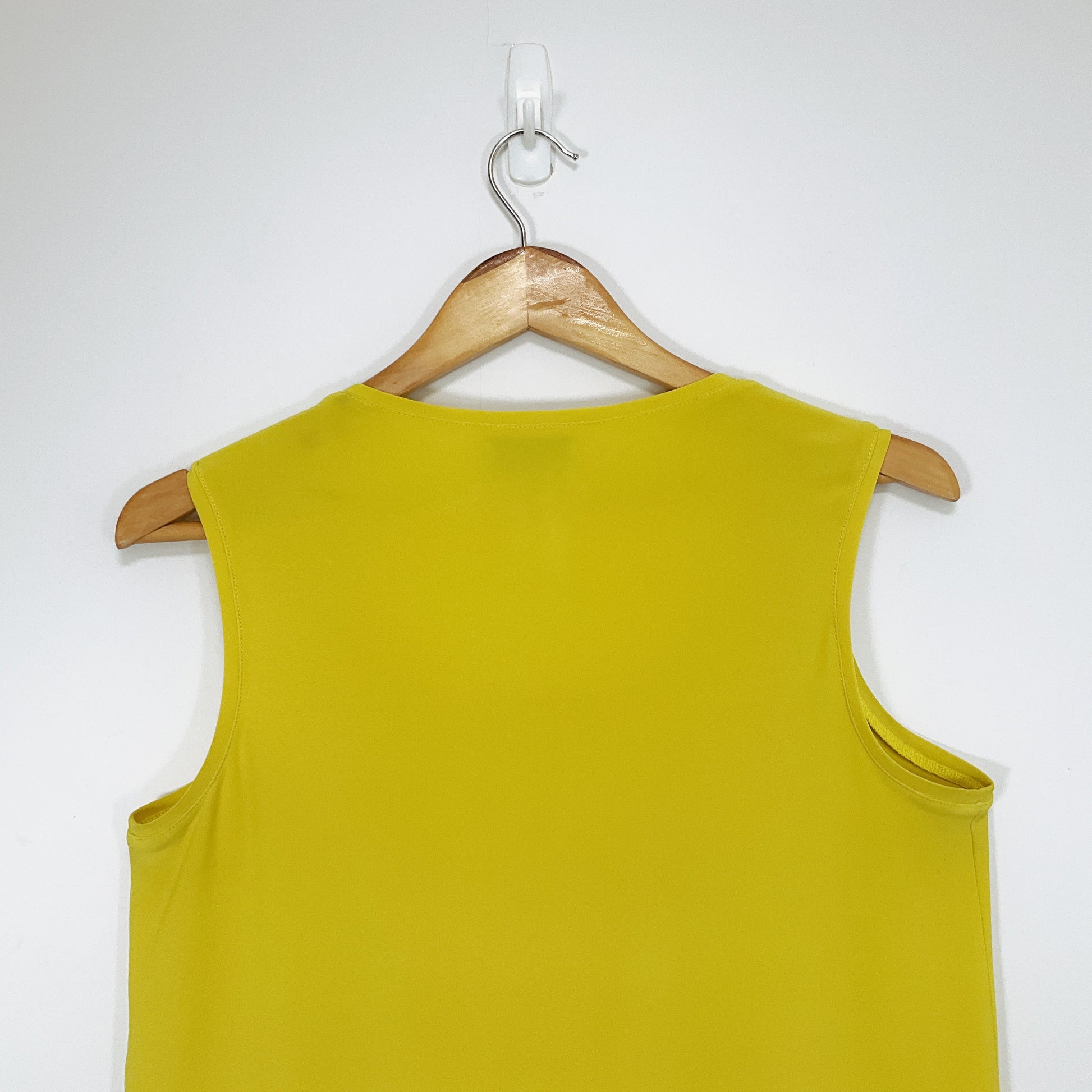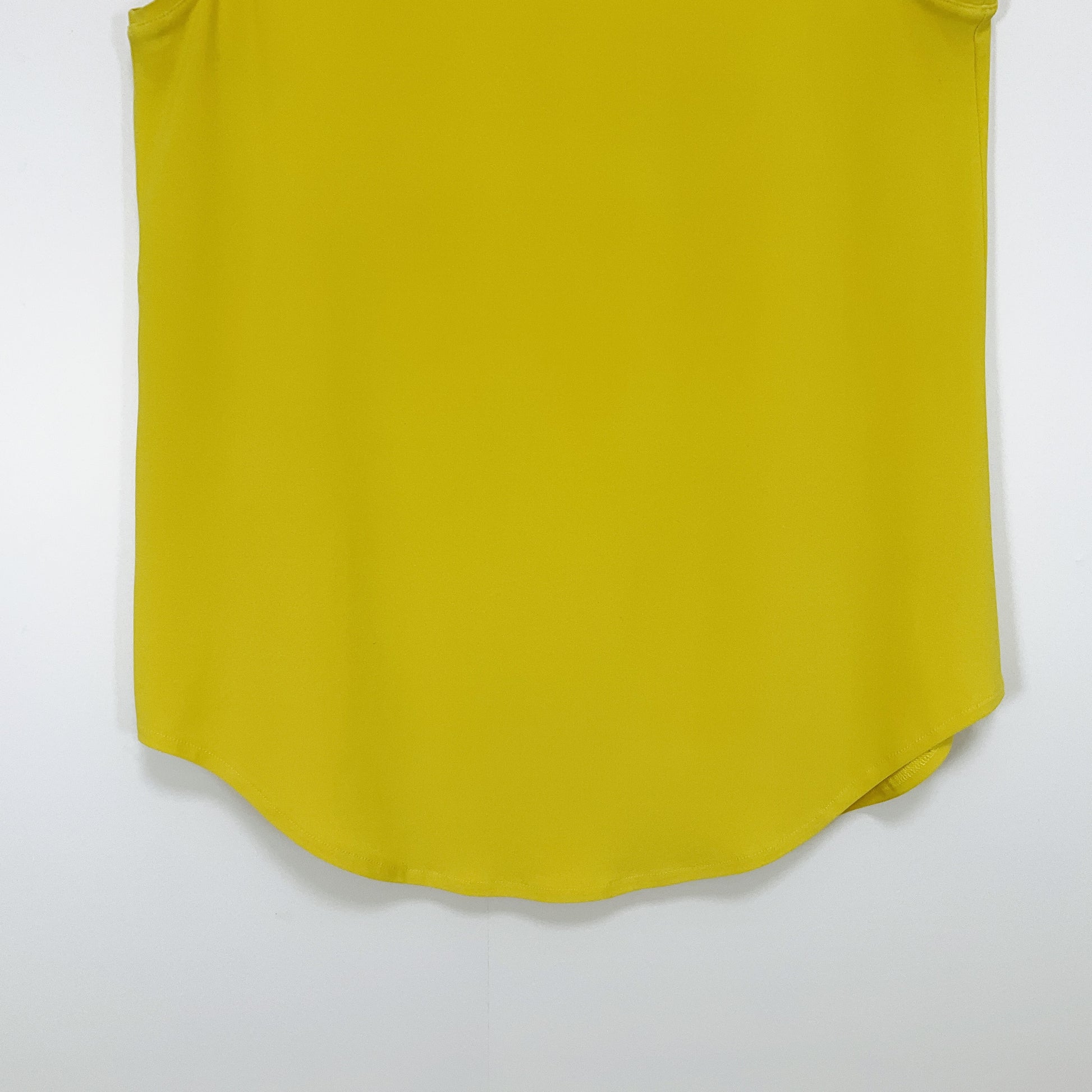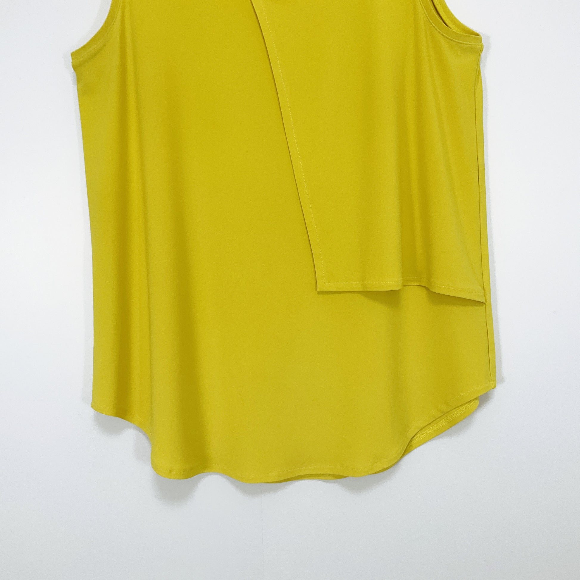 This vibrant yellow sleeveless top exudes effortless sophistication. Featuring a flattering drape and a minimalist design, it's perfect for layering or wearing on its own for a fresh, polished look. Ideal for both office wear and casual styling.