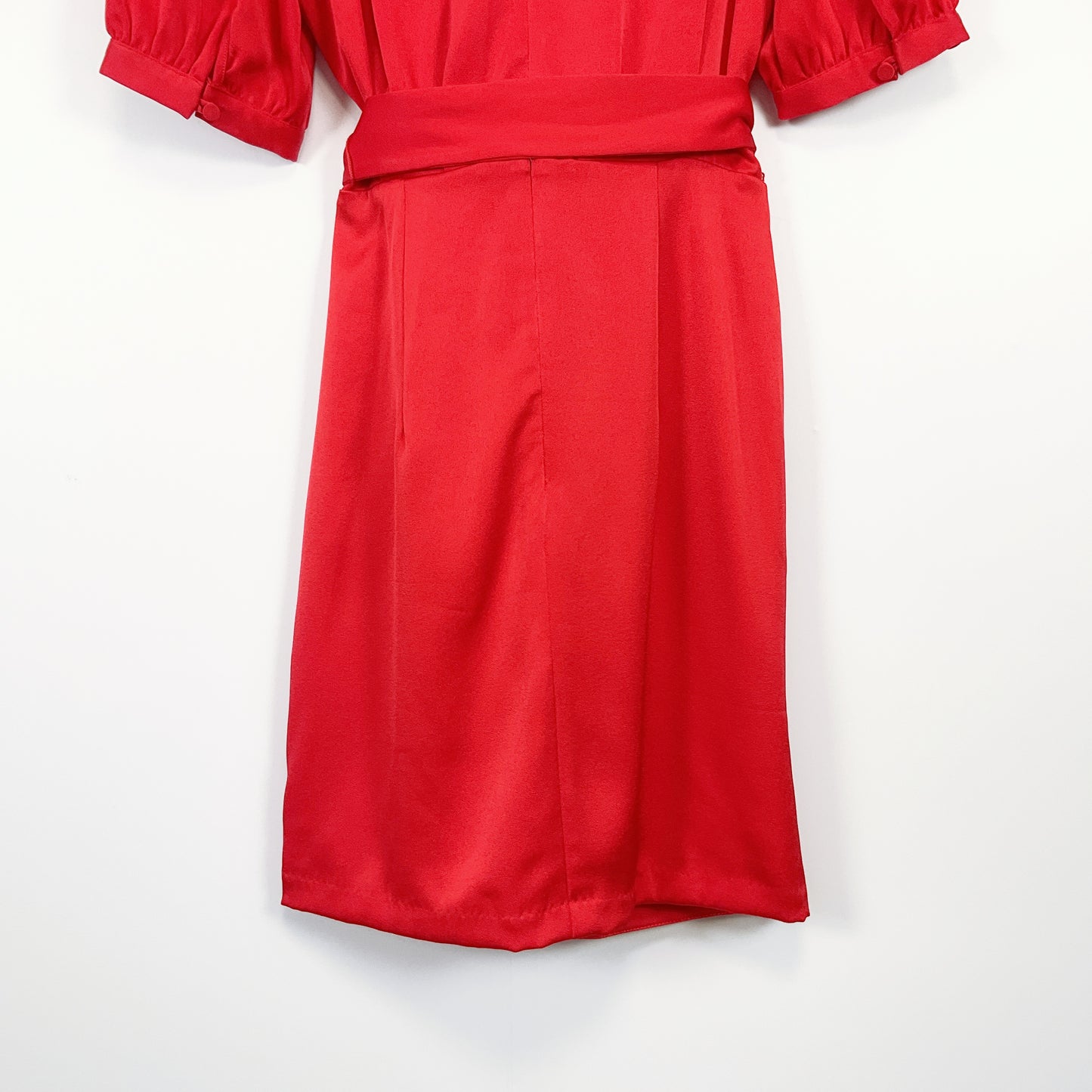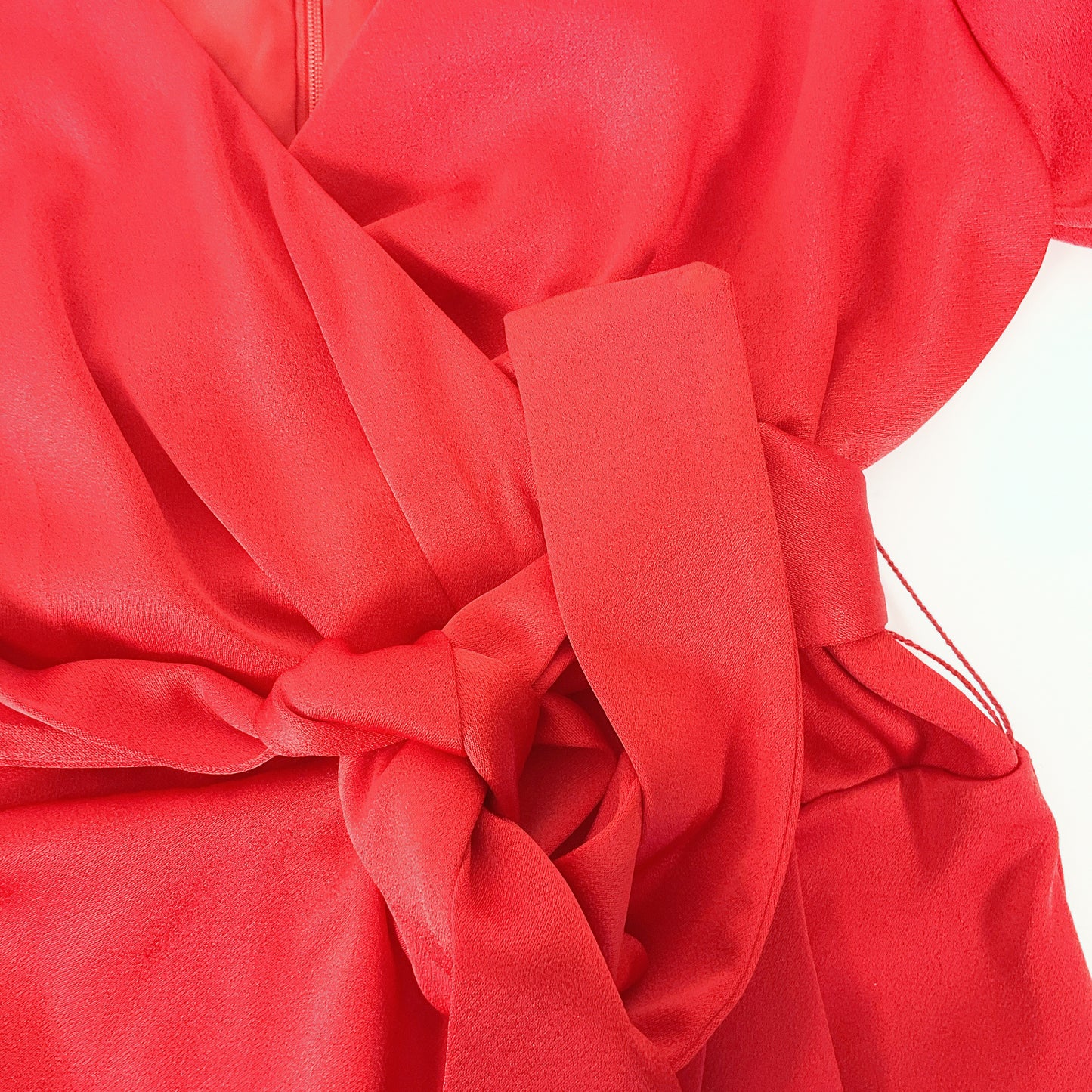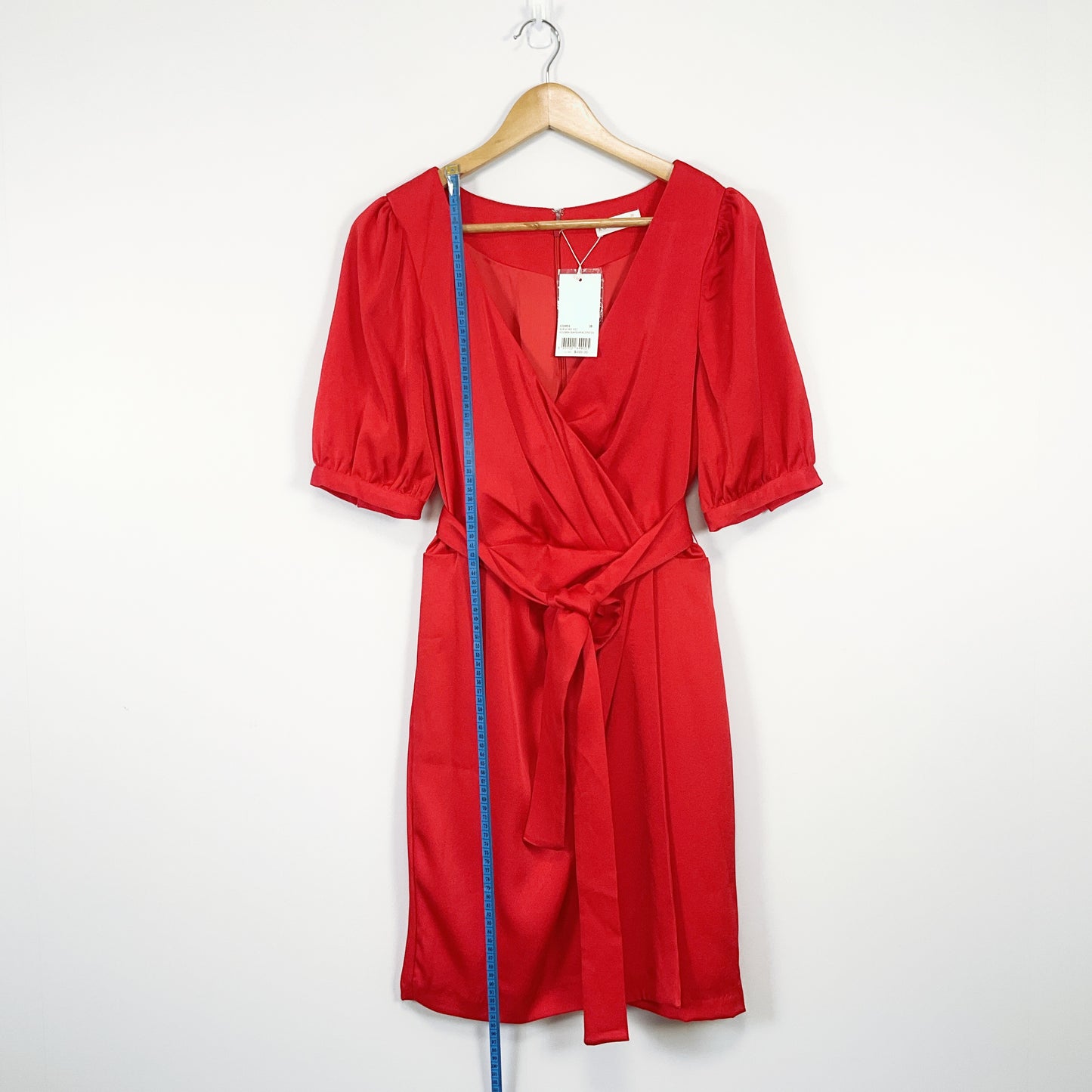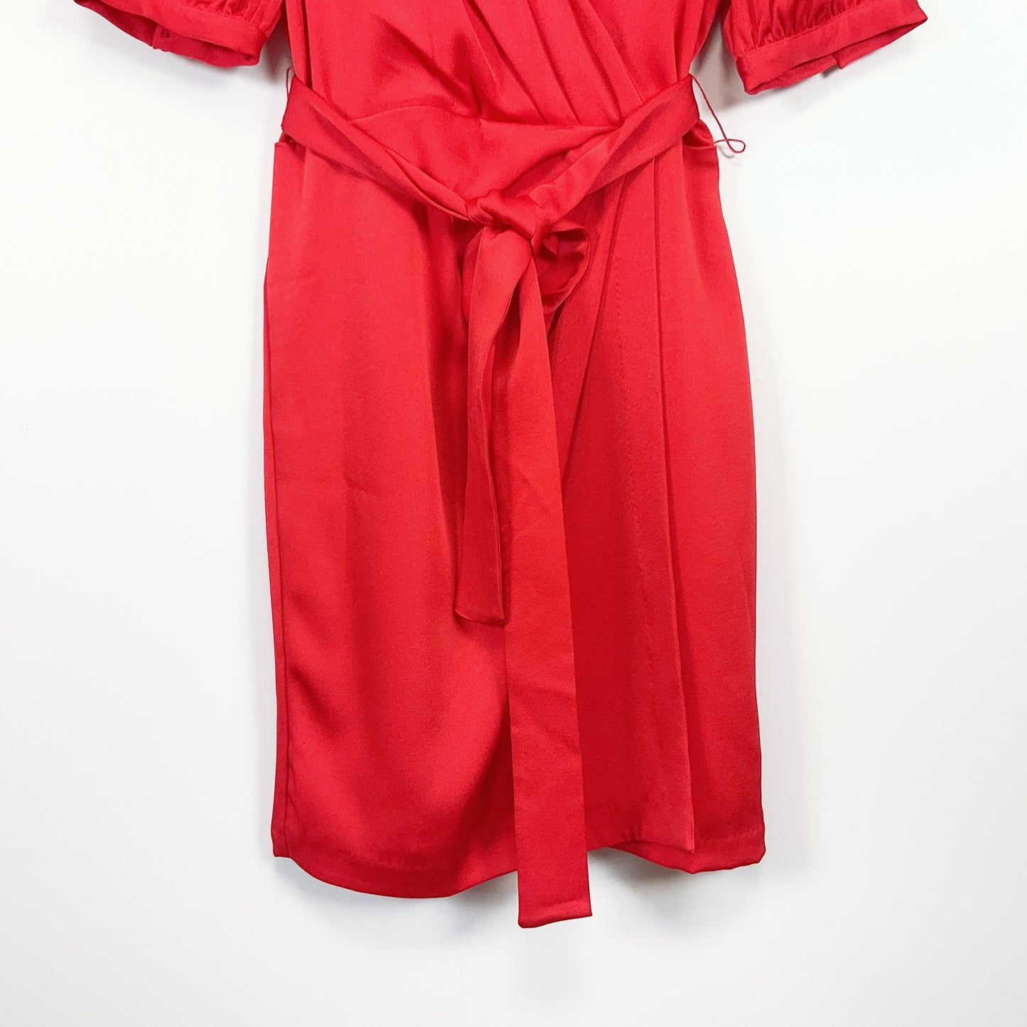 This red dress features a flattering wrap-style front, elegant V-neckline, and gathered puff sleeves for a chic, feminine silhouette. The tailored waistline and draped midi-length skirt make it perfect for evening events or parties.