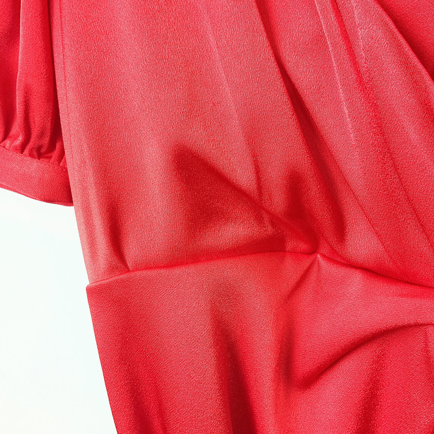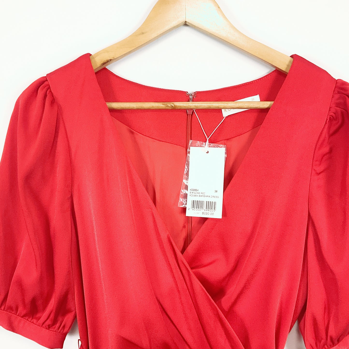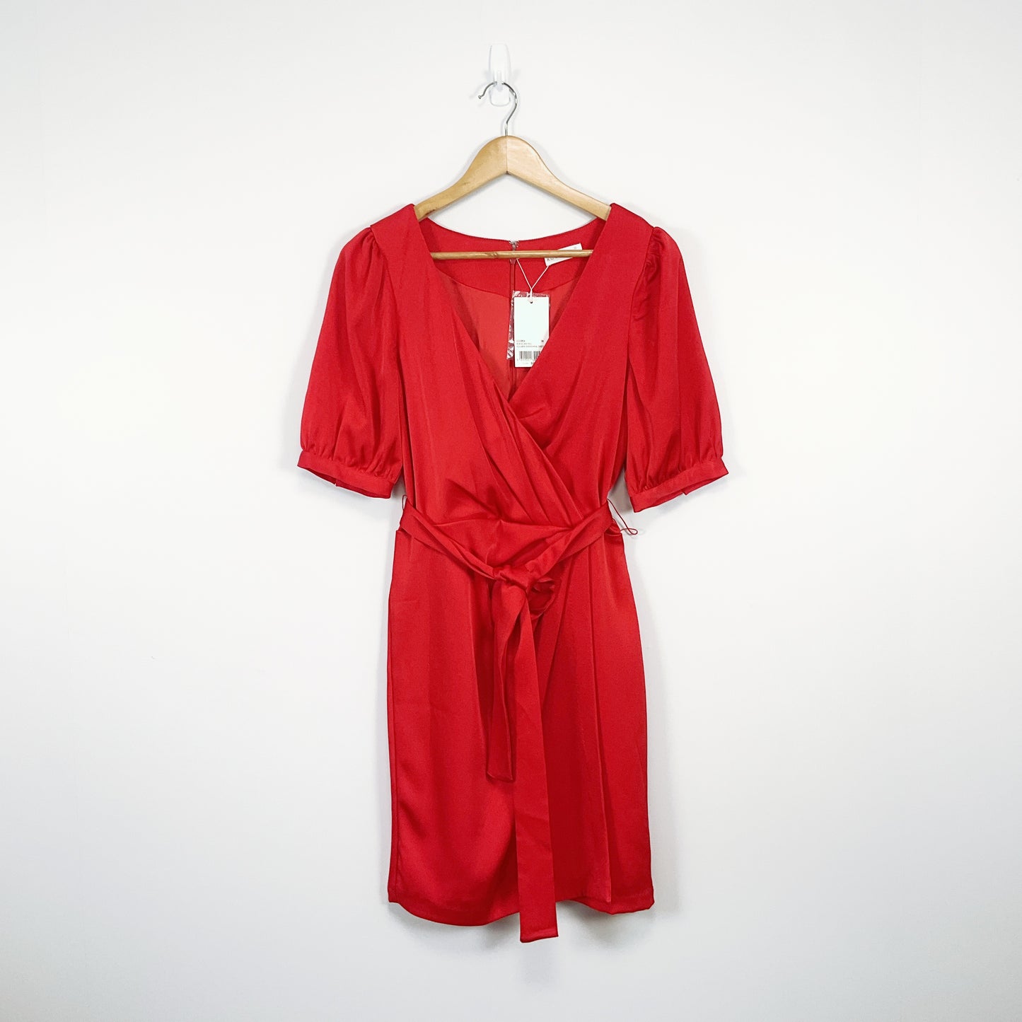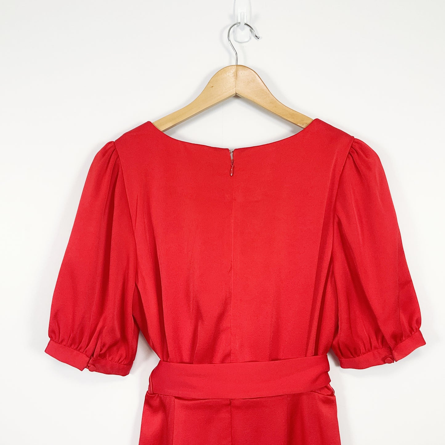 This red dress features a flattering wrap-style front, elegant V-neckline, and gathered puff sleeves for a chic, feminine silhouette. The tailored waistline and draped midi-length skirt make it perfect for evening events or parties.