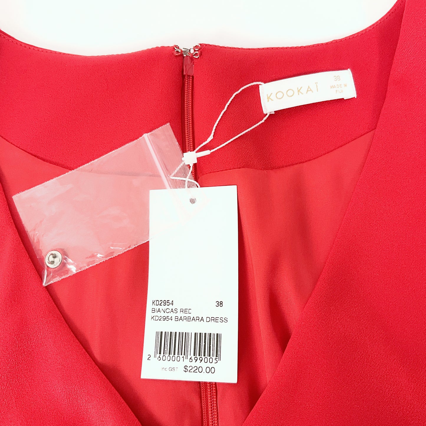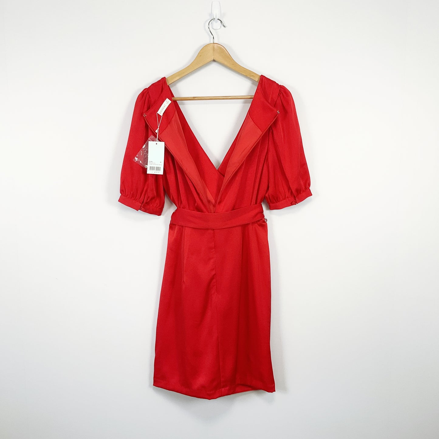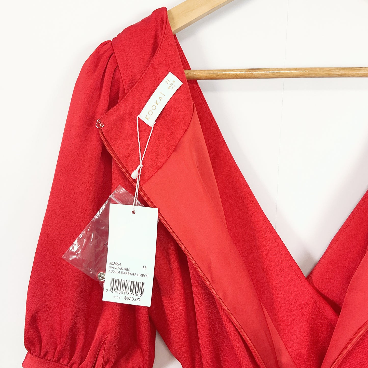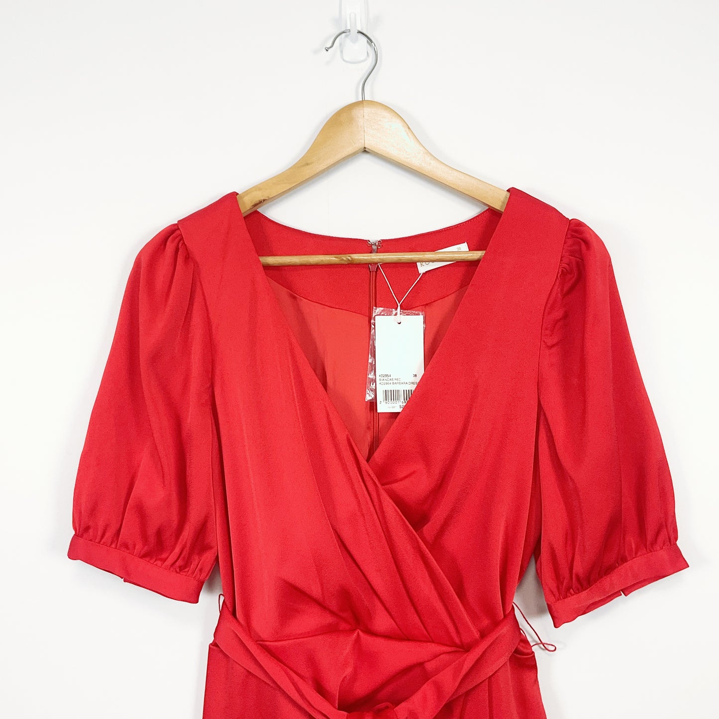 This red dress features a flattering wrap-style front, elegant V-neckline, and gathered puff sleeves for a chic, feminine silhouette. The tailored waistline and draped midi-length skirt make it perfect for evening events or parties.