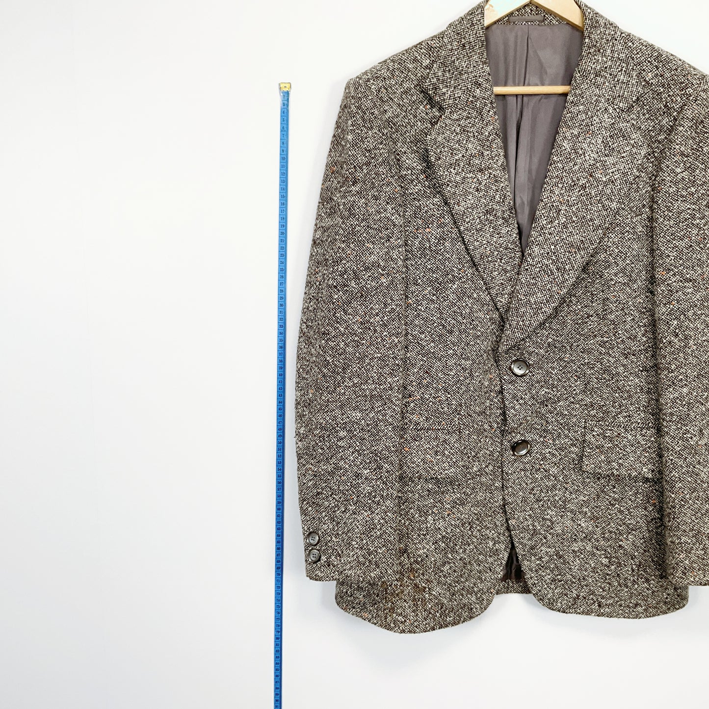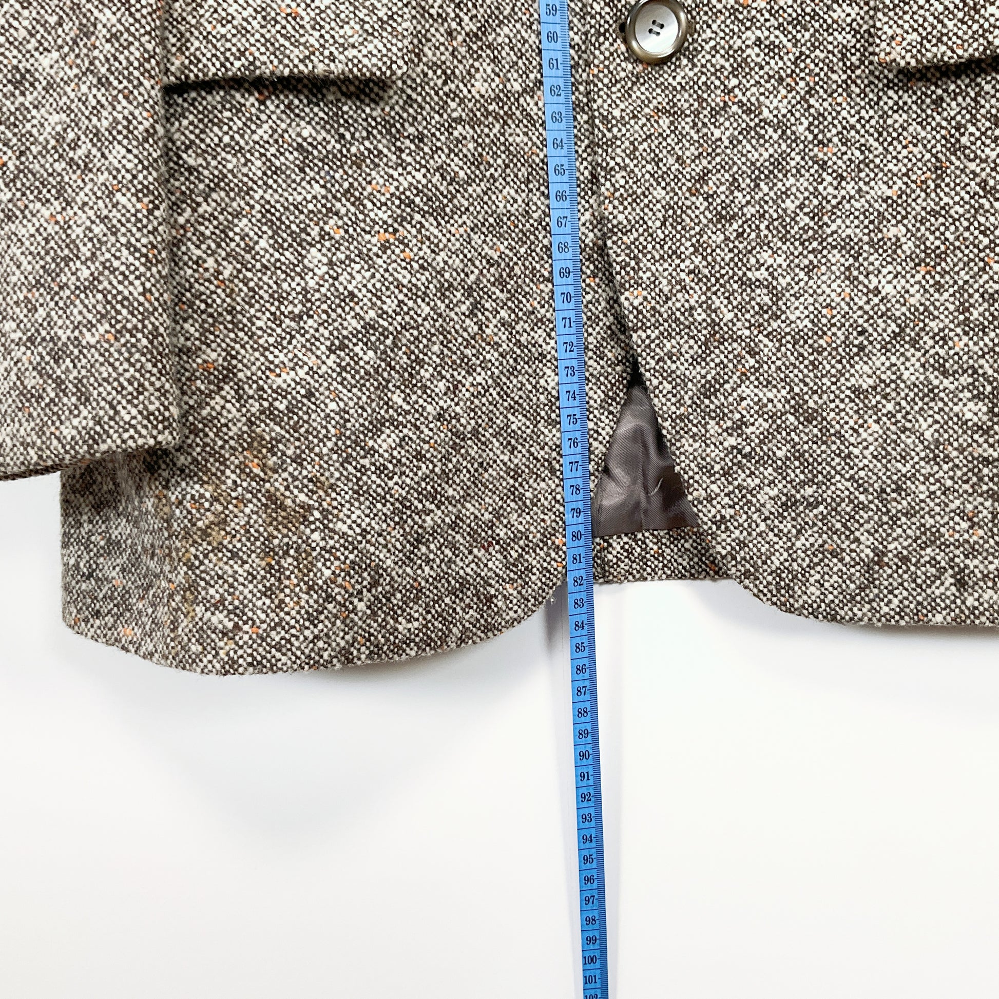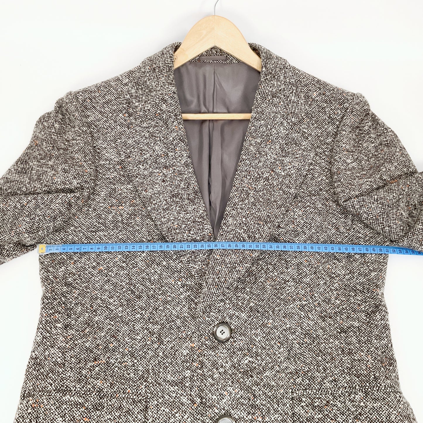This Men's Vintage Tweed Blazer features a classic herringbone pattern with subtle flecks of colour, giving it a timeless and sophisticated look. It has a structured fit with wide lapels, a single-breasted front, and two flap pockets, making it ideal for both formal and casual occasions.