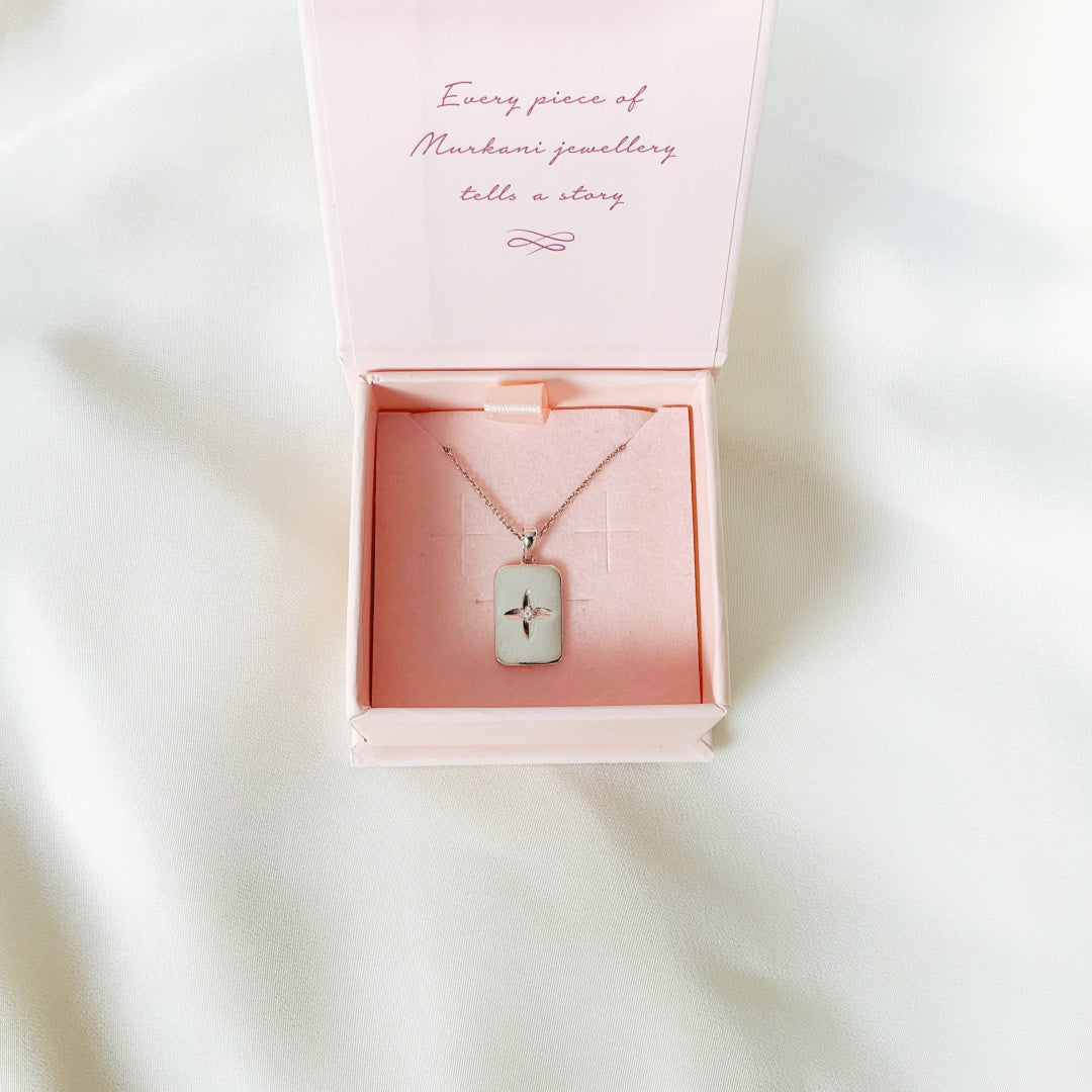 Murkani 'Desert Flower Rectangle Necklace' made with 925 silver. The pendent holds a White Topaz stone, that reflects and shines as the sunlight light hits it. Necklace has three size options, allowing you to style the necklace to wear on its own as a statement piece or work together with other jewelry as a layering piece. Gorgeous jewelry piece that would make a great give to yourself for a hard working year, or a present someone special to help celebrate then.Ā