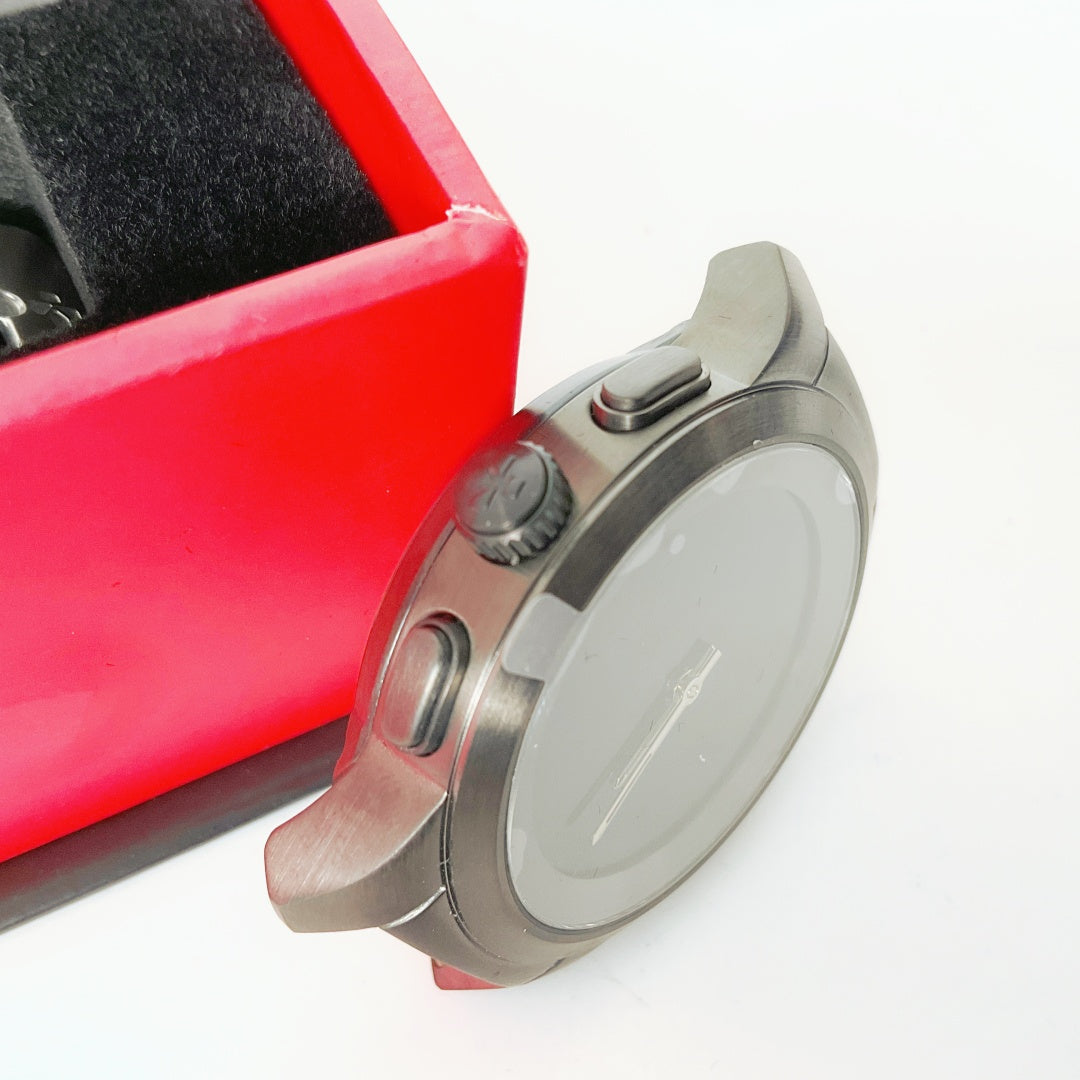 Brand new in original box and unused. This Kickstarter edition hybrid smartwatch comes in original packaging with magnetic charging dock, Β two straps( nylon and textured black with orange stitching). Combines classic mechanical hands with touchscreen display.
