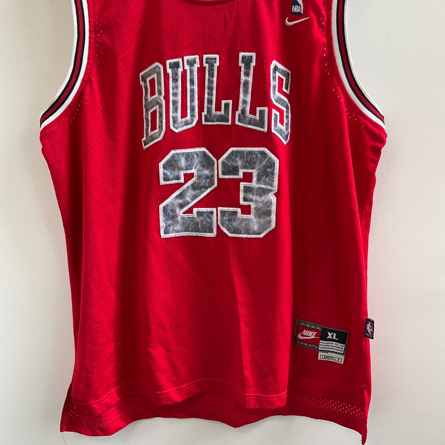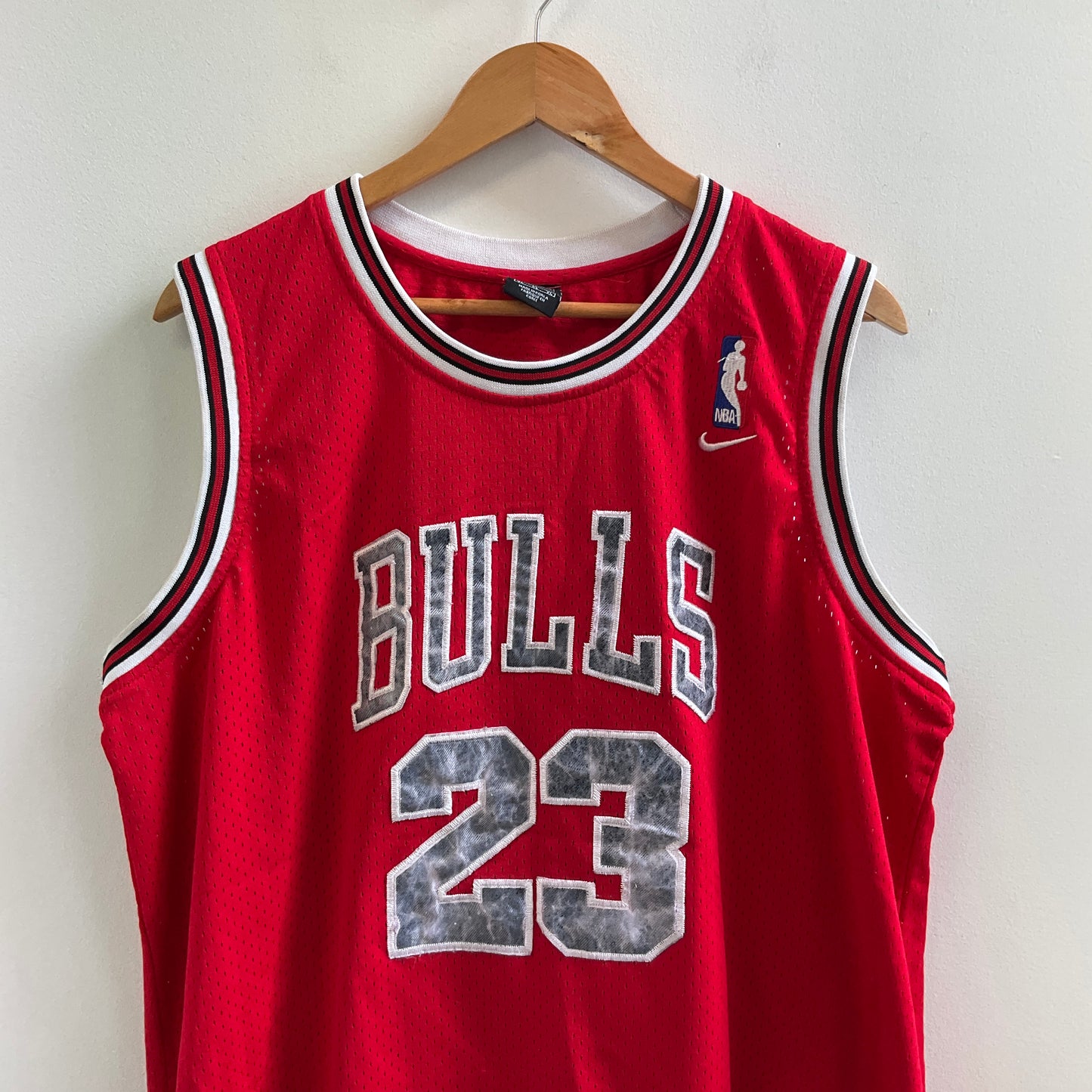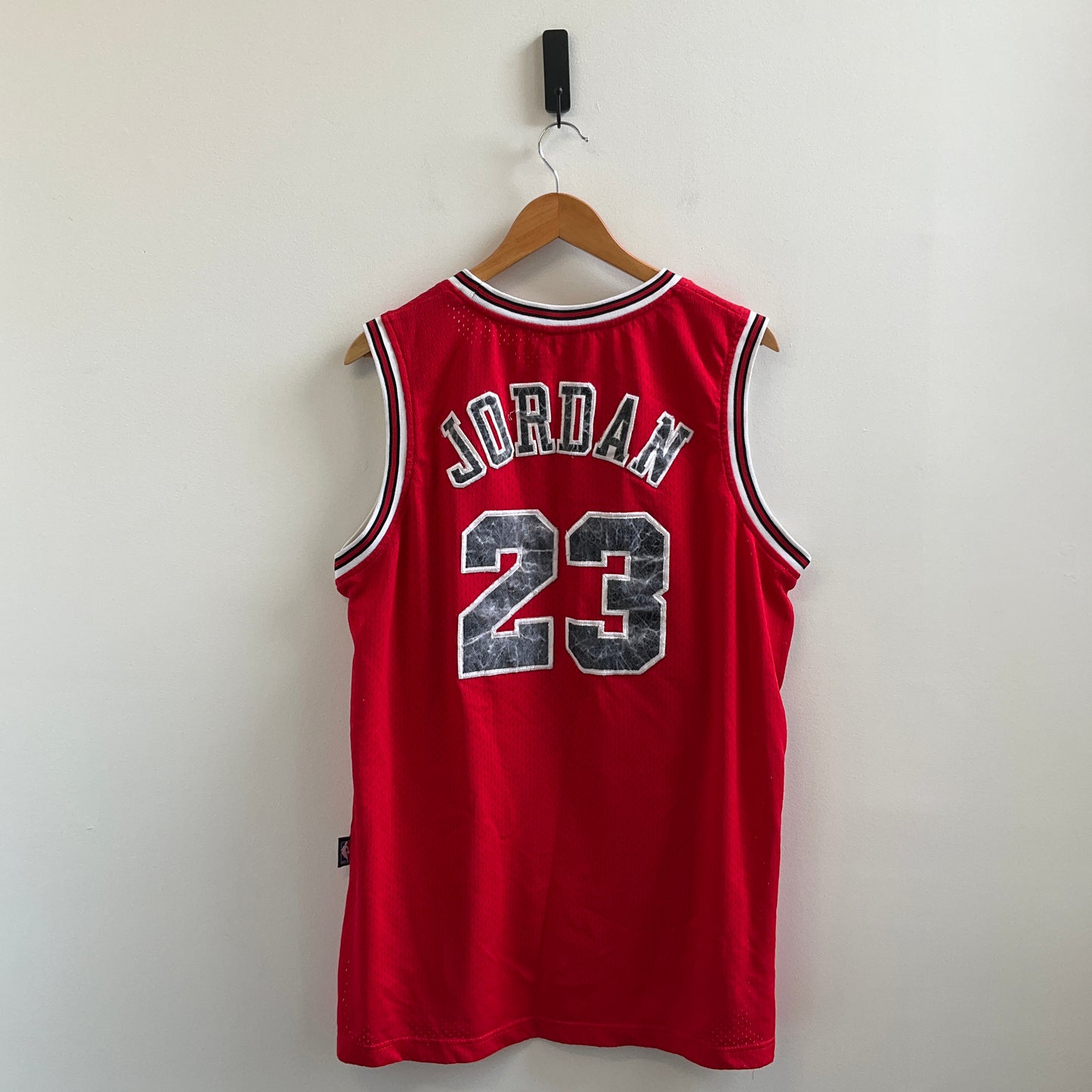 Chicago Bulls "Jordan" #23 Basketball Jersey by Nike. Features an acid wash style lettering. The underarm has a ripped seam. Stitching on front number starting to pull away slightly on the edge.