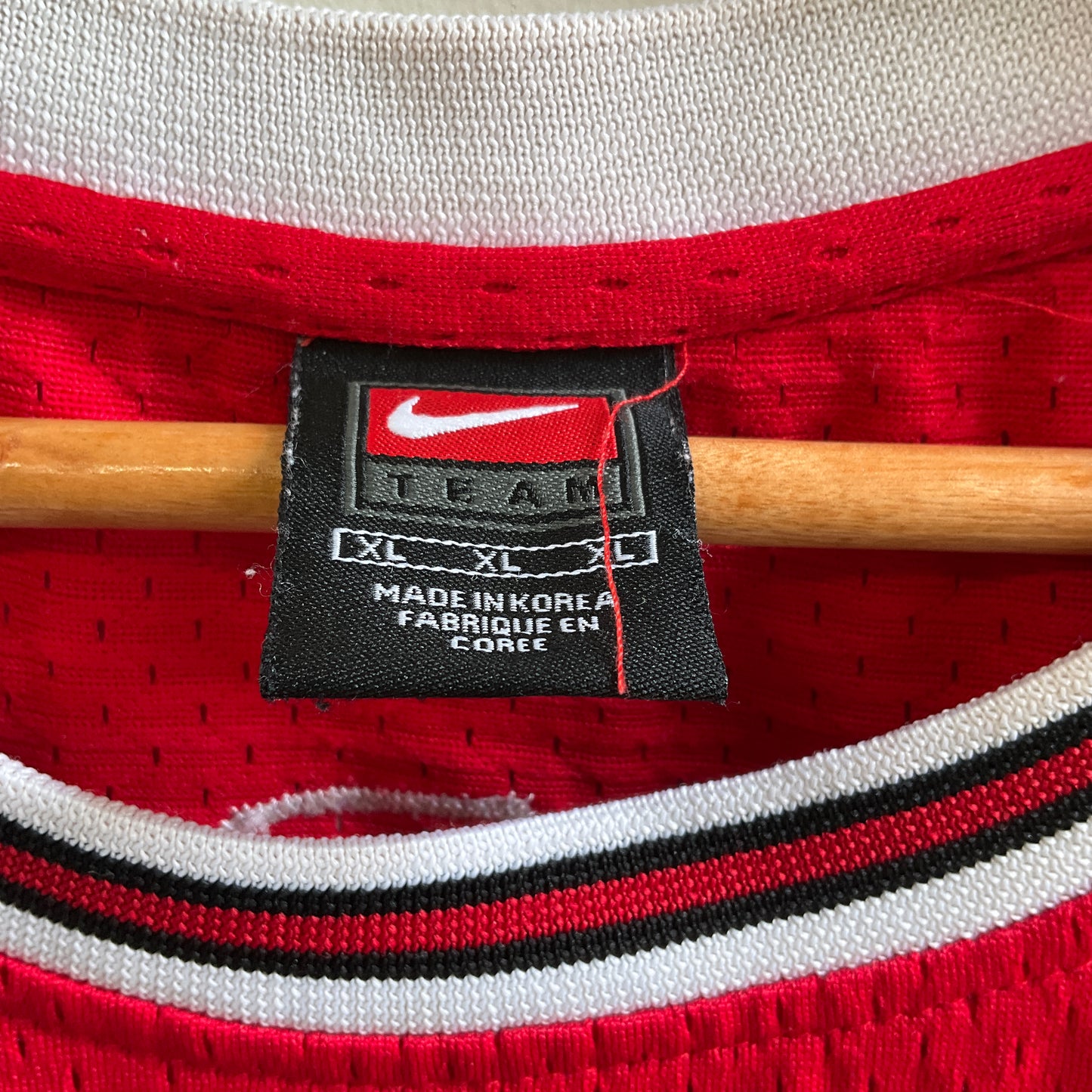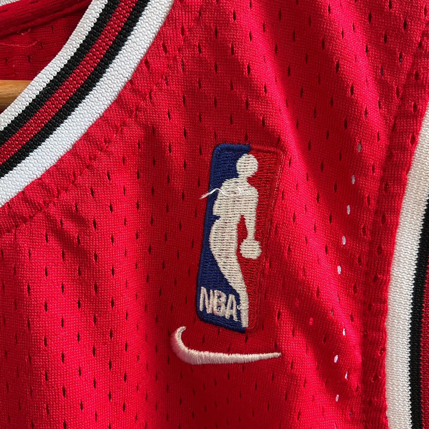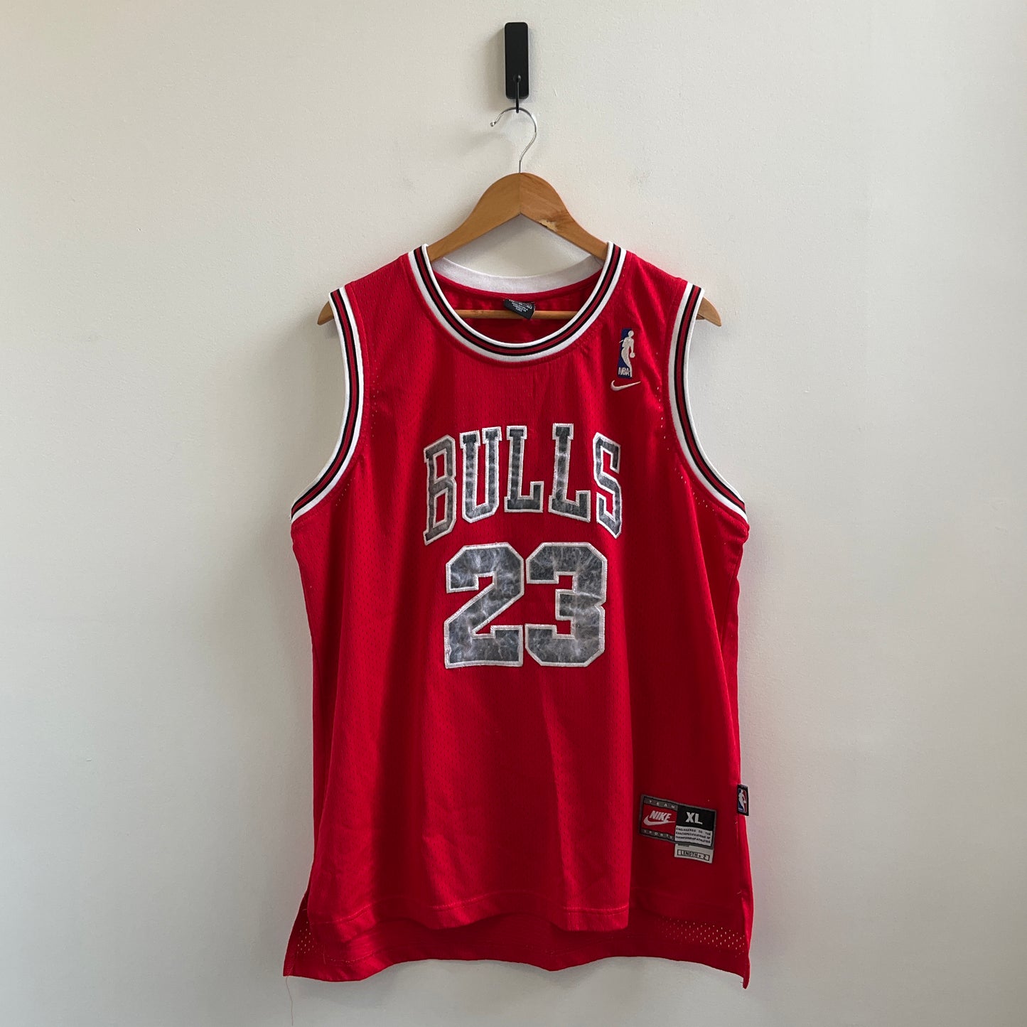 Chicago Bulls "Jordan" #23 Basketball Jersey by Nike. Features an acid wash style lettering. The underarm has a ripped seam. Stitching on front number starting to pull away slightly on the edge.