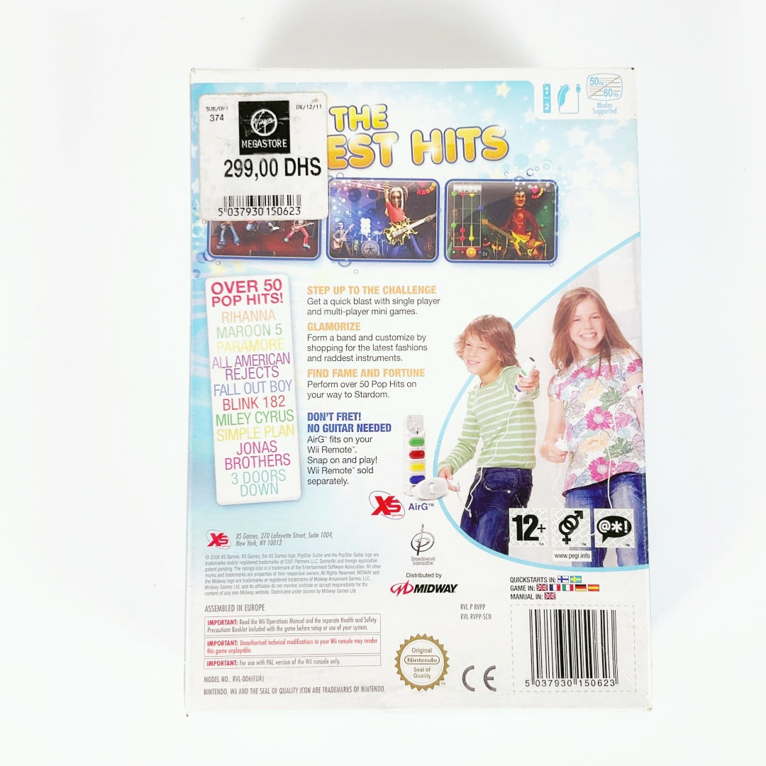 - Condition: Very Good. This console and all accessories have been tested and are in good working condition.ย The top of the console shows some yellowing, and there are a few light surface scratches. The game Wii Popstar Guitar is brand new and still sealed. Please note that AA batteries are not included.