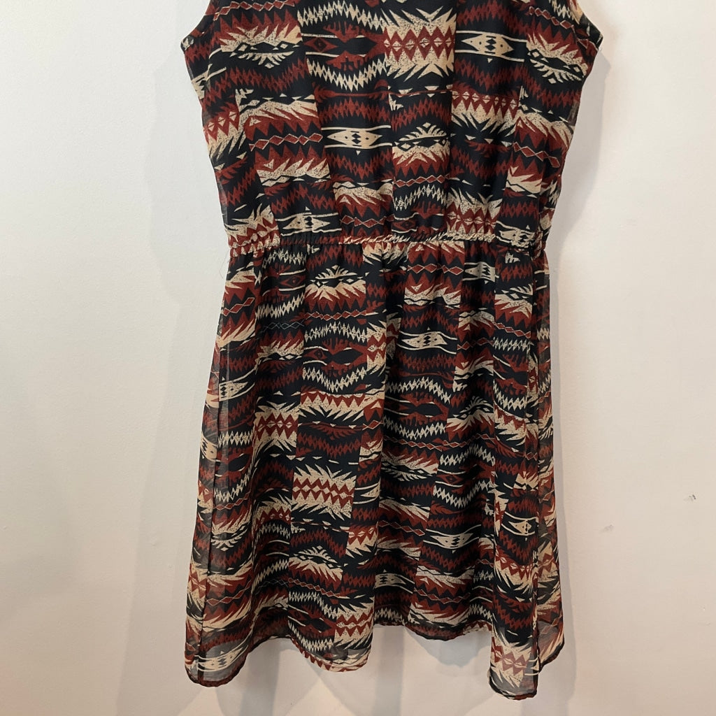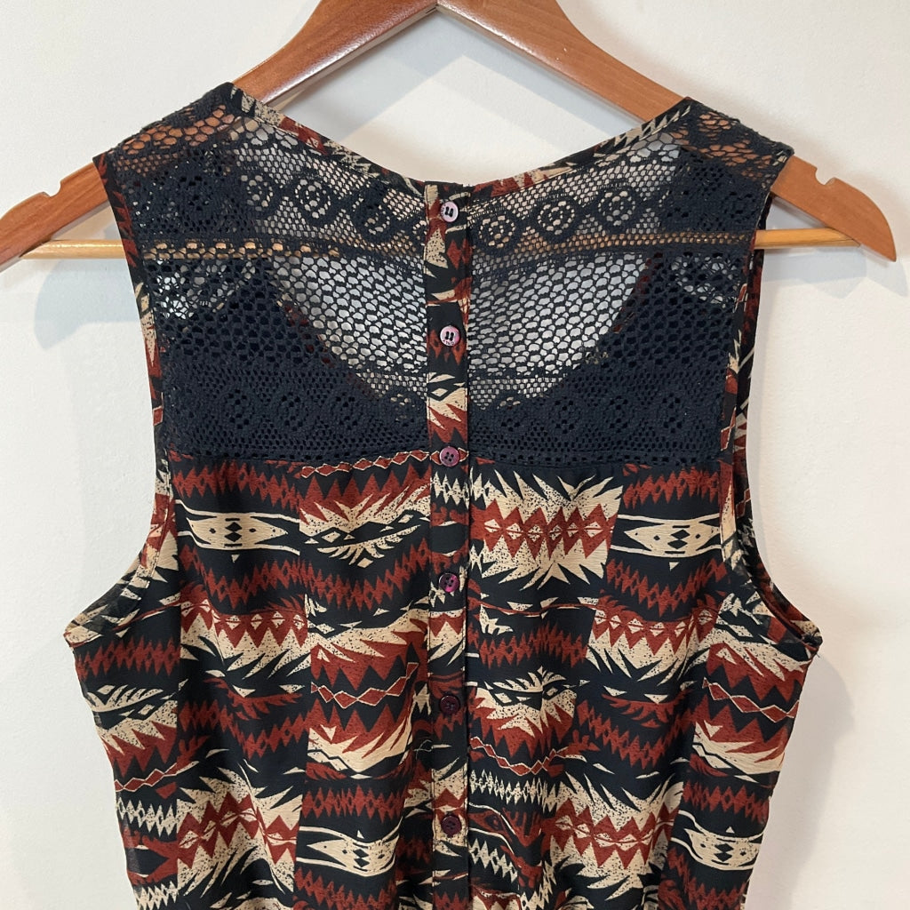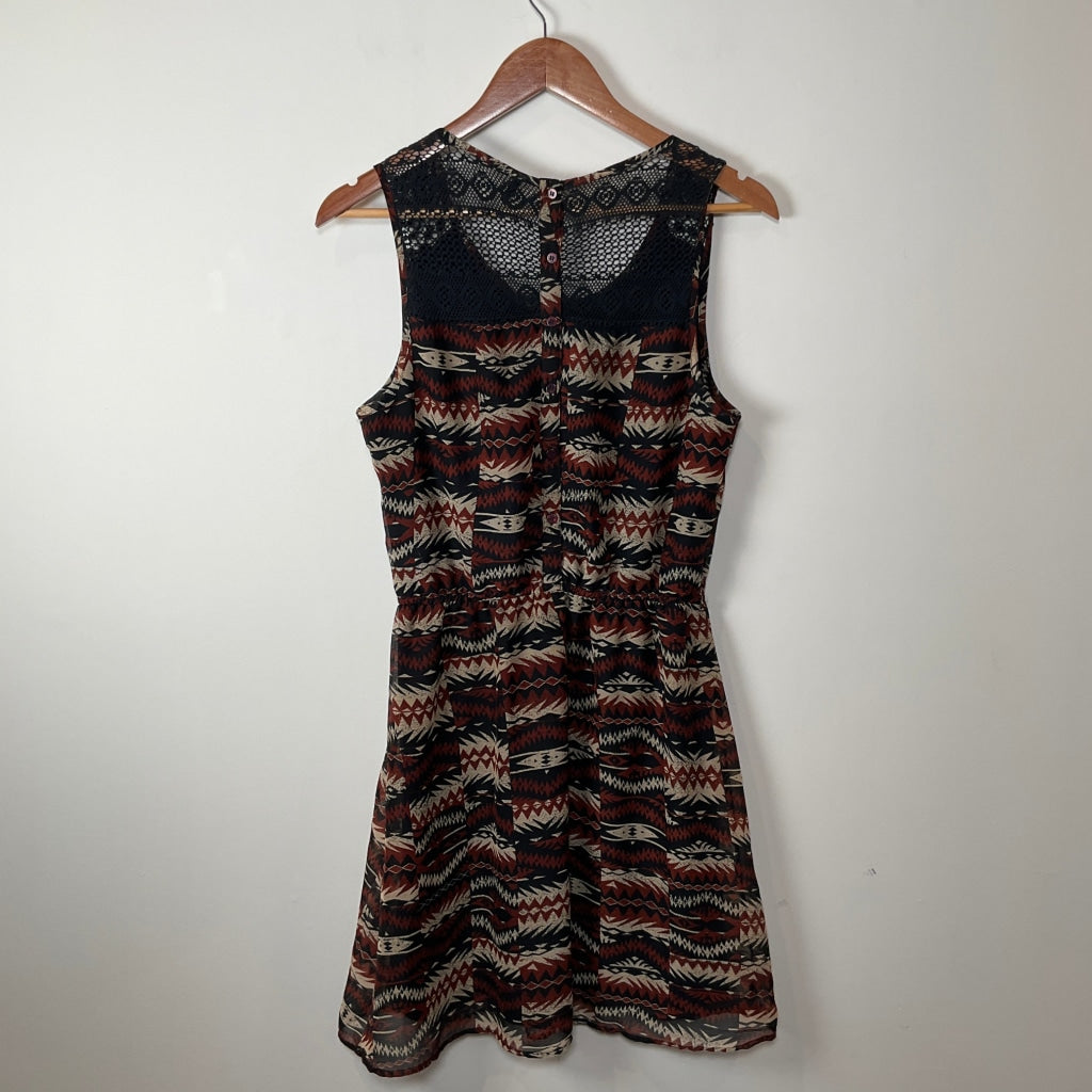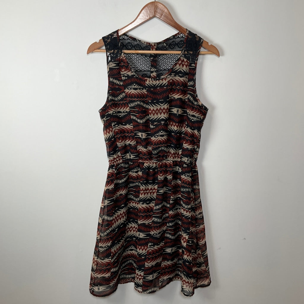 Lovely knee length dress by Only. The dress is a panel print design with lace look-alike panels on the shoulder and the back.