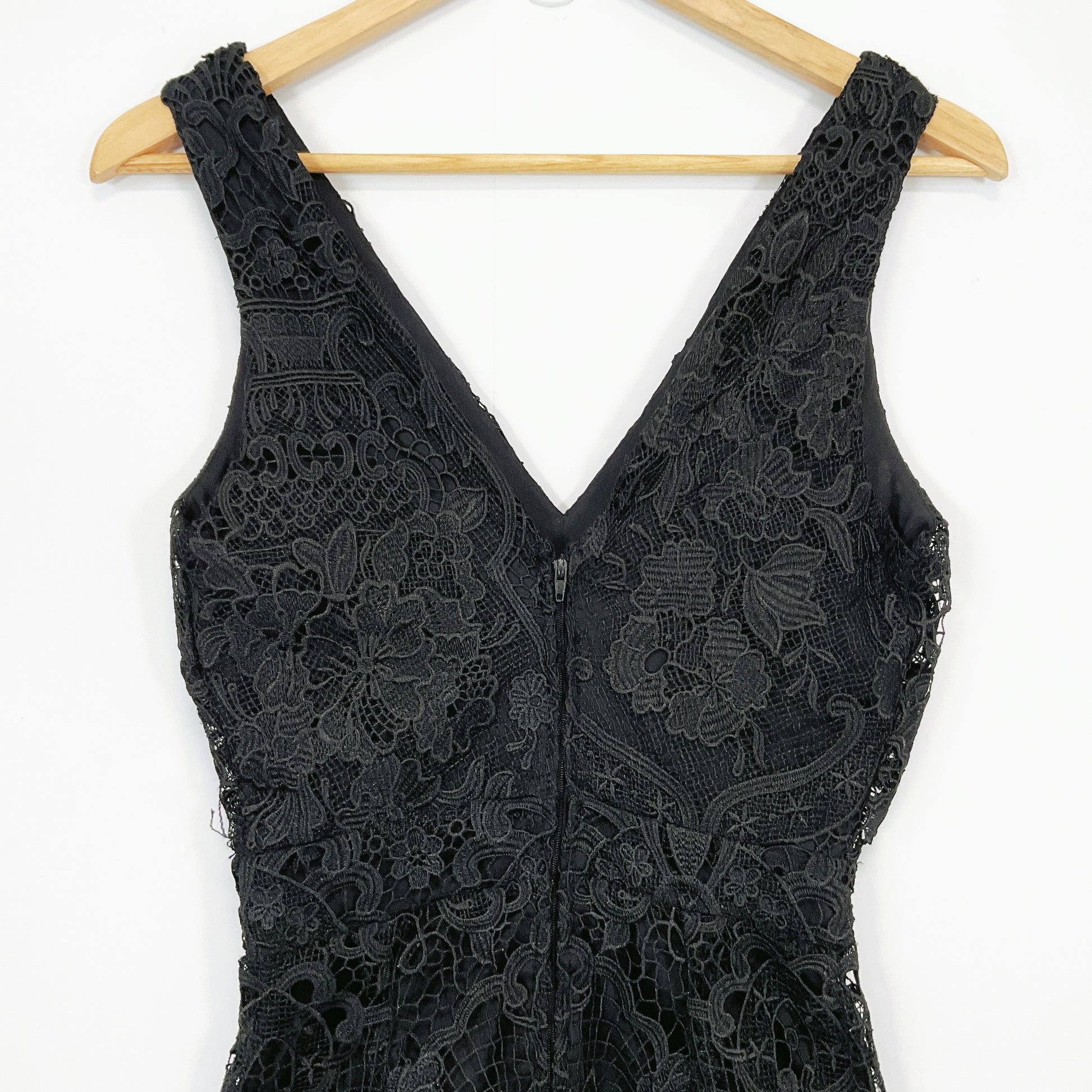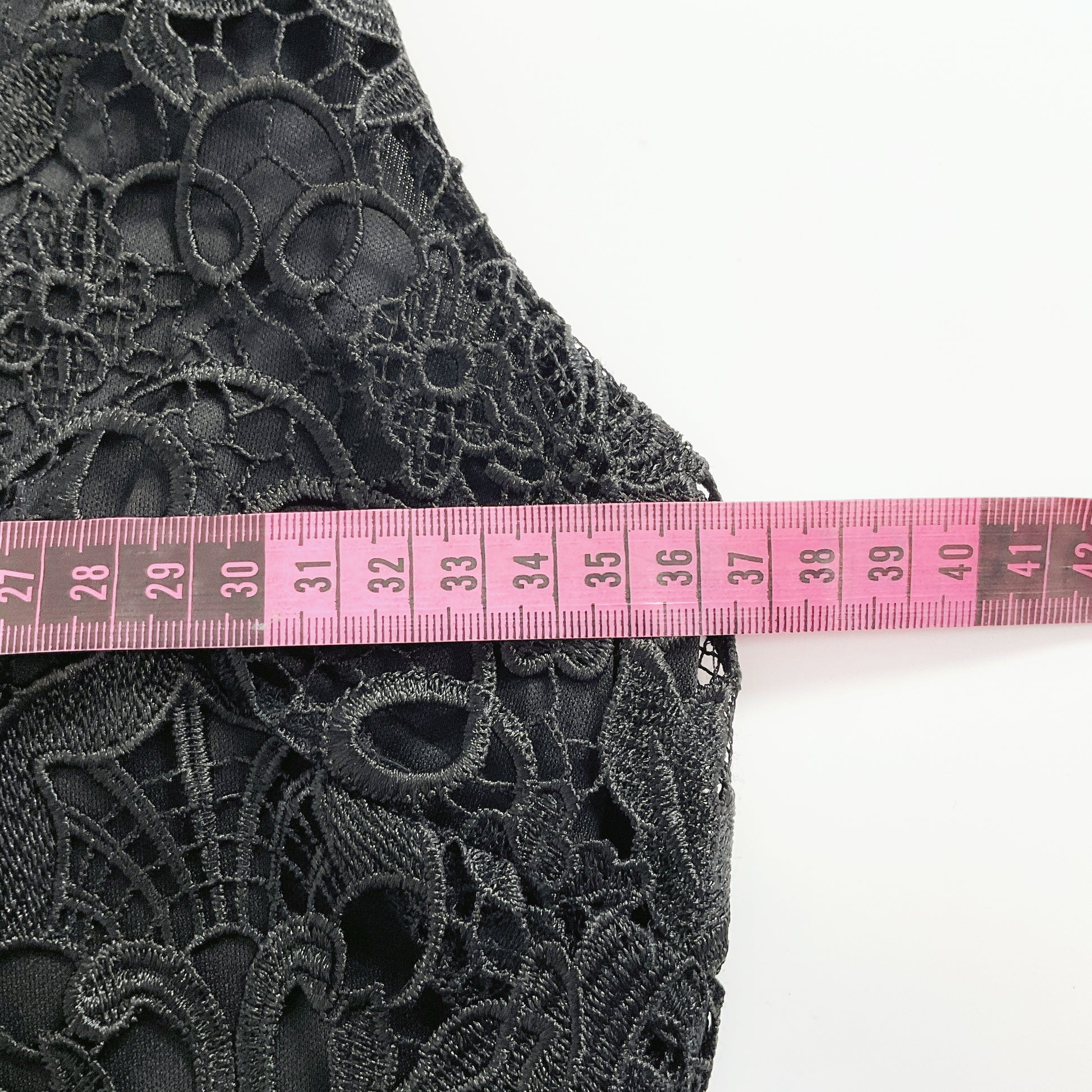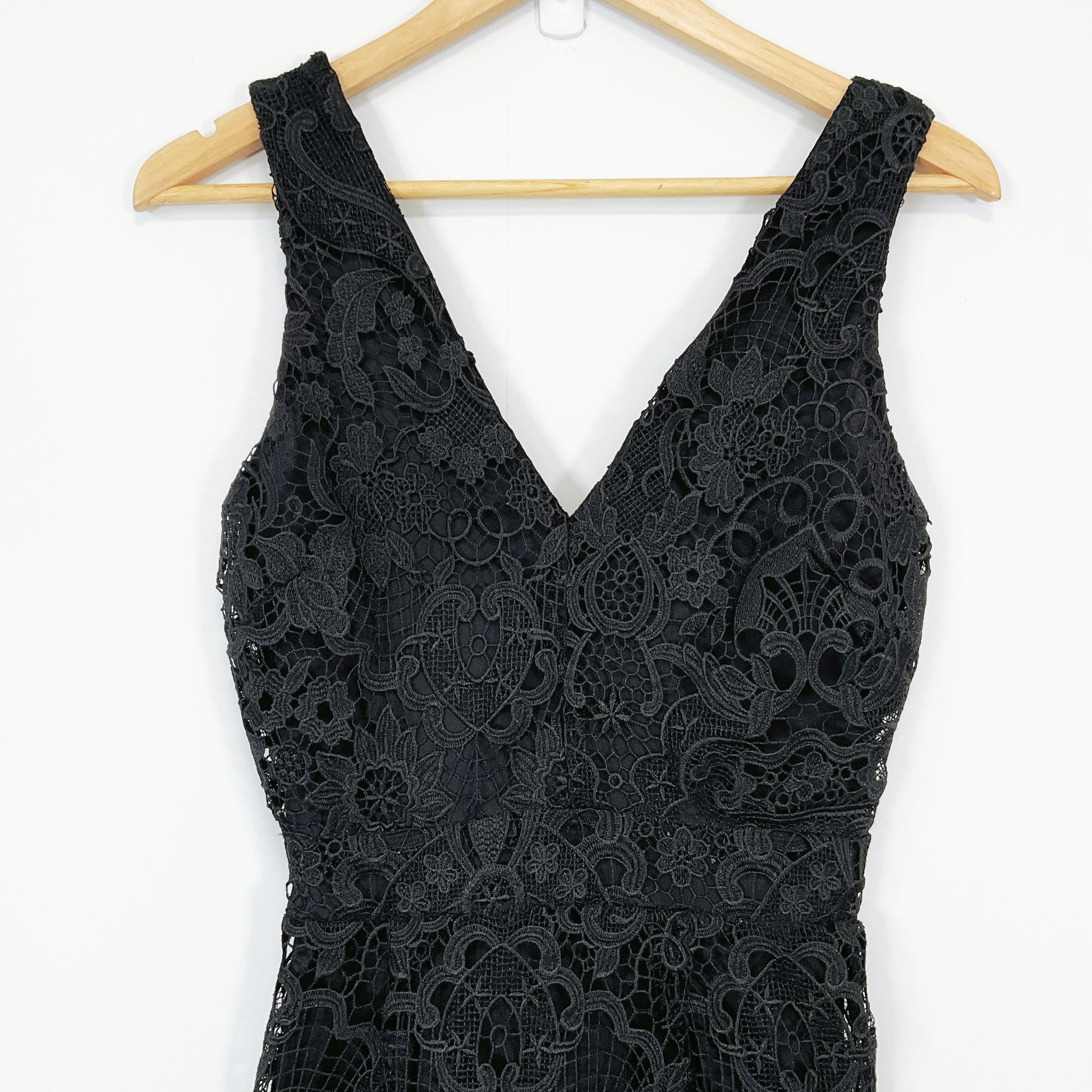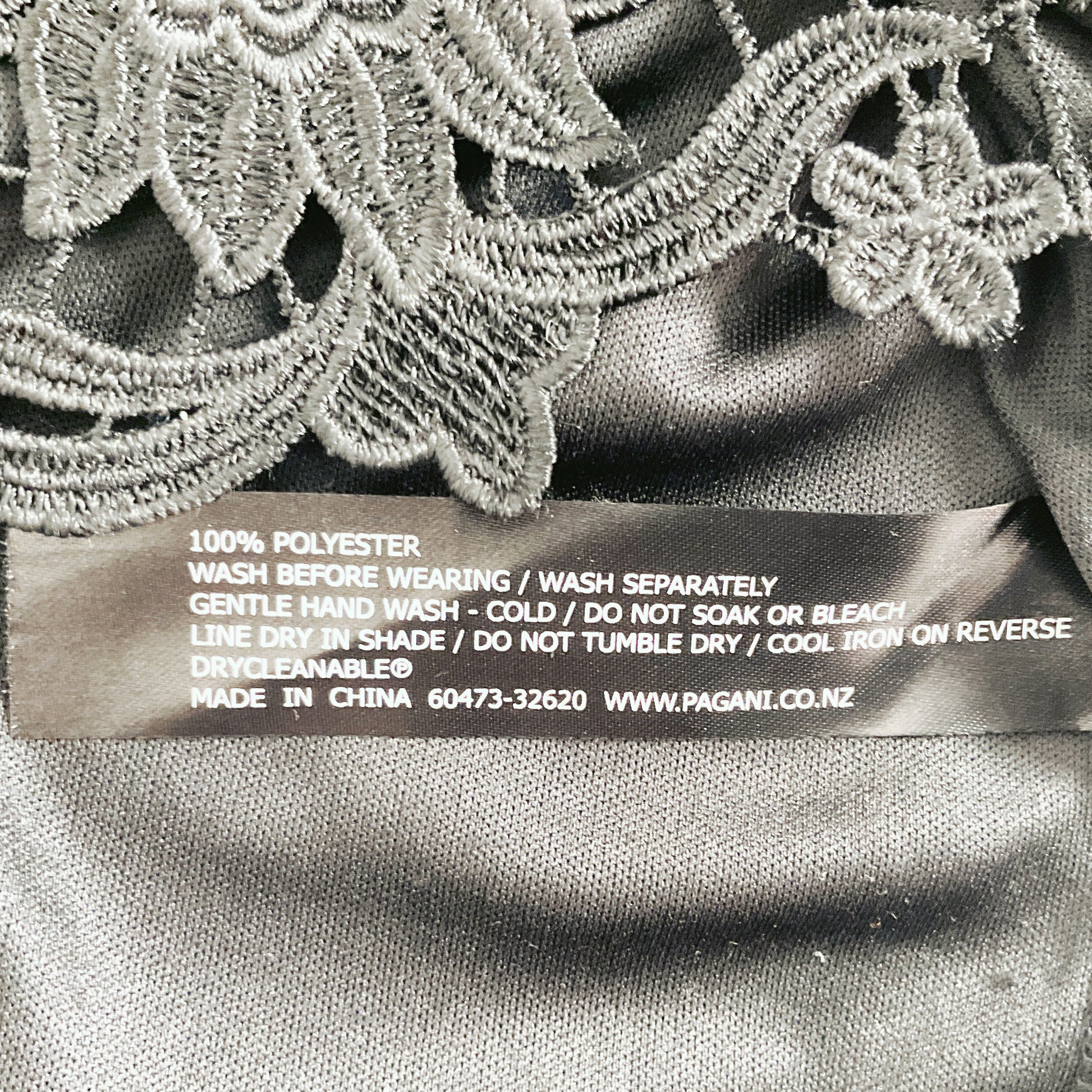 Elegant black sleeveless evening dress by Pagani, featuring a fitted silhouette with all-over floral lace overlay and scalloped hem. Made from 100% polyester and perfect for formal occasions or special nights out.
