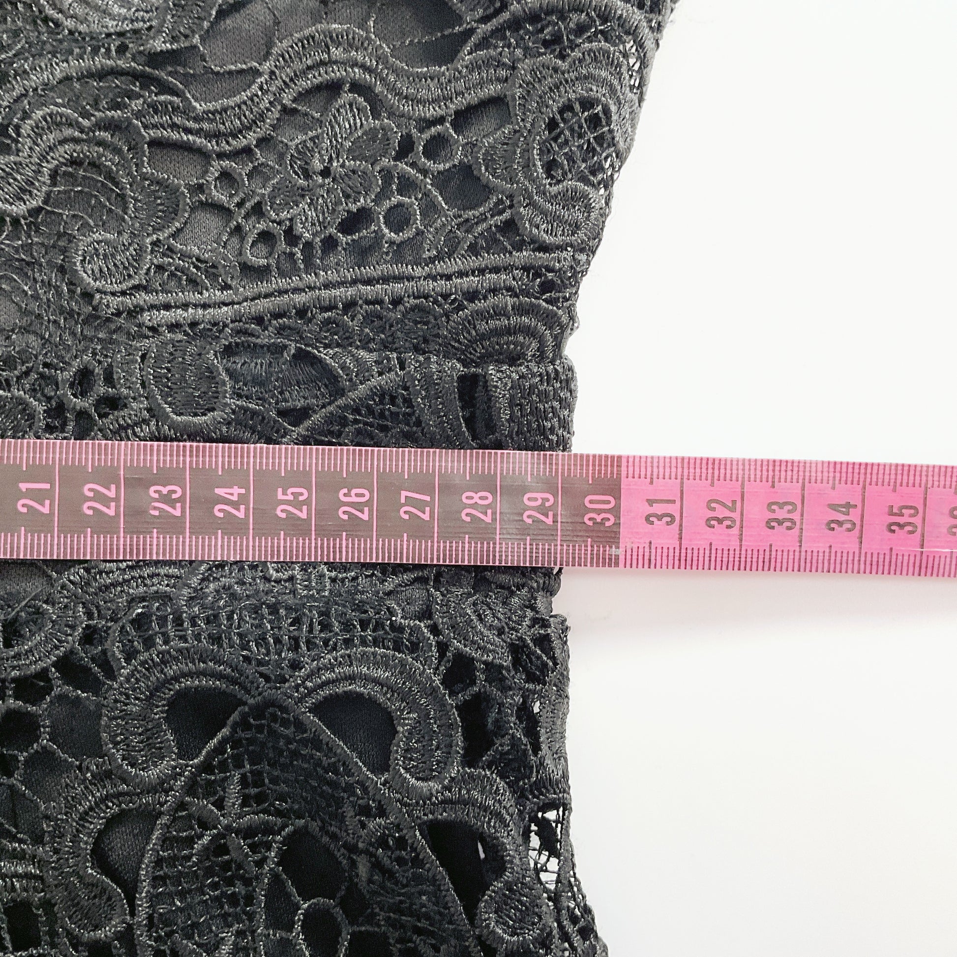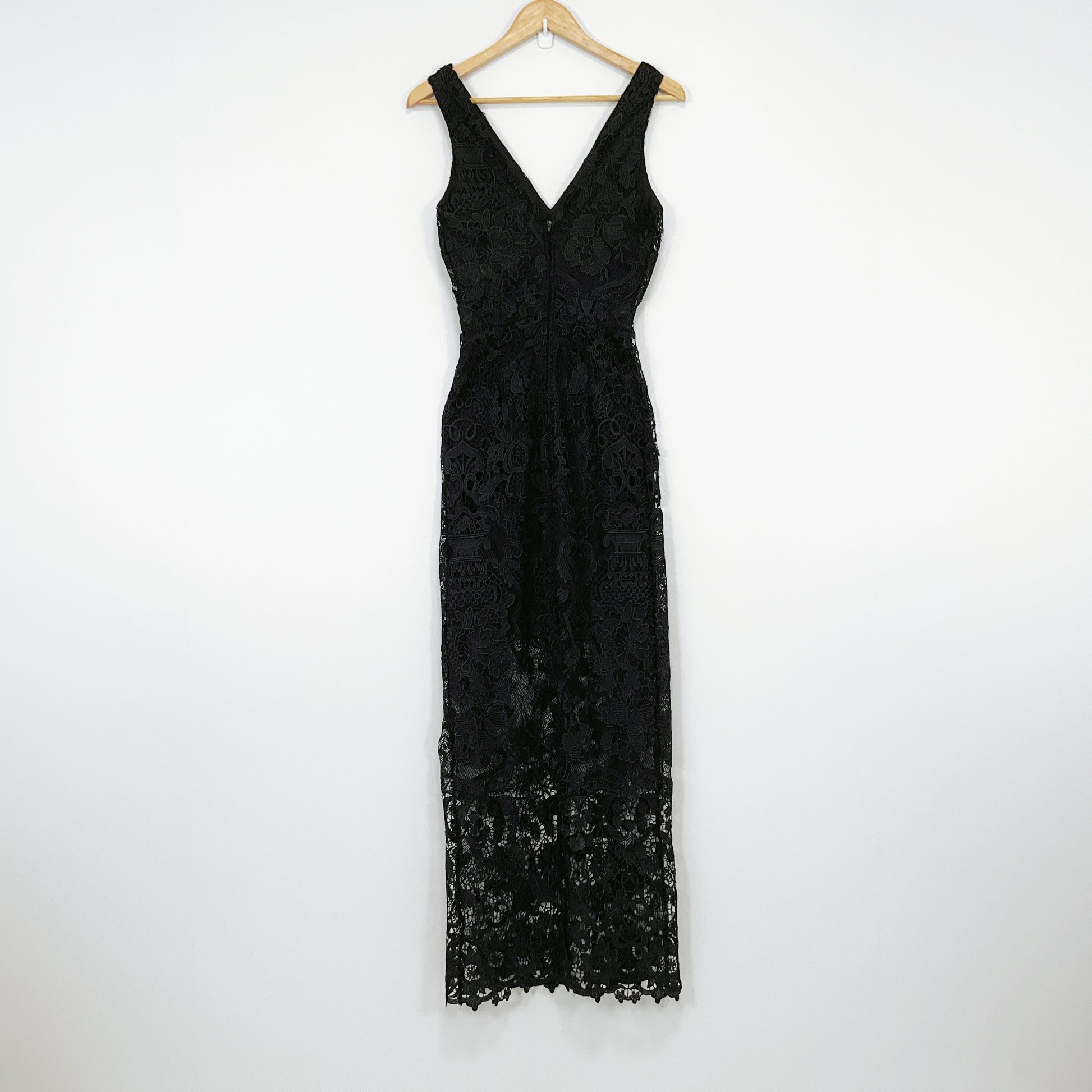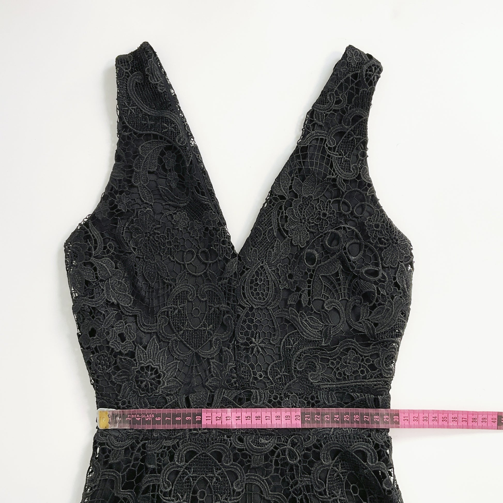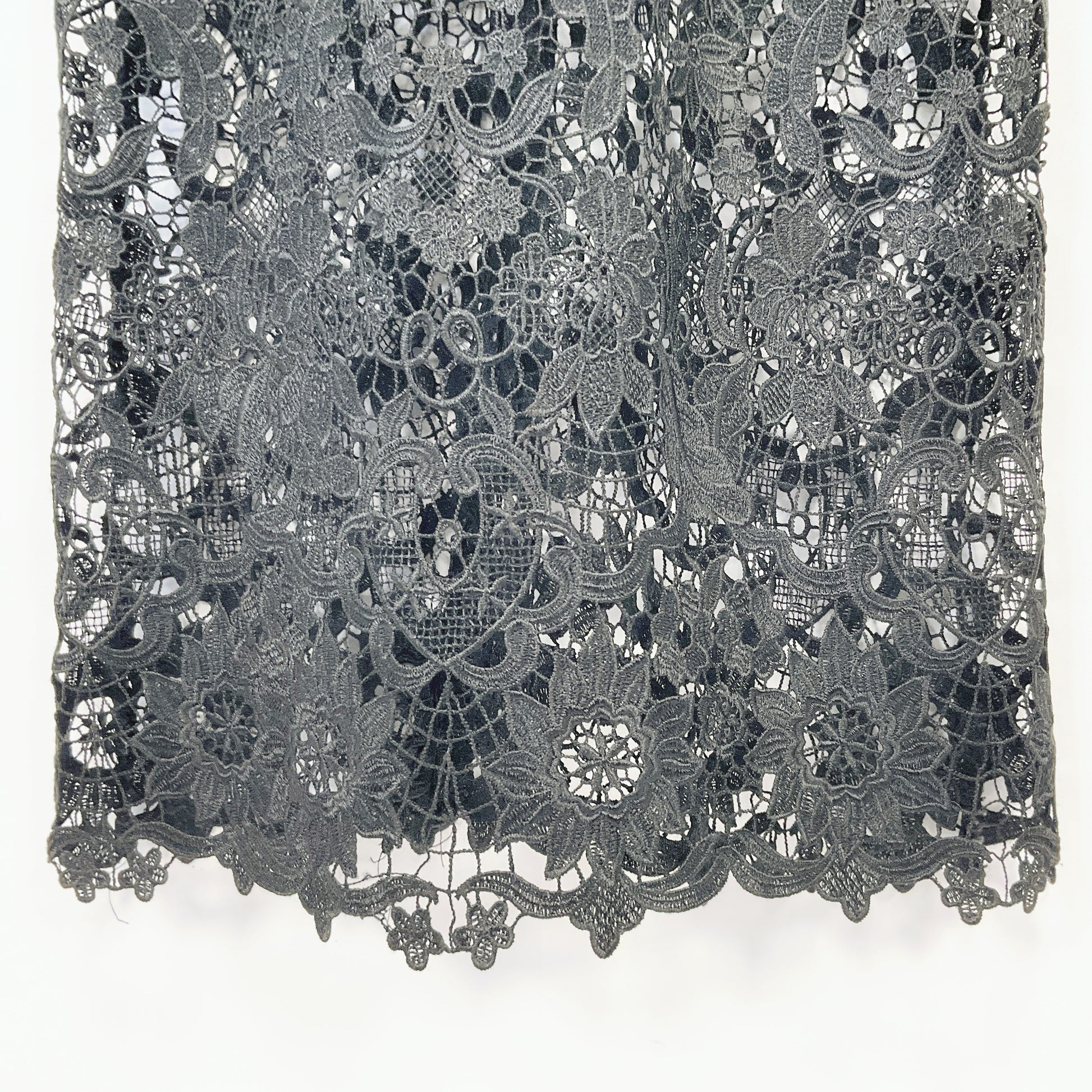 Elegant black sleeveless evening dress by Pagani, featuring a fitted silhouette with all-over floral lace overlay and scalloped hem. Made from 100% polyester and perfect for formal occasions or special nights out.