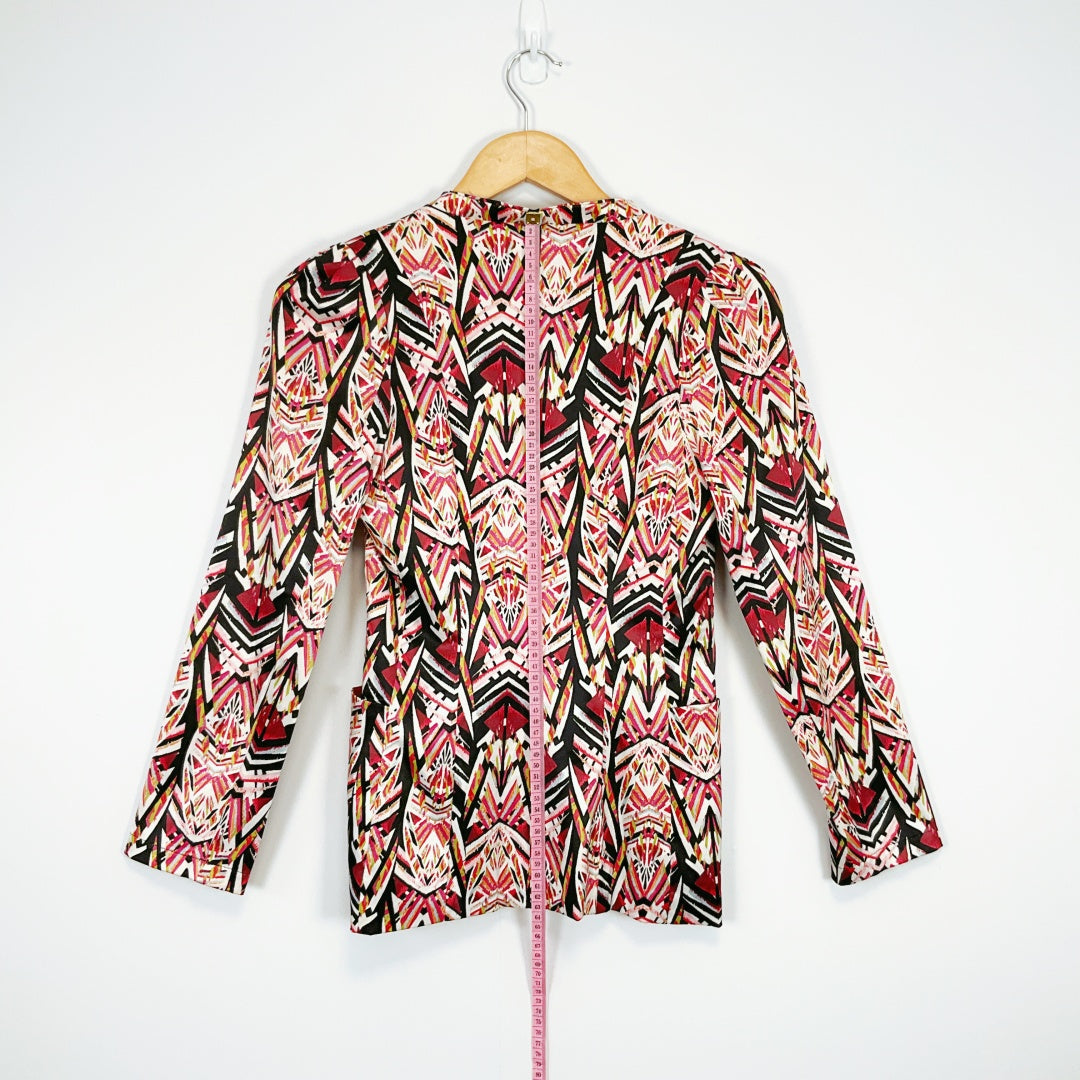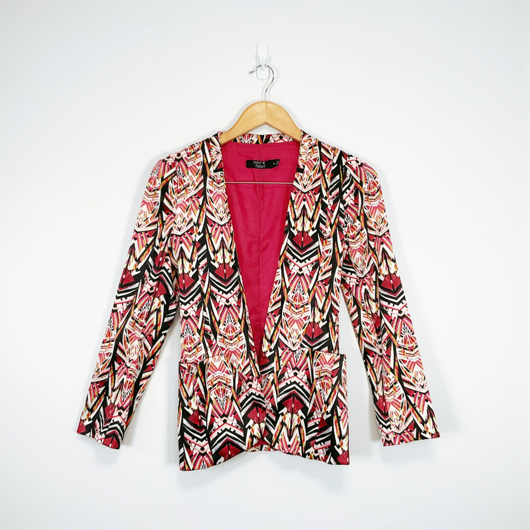 This bold long sleeve blazer is collarless, features subtle shoulder padding, and has pockets for added functionality.