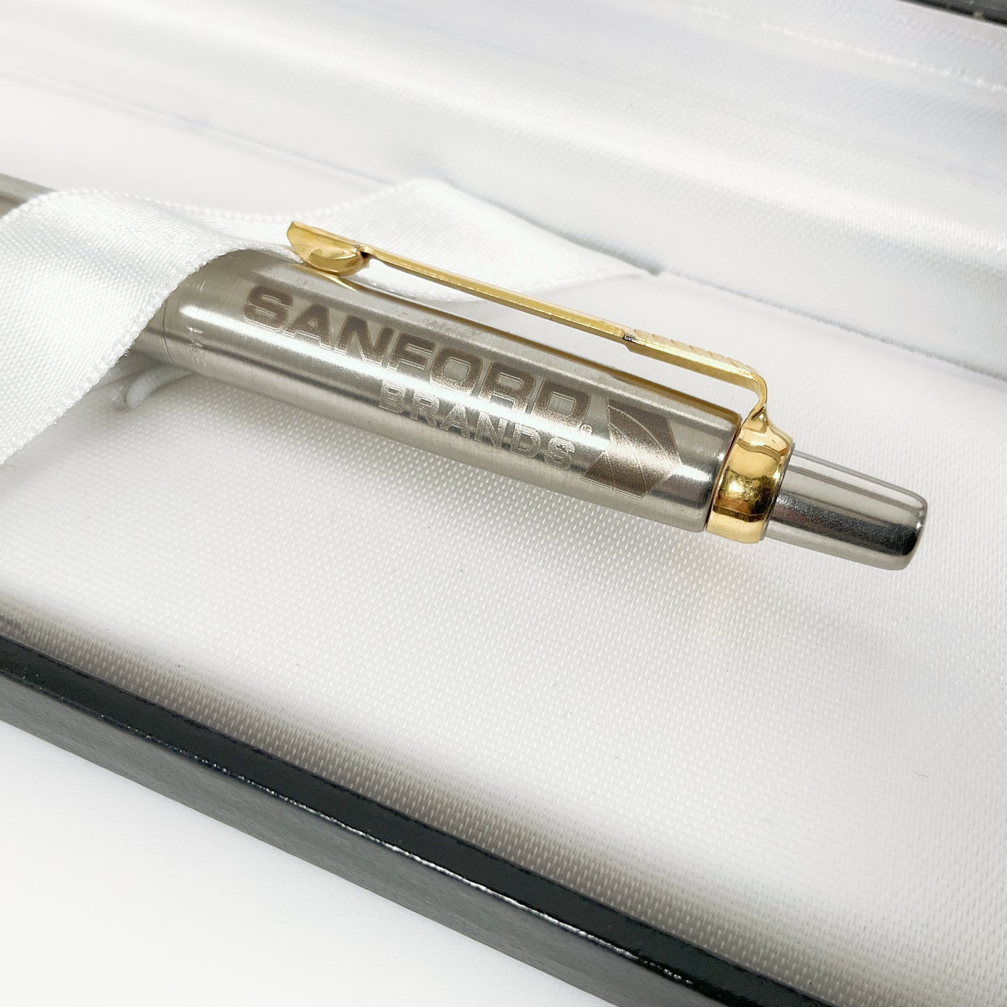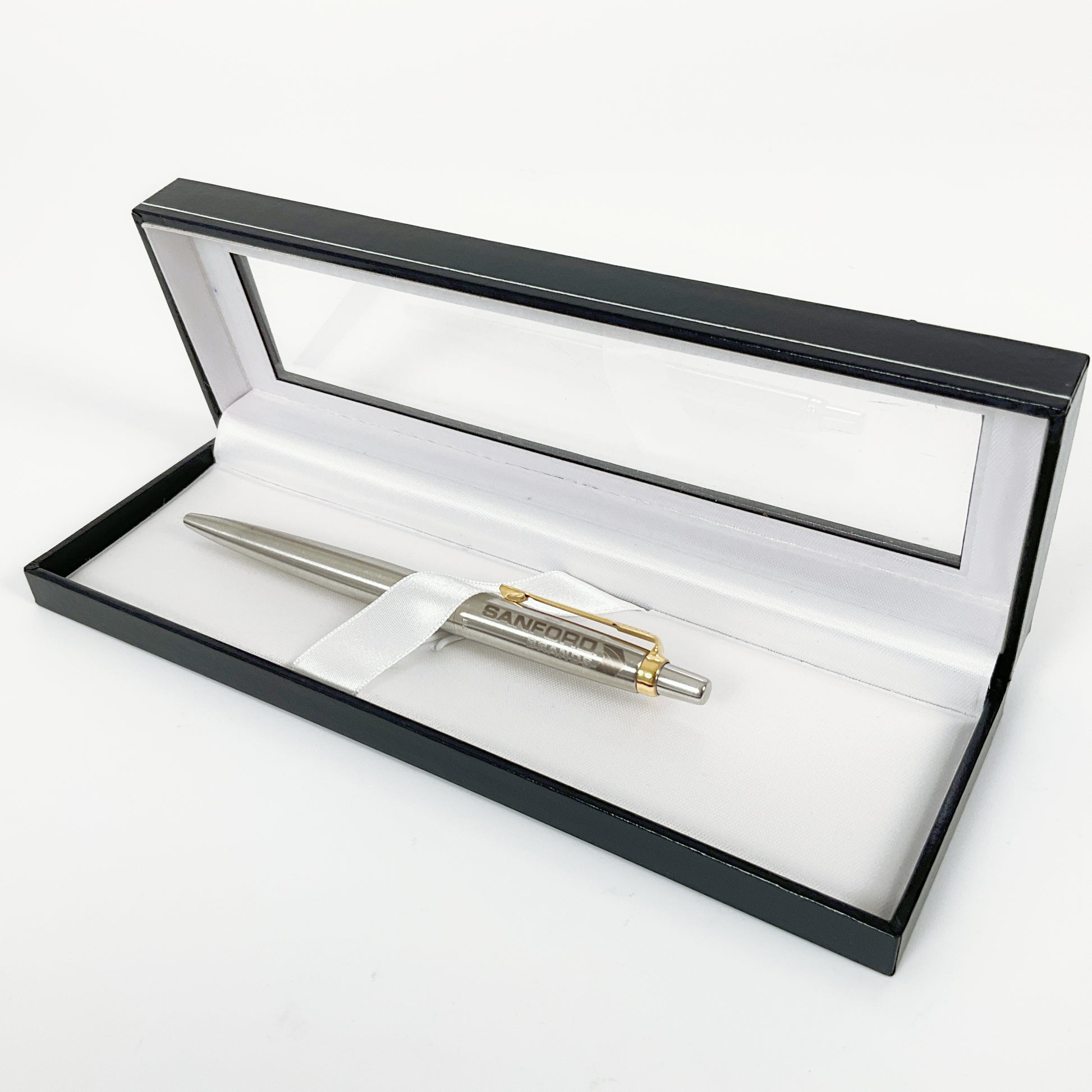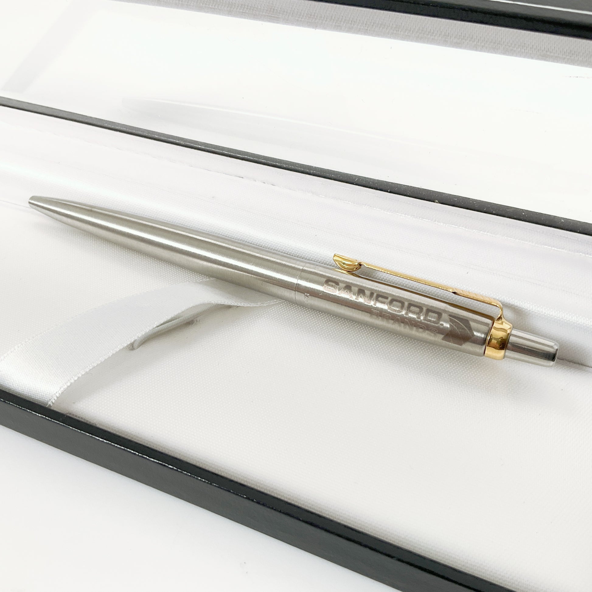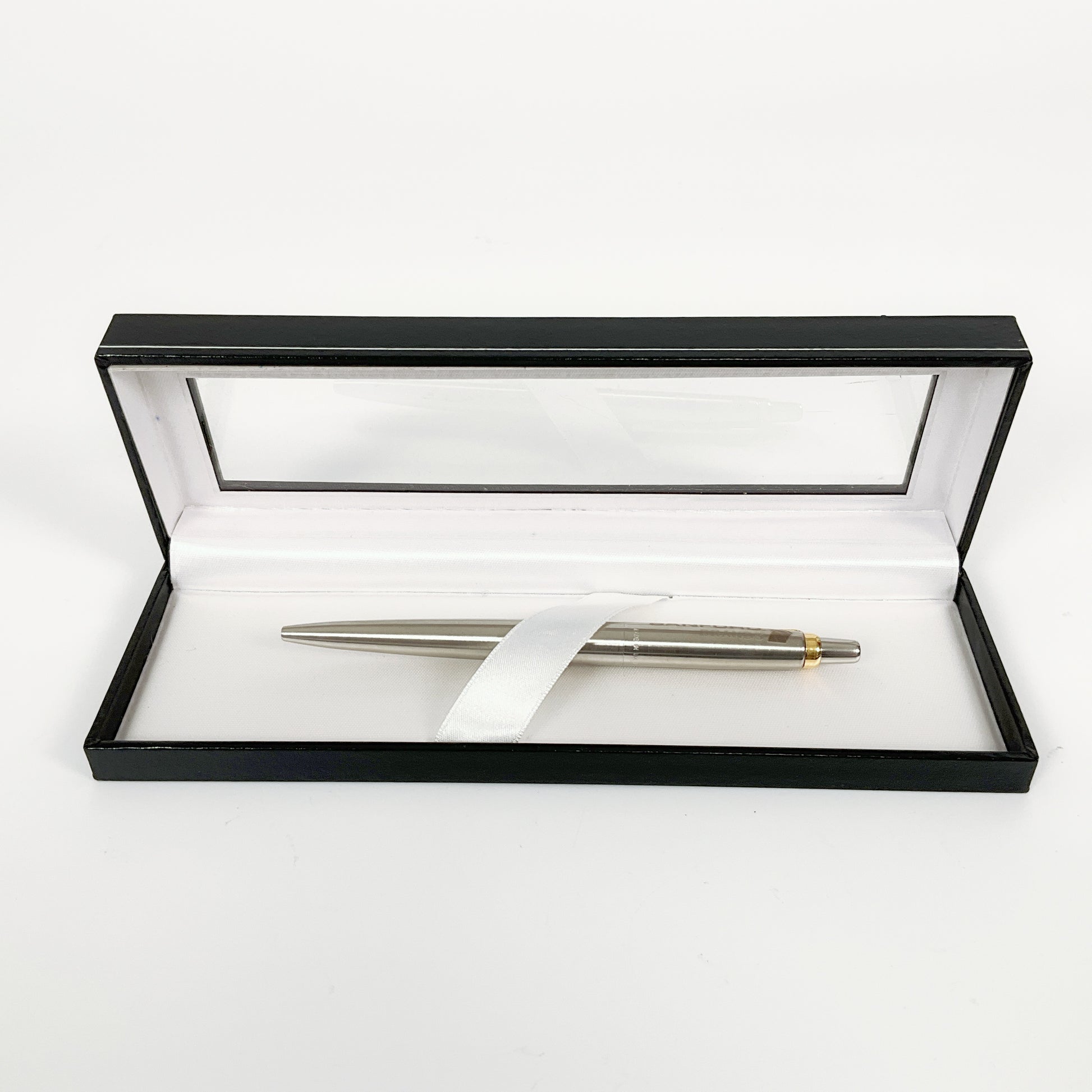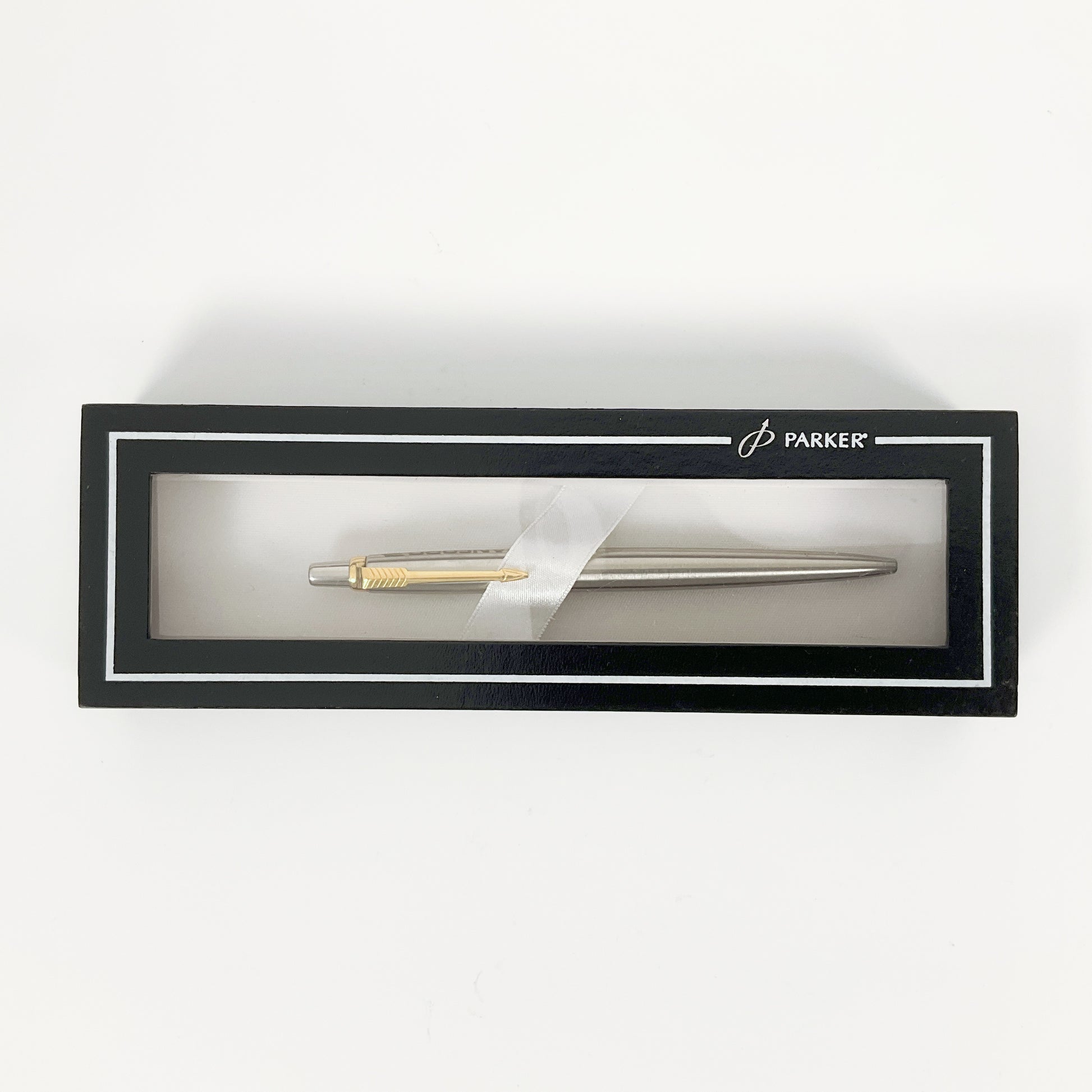 The Parker Jotter Stainless Steel Ballpoint Pen with Gold Trim is a timeless writing instrument known for its sleek design and reliable performance. Its stainless steel body is complemented by gold-finished accents, offering a sophisticated touch to your writing experience.