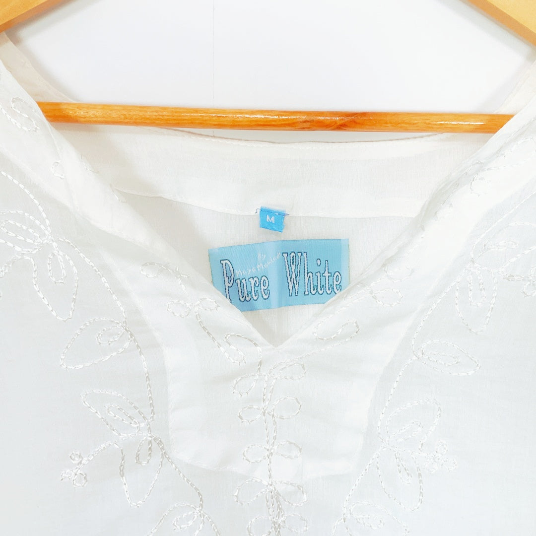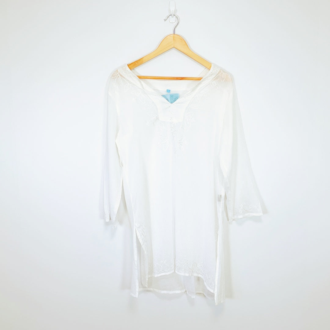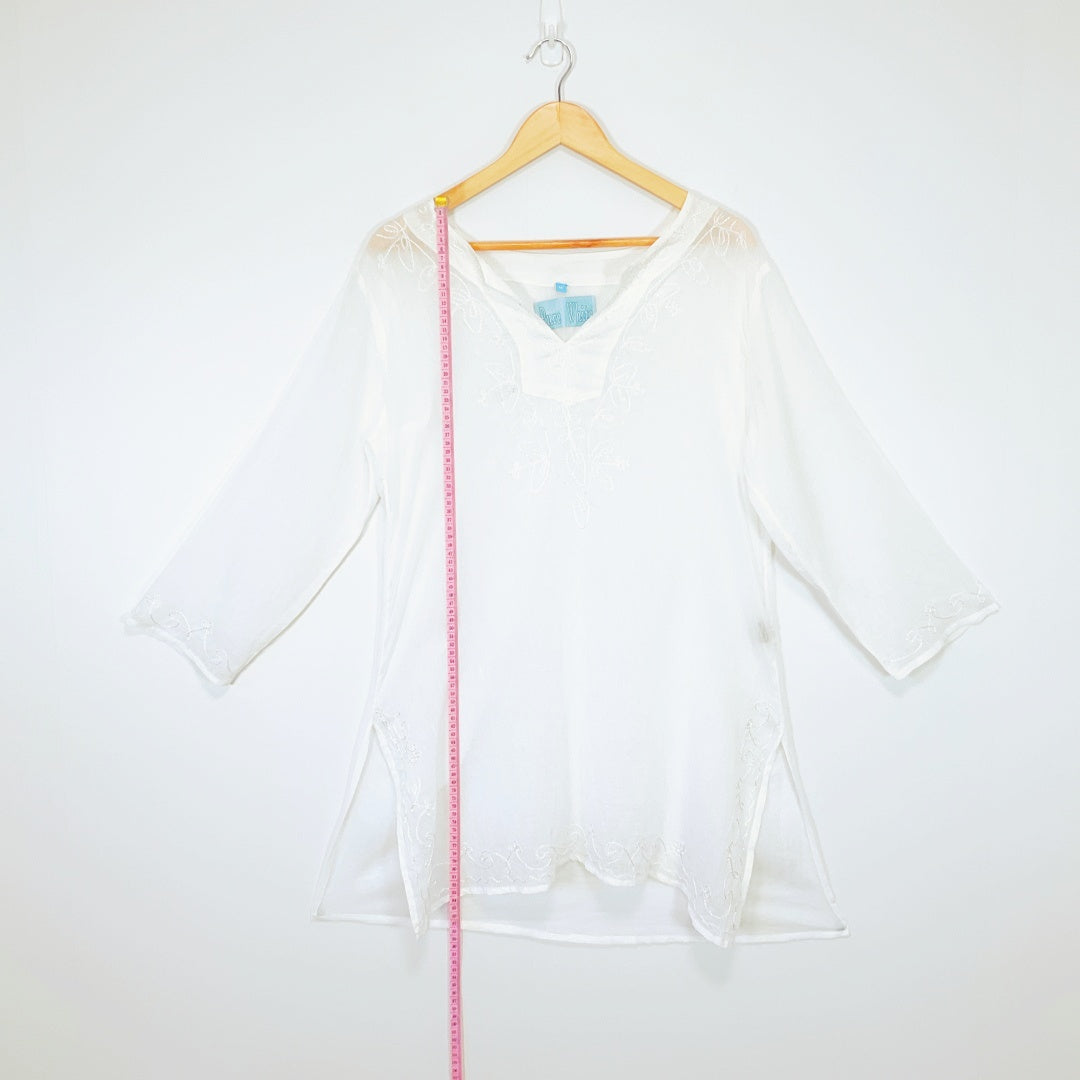 A lightweight white tunic top with a relaxed, easy-to-wear silhouette. Made from breathable cotton, it’s perfect for everyday wear or layering in warmer months. Simple and timeless in style.