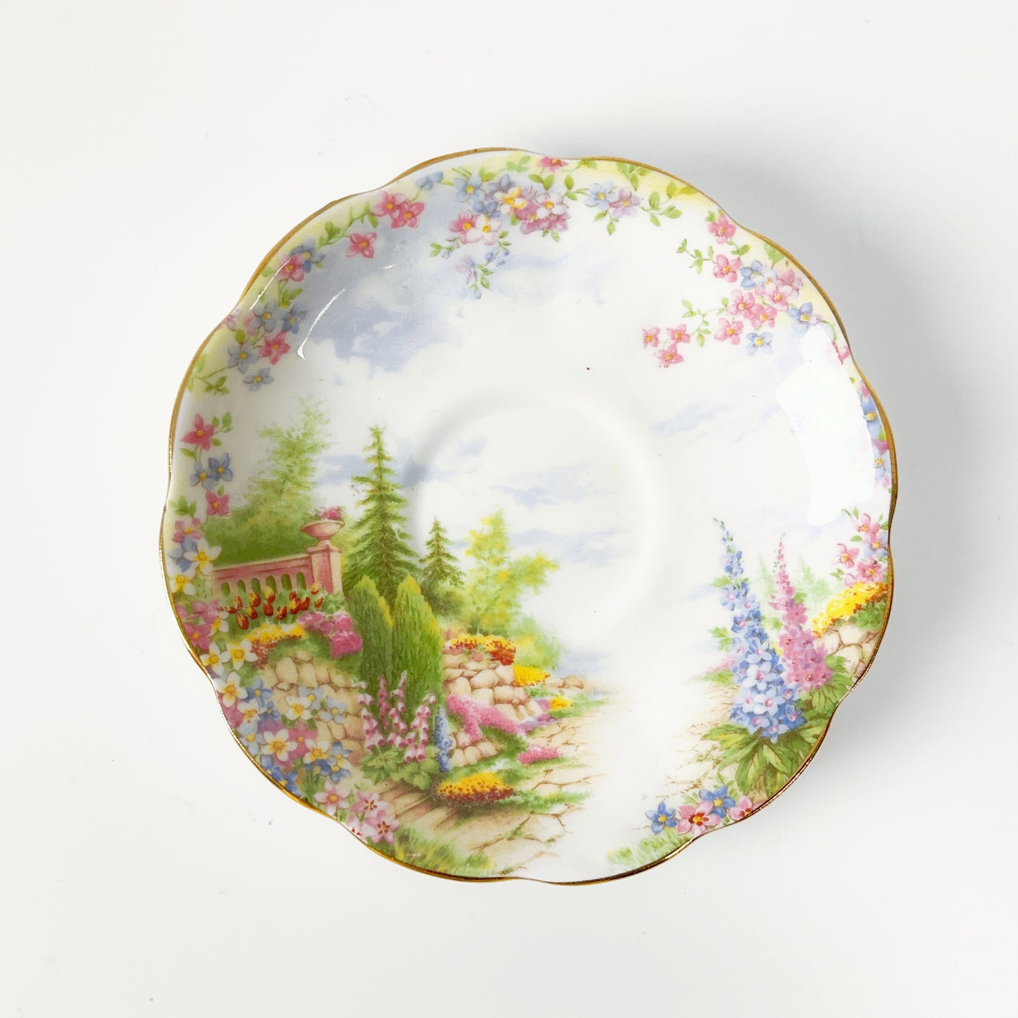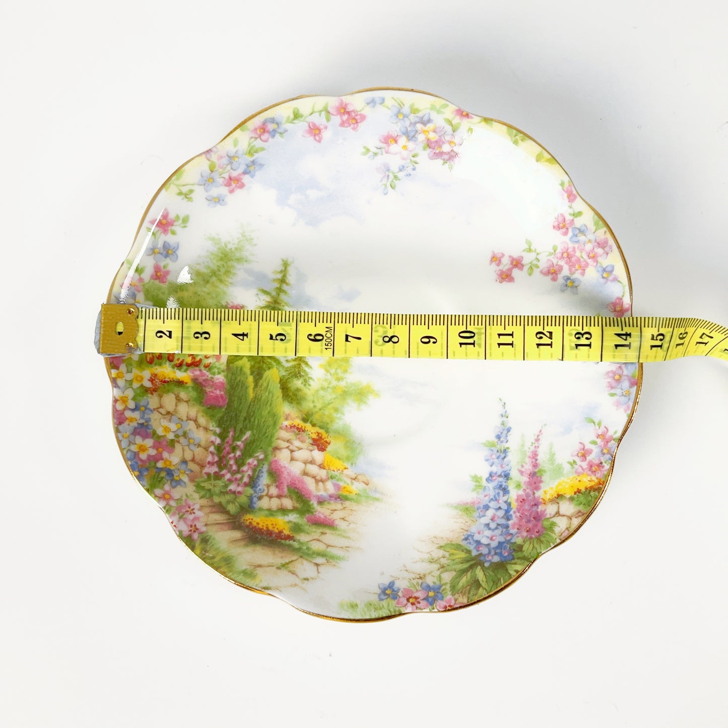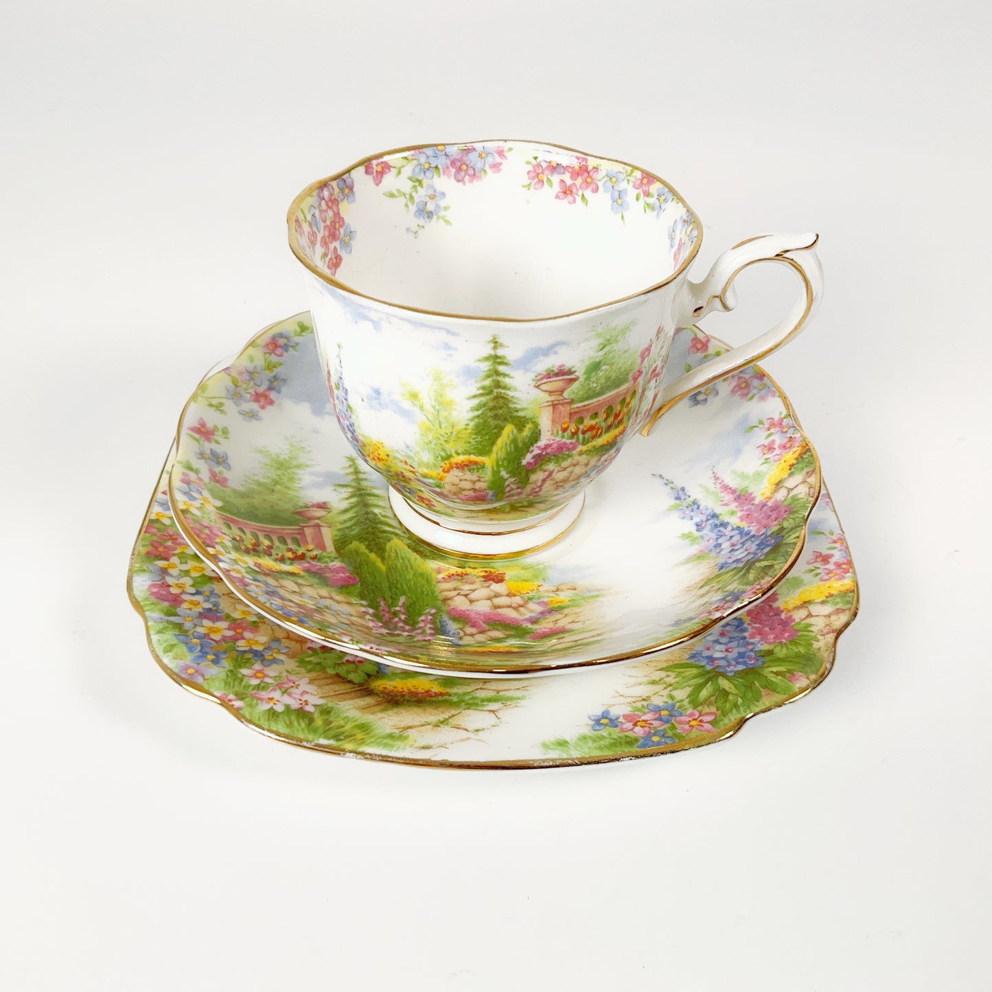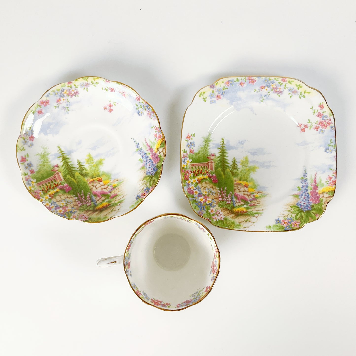 This stunning vintage tea trio set from Royal Albert, England, features the exquisite "Kentish Rockery" pattern. The set includes a teacup, saucer, and dessert plate, each adorned with vibrant, scenic garden designs in green, pink, blue, and yellow hues, finished with elegant gold trim.