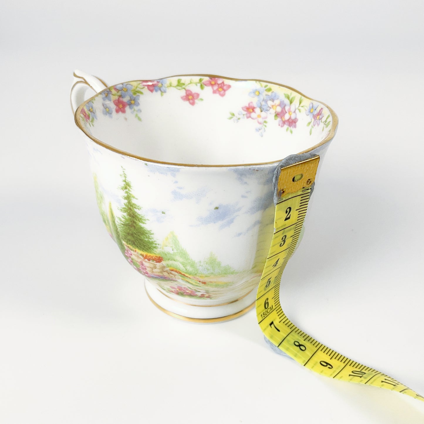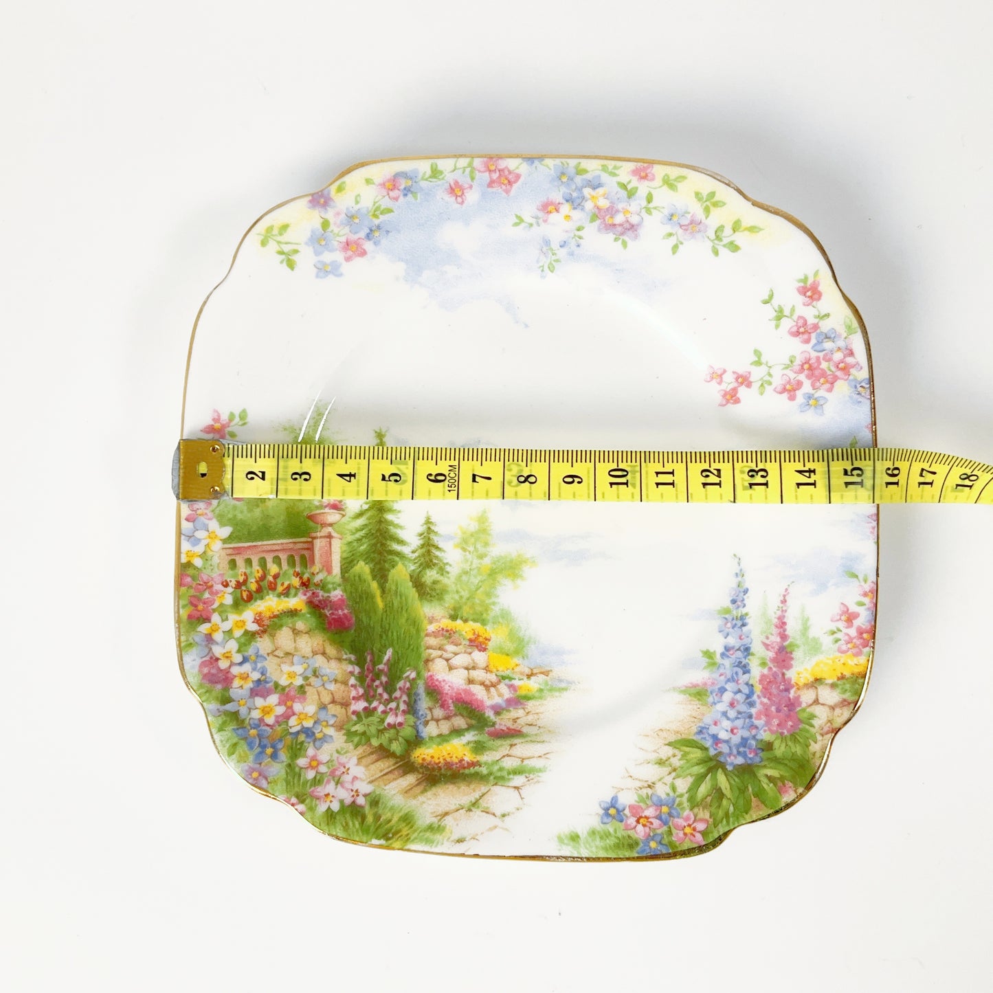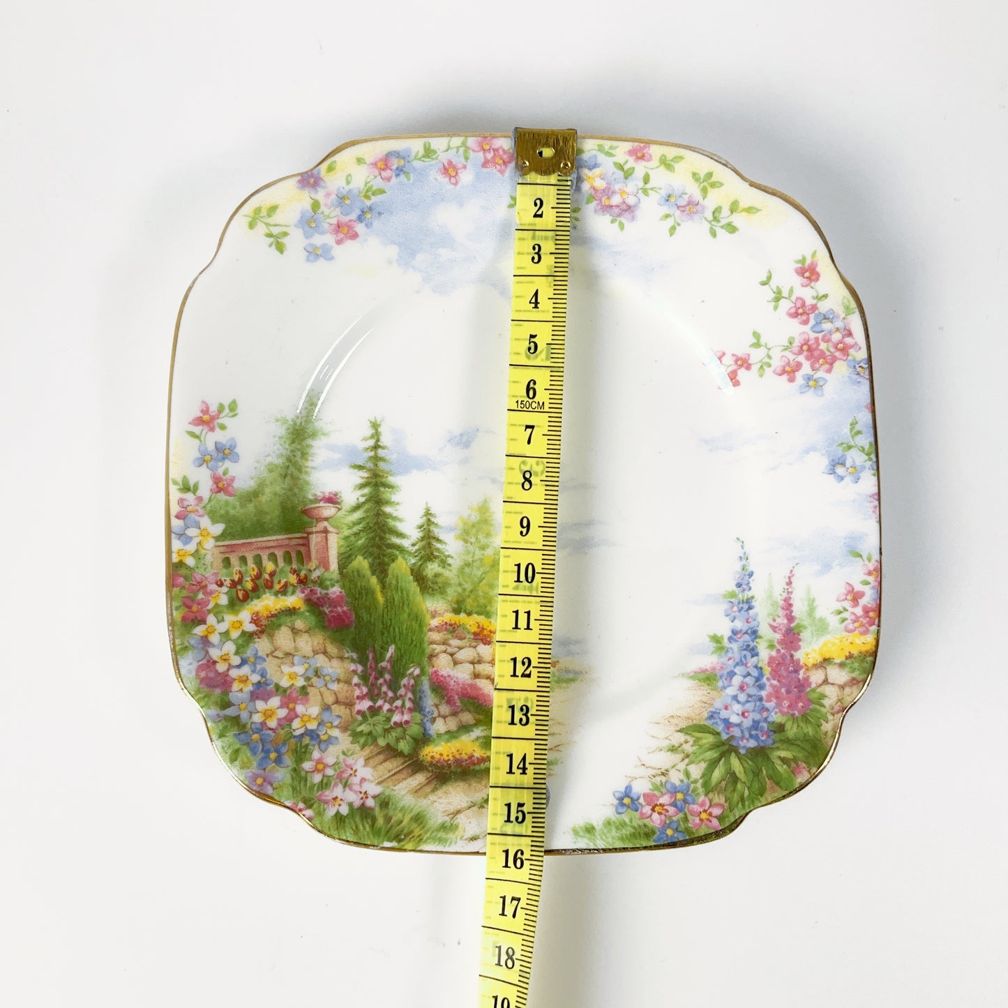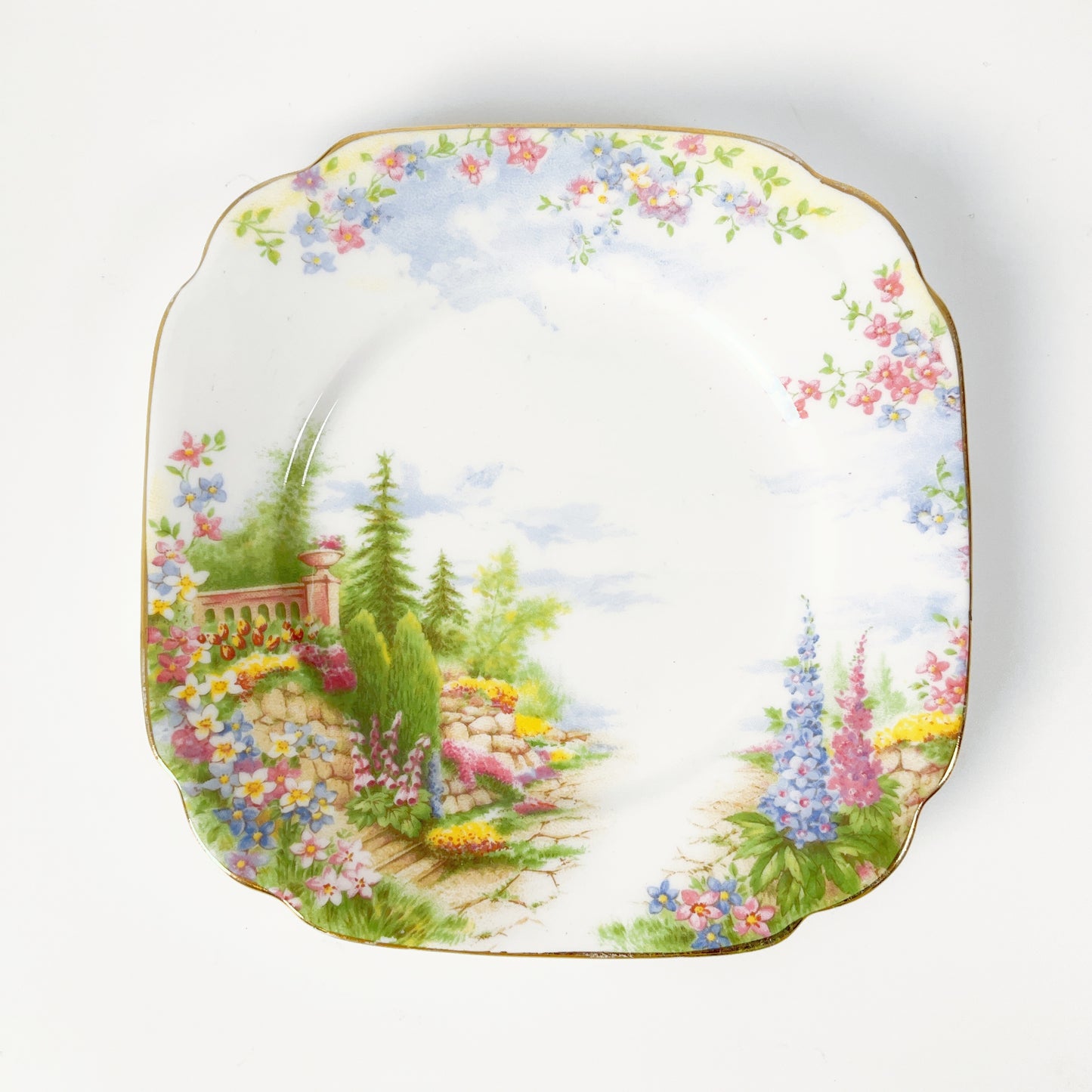 This stunning vintage tea trio set from Royal Albert, England, features the exquisite "Kentish Rockery" pattern. The set includes a teacup, saucer, and dessert plate, each adorned with vibrant, scenic garden designs in green, pink, blue, and yellow hues, finished with elegant gold trim.