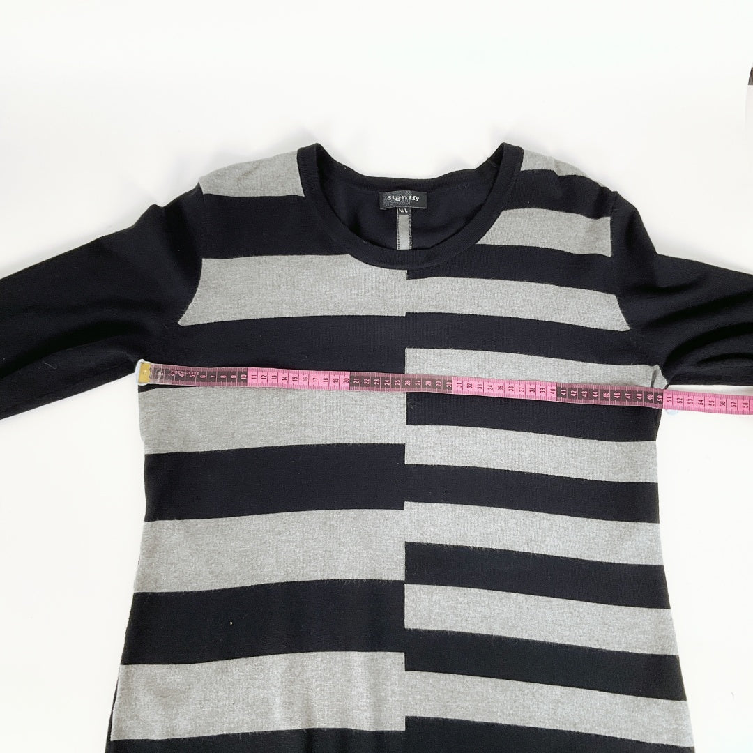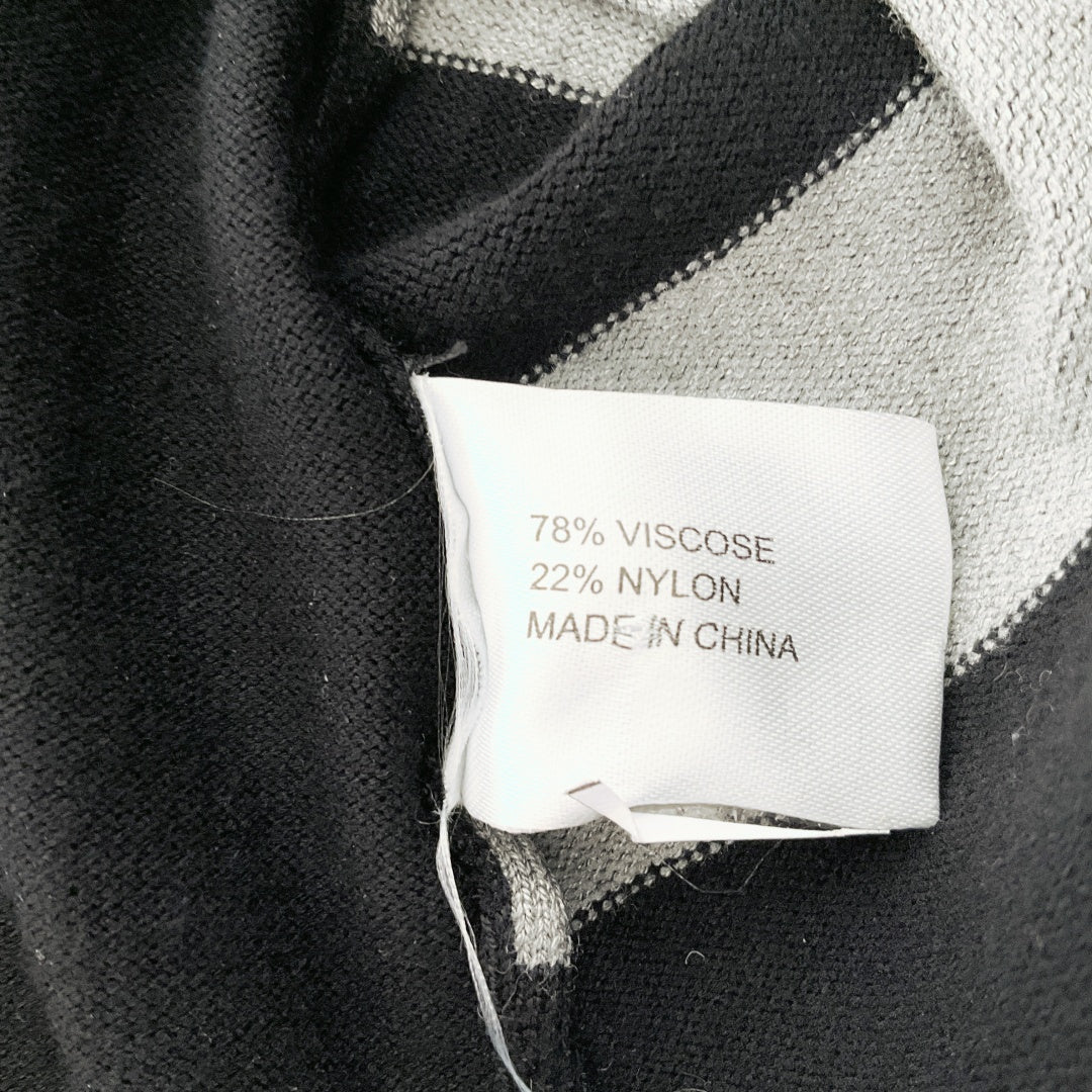 Add a modern twist to your wardrobe with this Signify Striped Patchwork Knit Top, blending black and grey tones in a sleek, contemporary design. Crafted from a soft viscose-nylon mix, it offers both comfort and stretch for an easy fit in size M/L. In very good condition, this versatile piece is perfect for layering or wearing on its own.