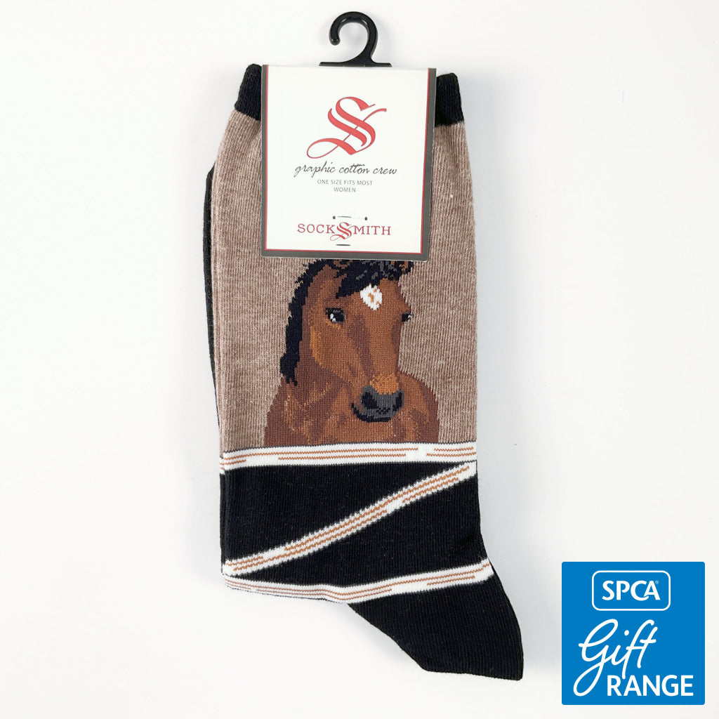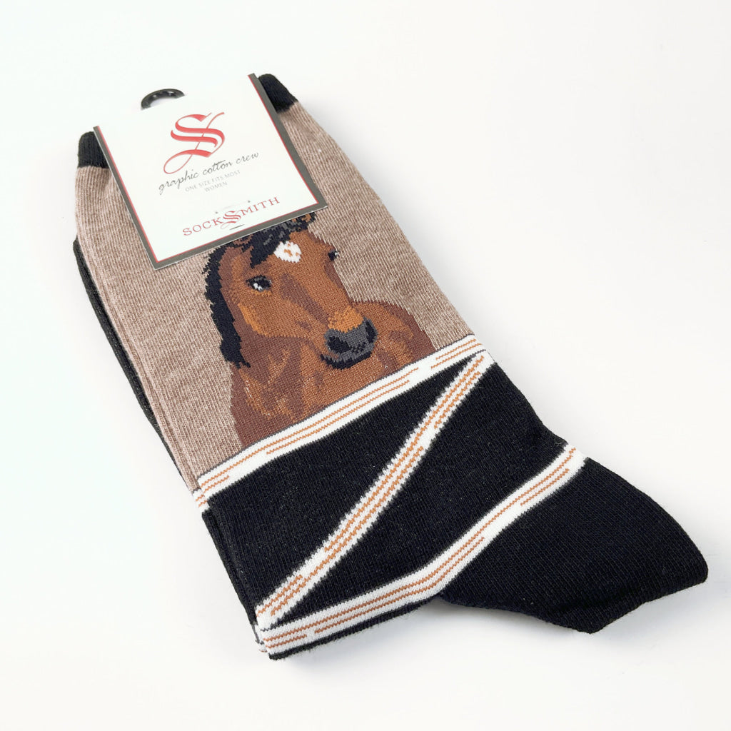 New pair of women's socks by Sock Smith. The black and brown patchwork socks have cute little horse patterns on them. Soft touch comfortable cotton socks with ribbed cuff tops so your socks stay up all the time.