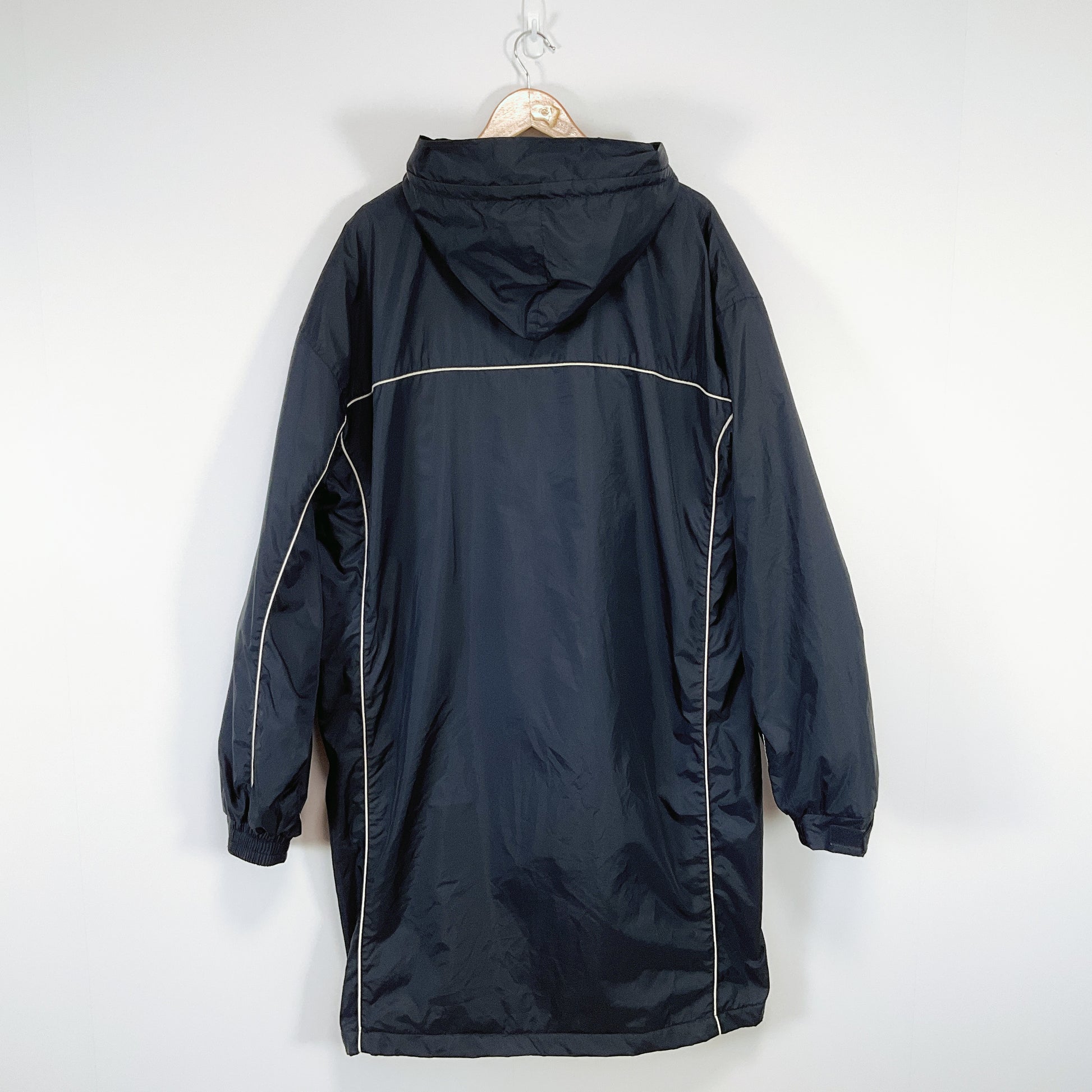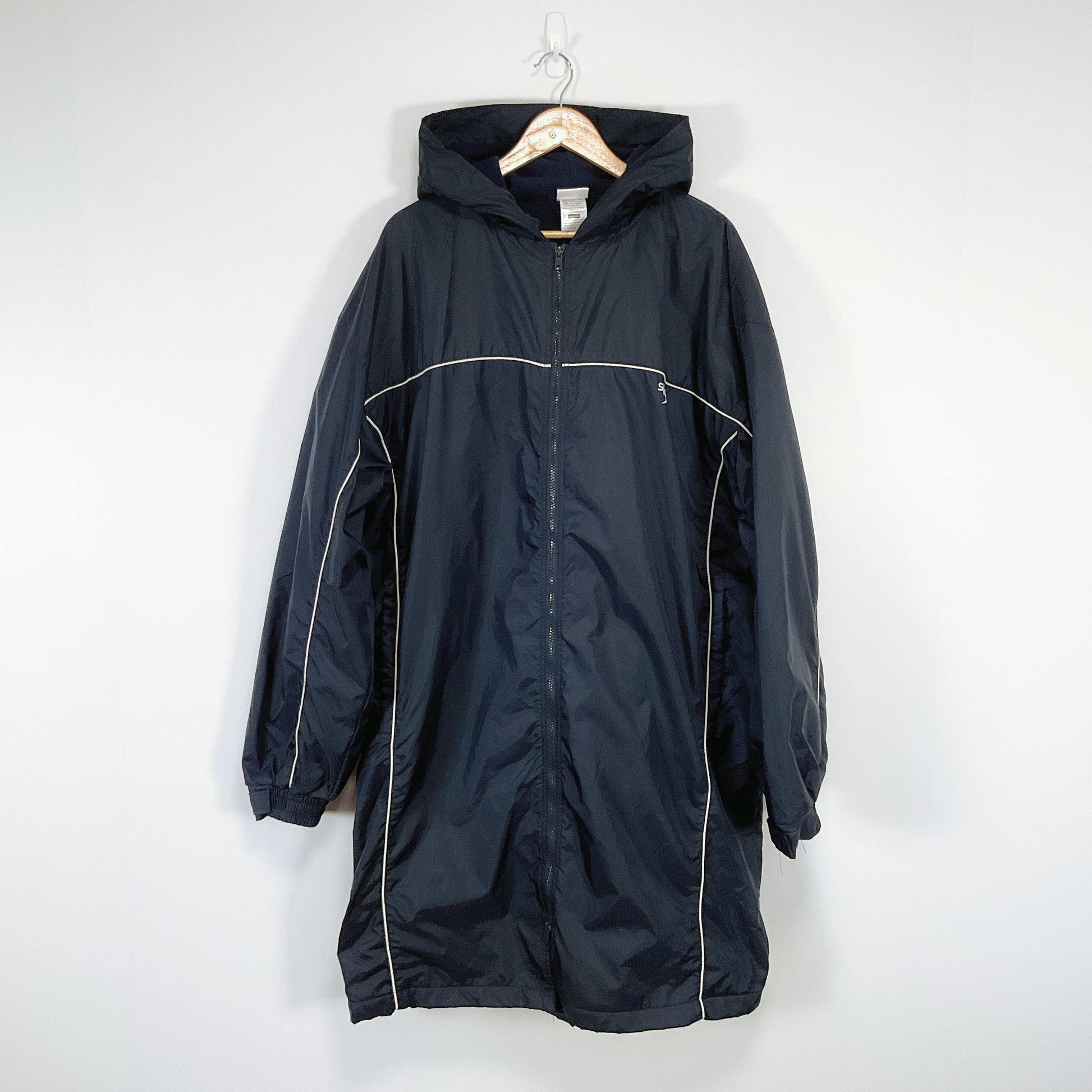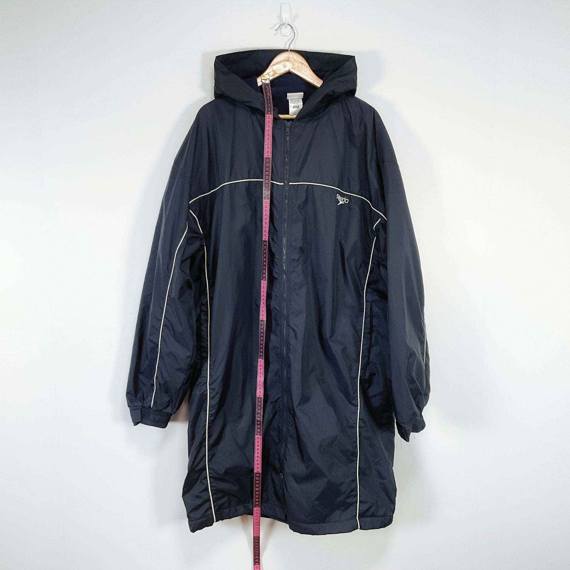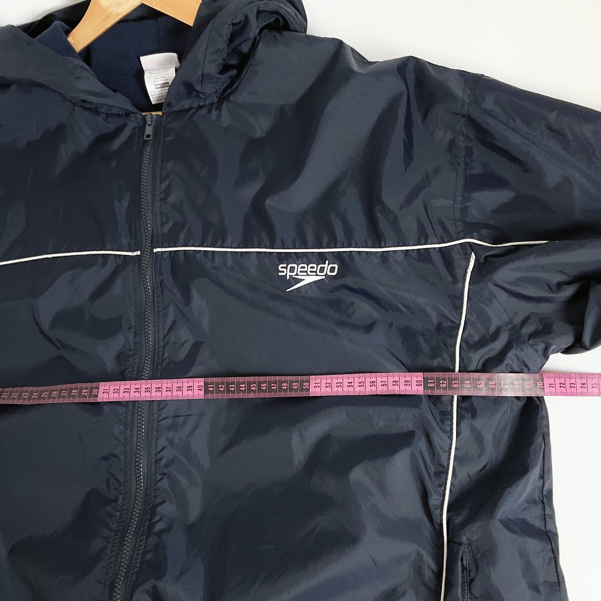 Classic navy longline coach-style jacket by Speedo, with a full zip front, hood, and contrast piping. Made with a nylon shell and polyester lining — perfect for layering on chilly training days or post-swim cover-up.
