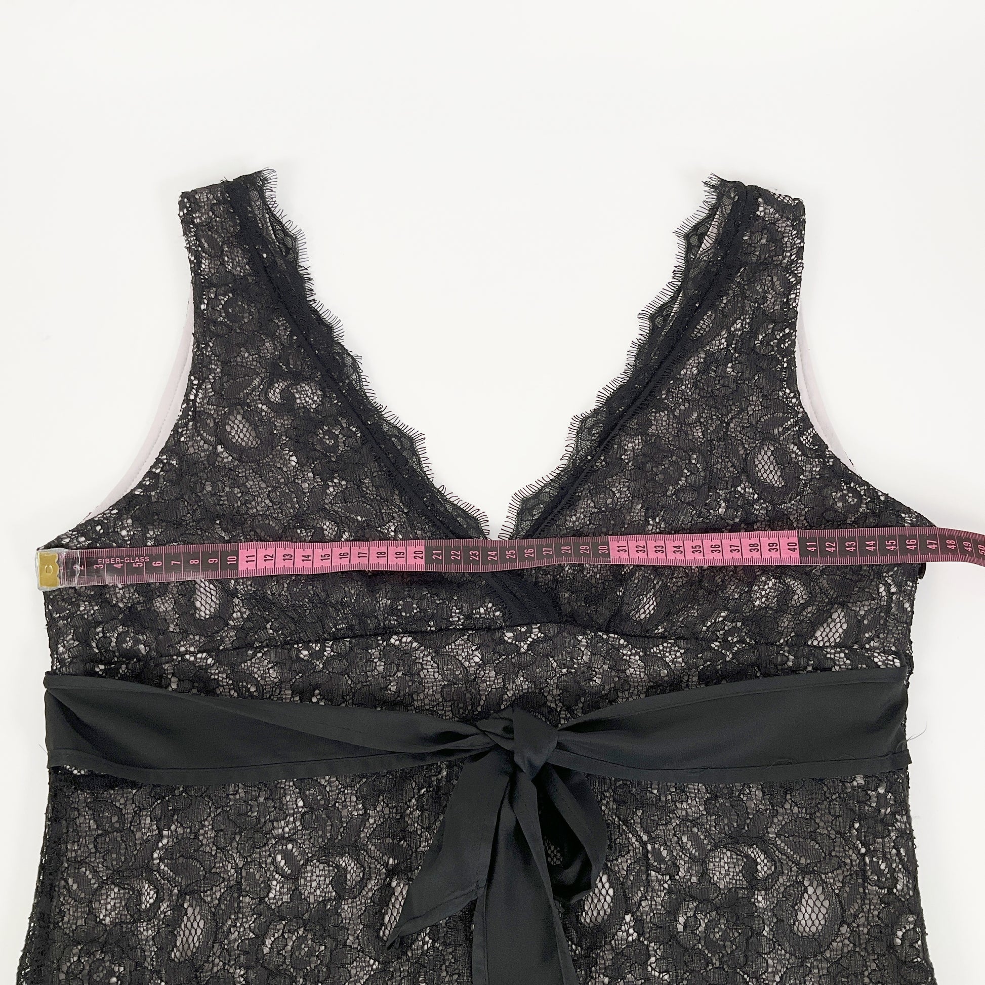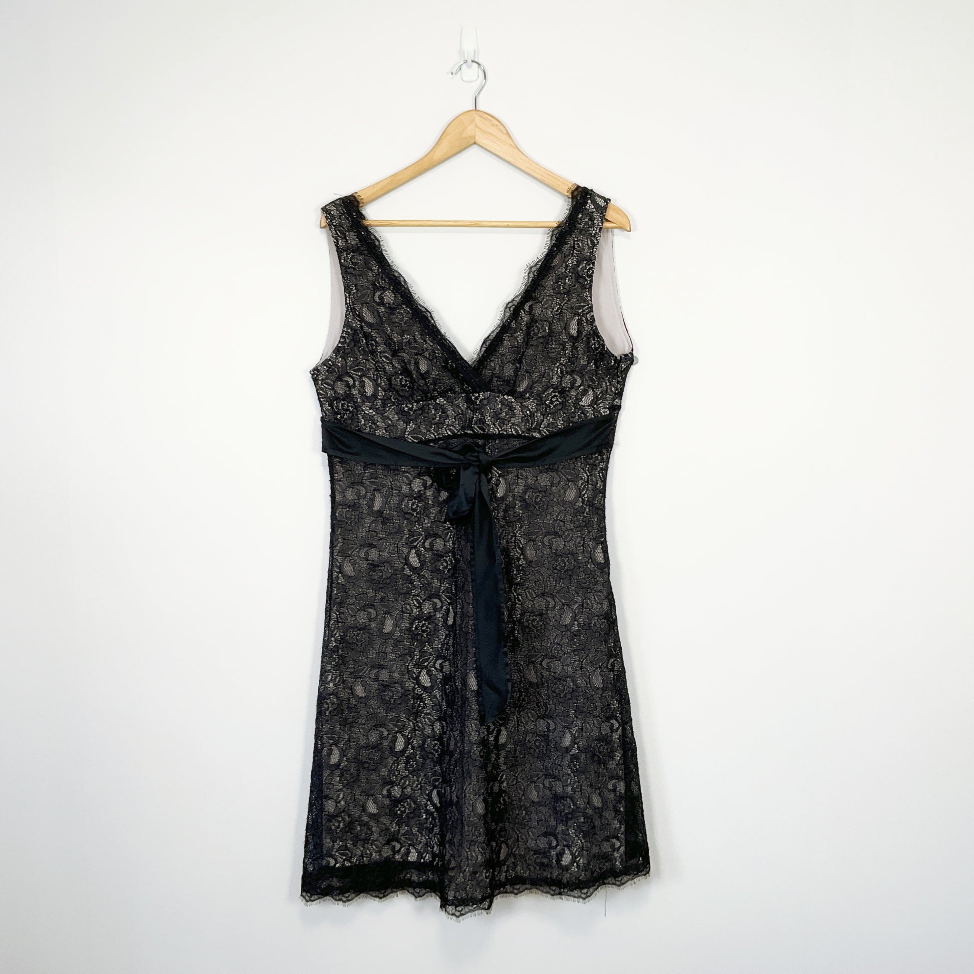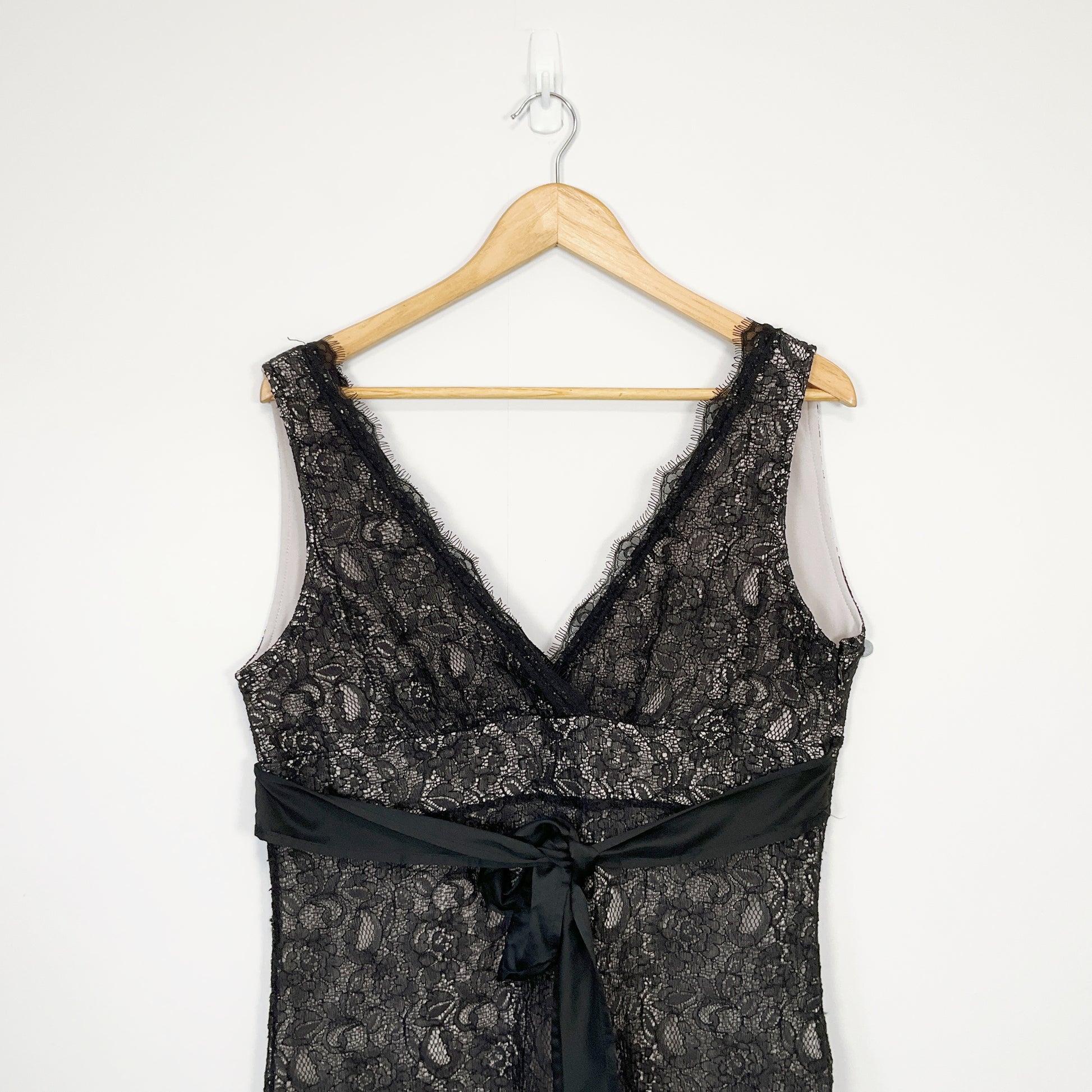 This is a black lace dress by STAXA. It features a V-neckline, a satin ribbon at the waist, and a knee-length hem.