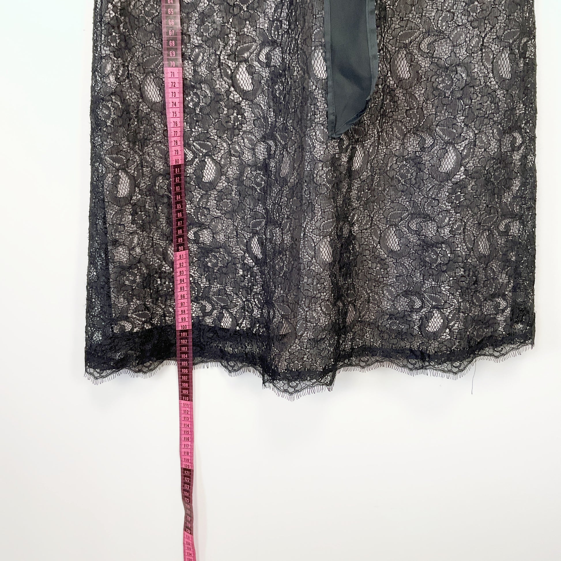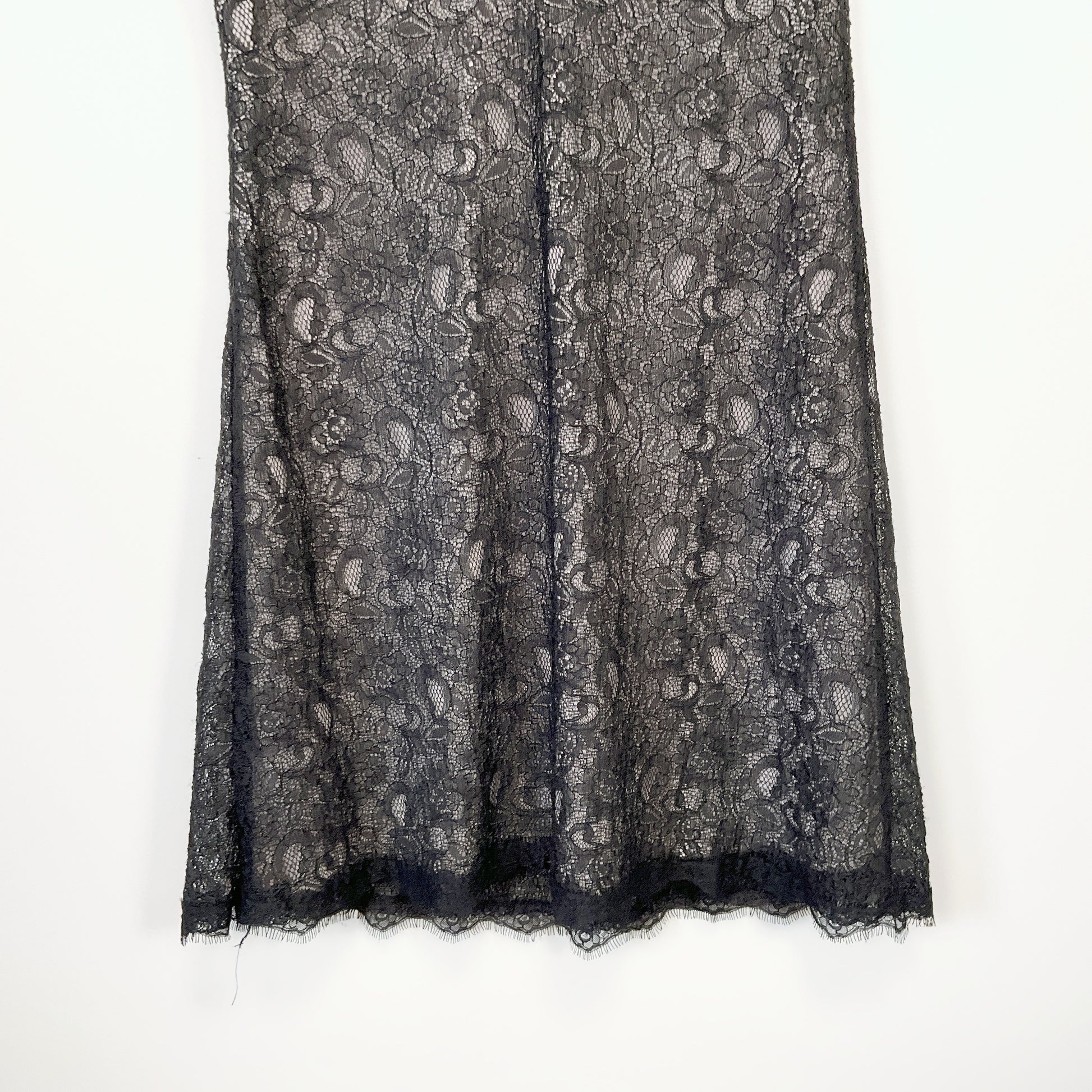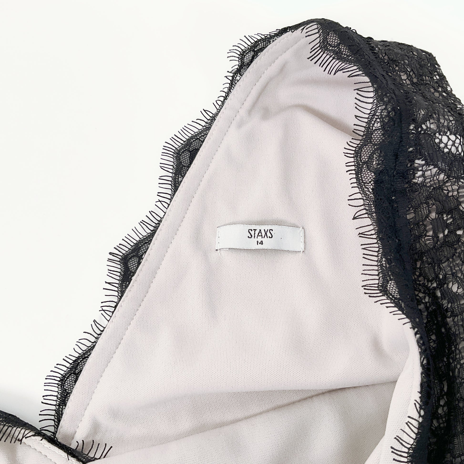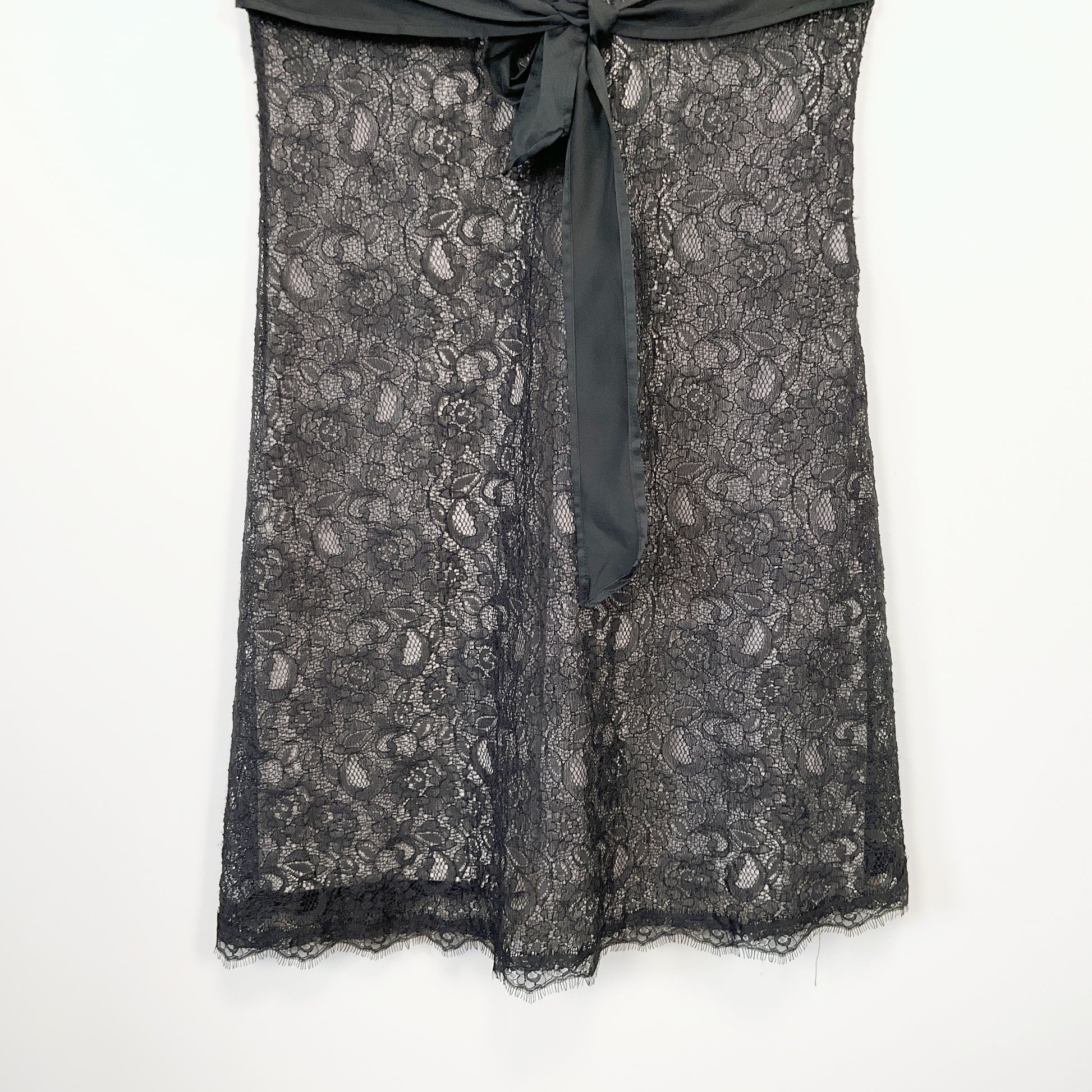 This is a black lace dress by STAXA. It features a V-neckline, a satin ribbon at the waist, and a knee-length hem.