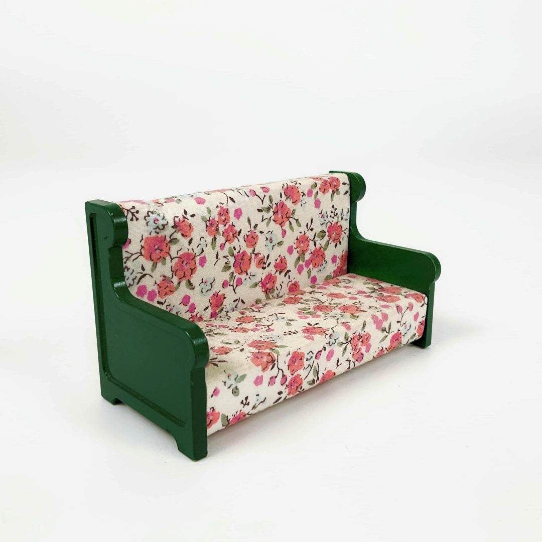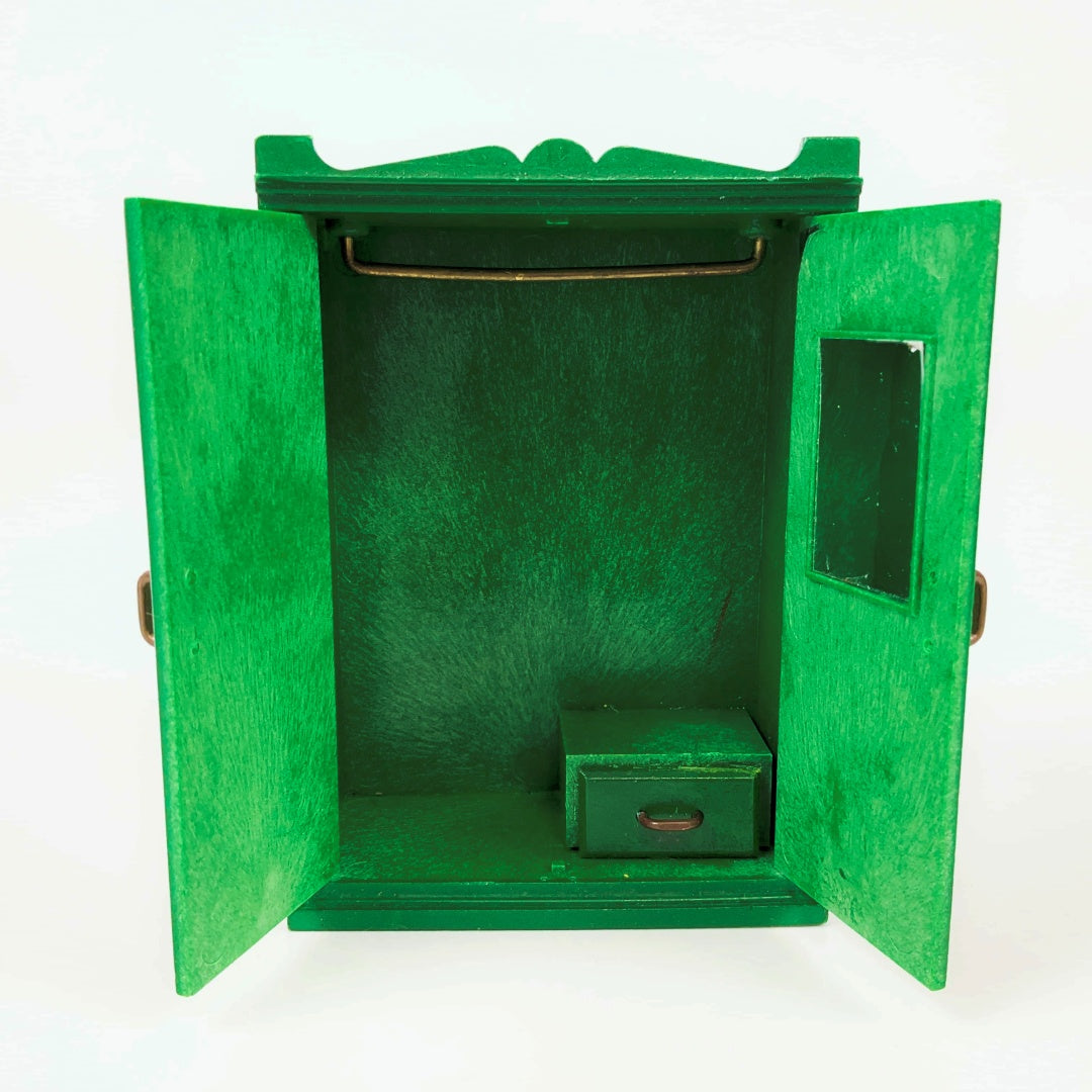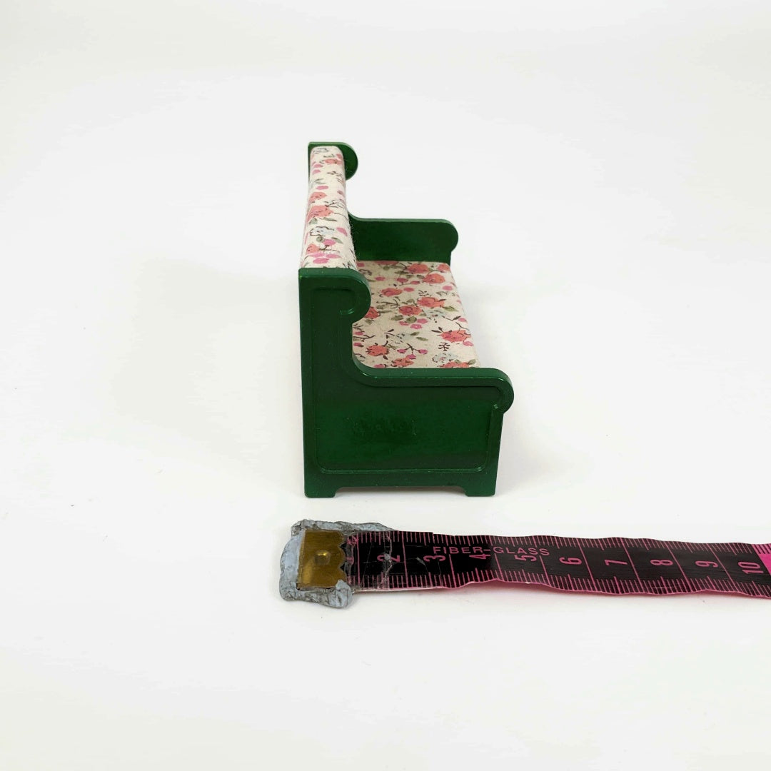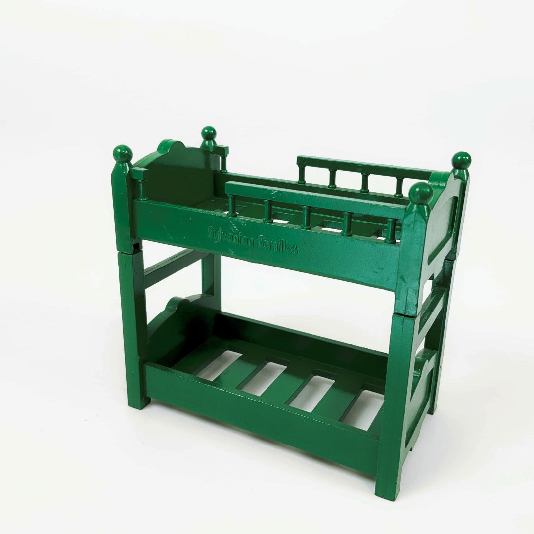 A miniature dollhouse furniture set arranged together with small mole figures. The furniture includes a green bunk bed, green wardrobe, a floral-patterned green sofa, a wooden dresser, a sink cabinet with a faucet, a white bathtub, and a black stove. Four small mole dolls are placed in different positionsβtwo sitting on the sofa, one in the lower bunk bed, and one reclining in the bathtubβcreating a playful domestic scene.