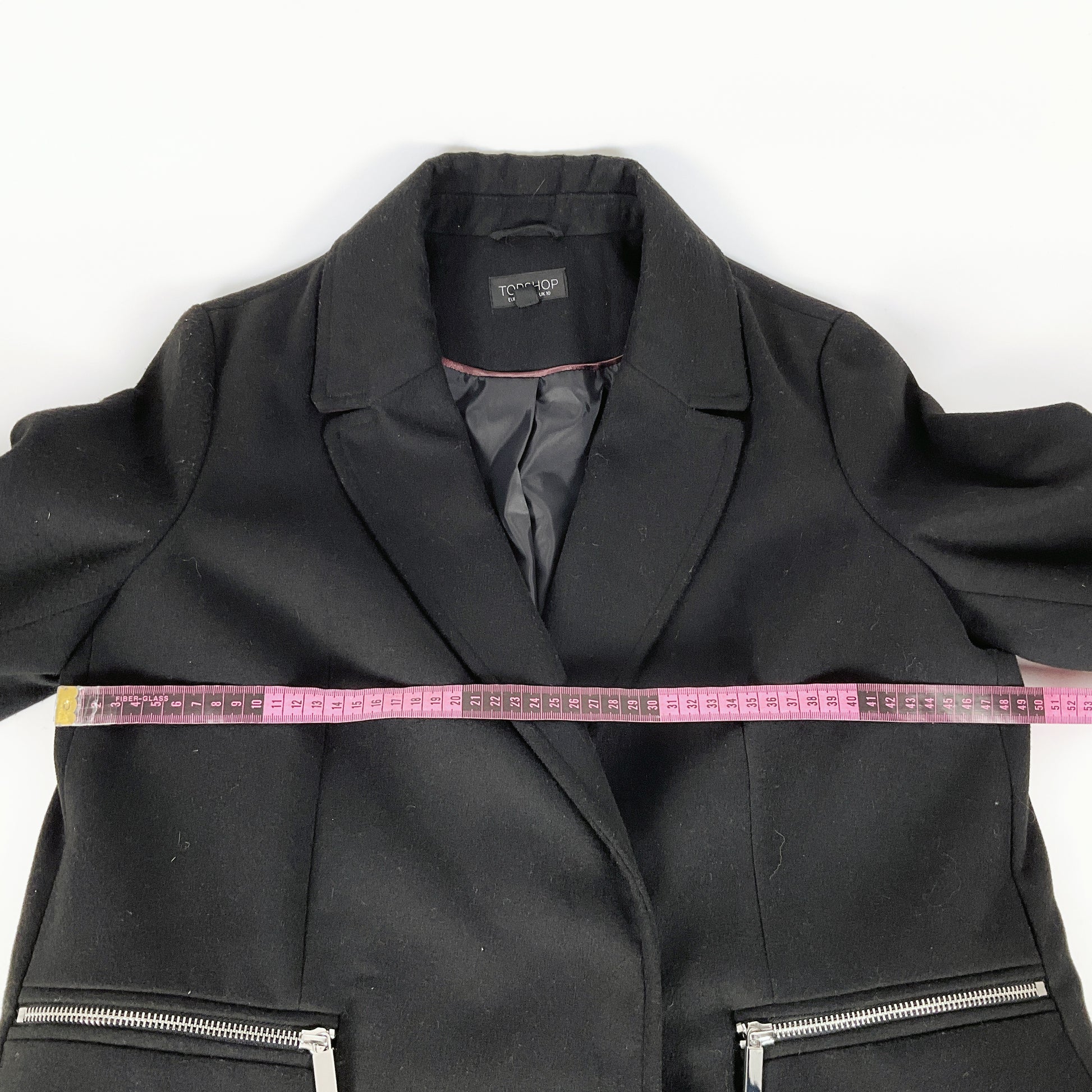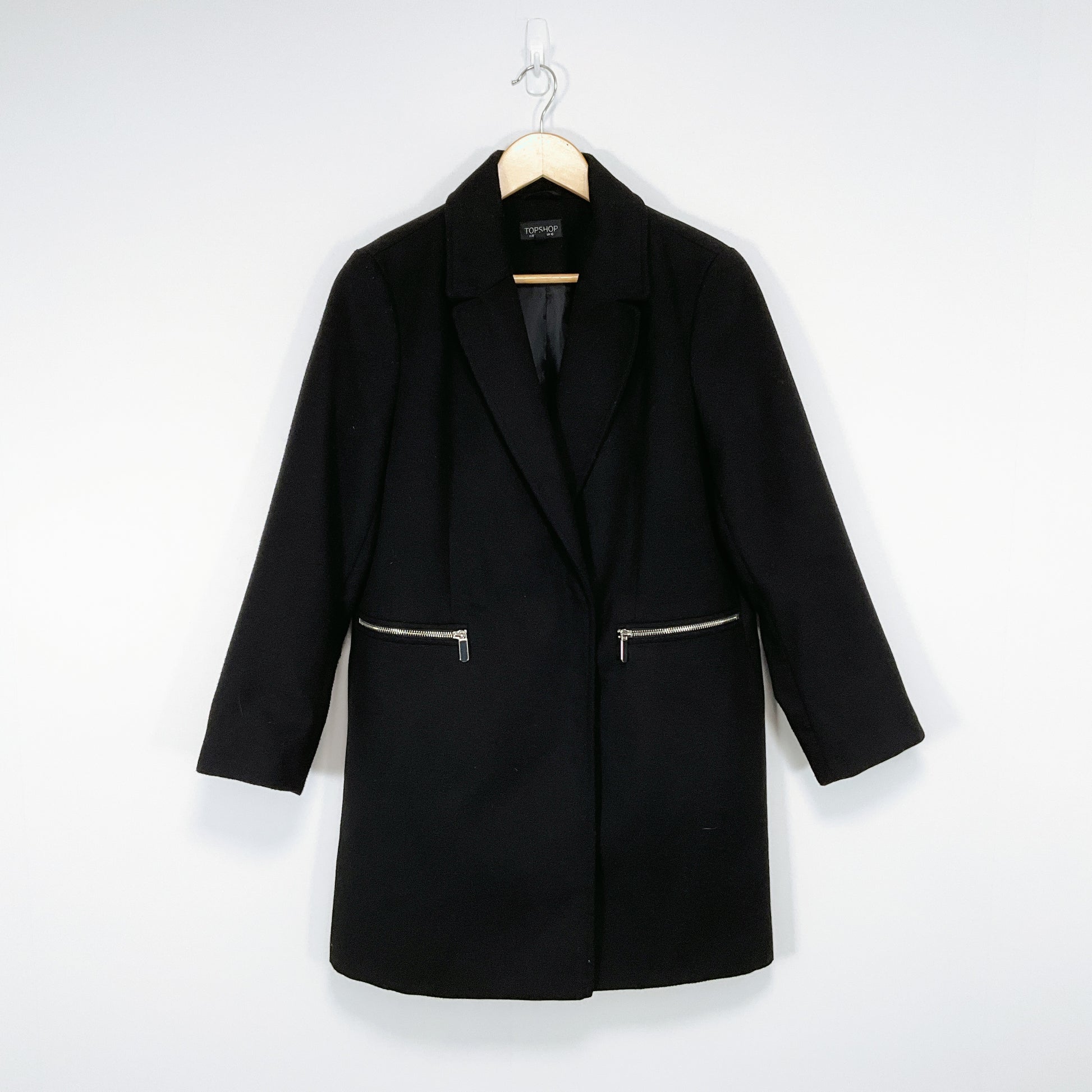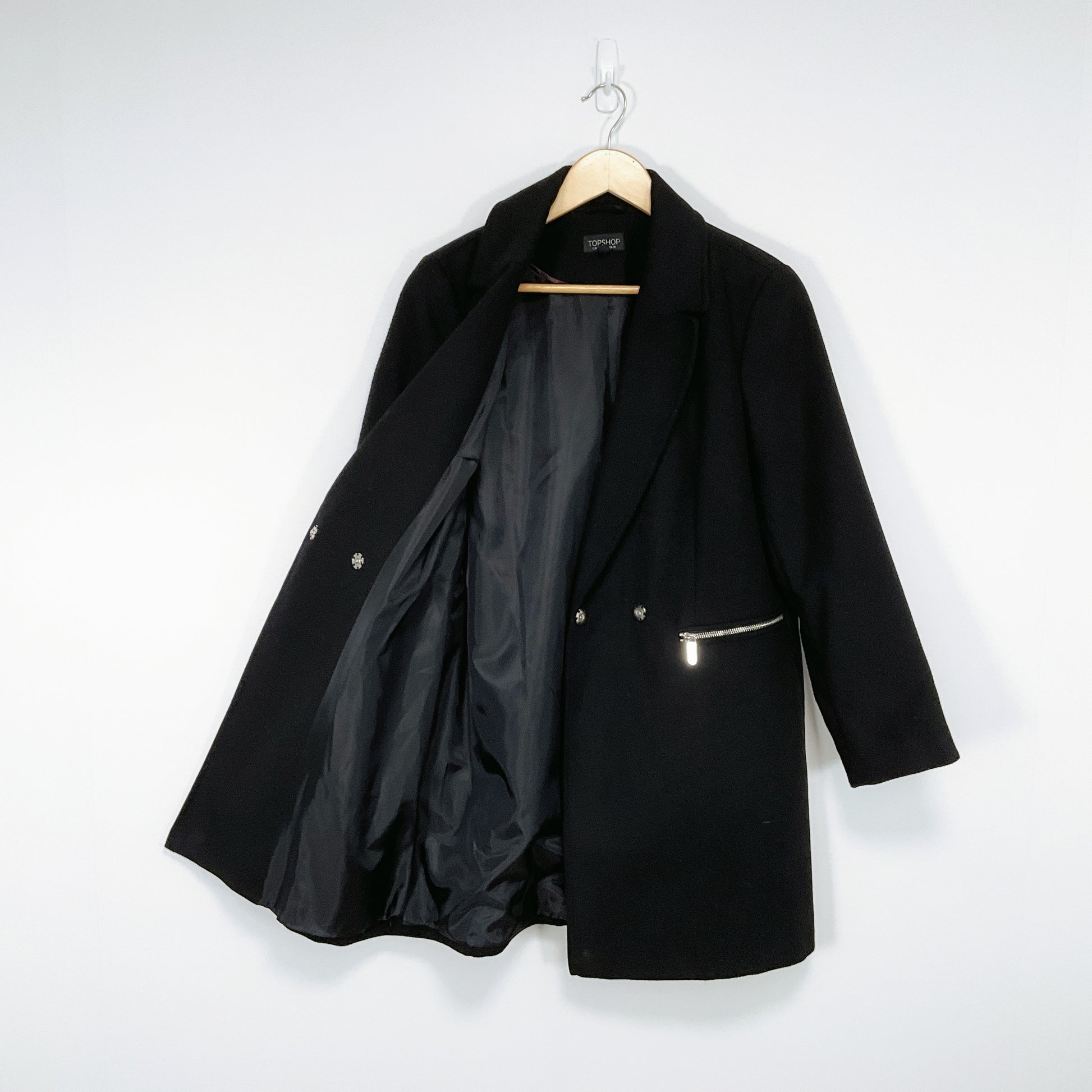 This black jacket features a sleek, modern design with two front pockets accented by horizontal silver zippers for a touch of edge. The structured cut offers a flattering fit, making it a versatile piece that transitions easily from day to night. Perfect for adding a polished yet contemporary vibe to any outfit.