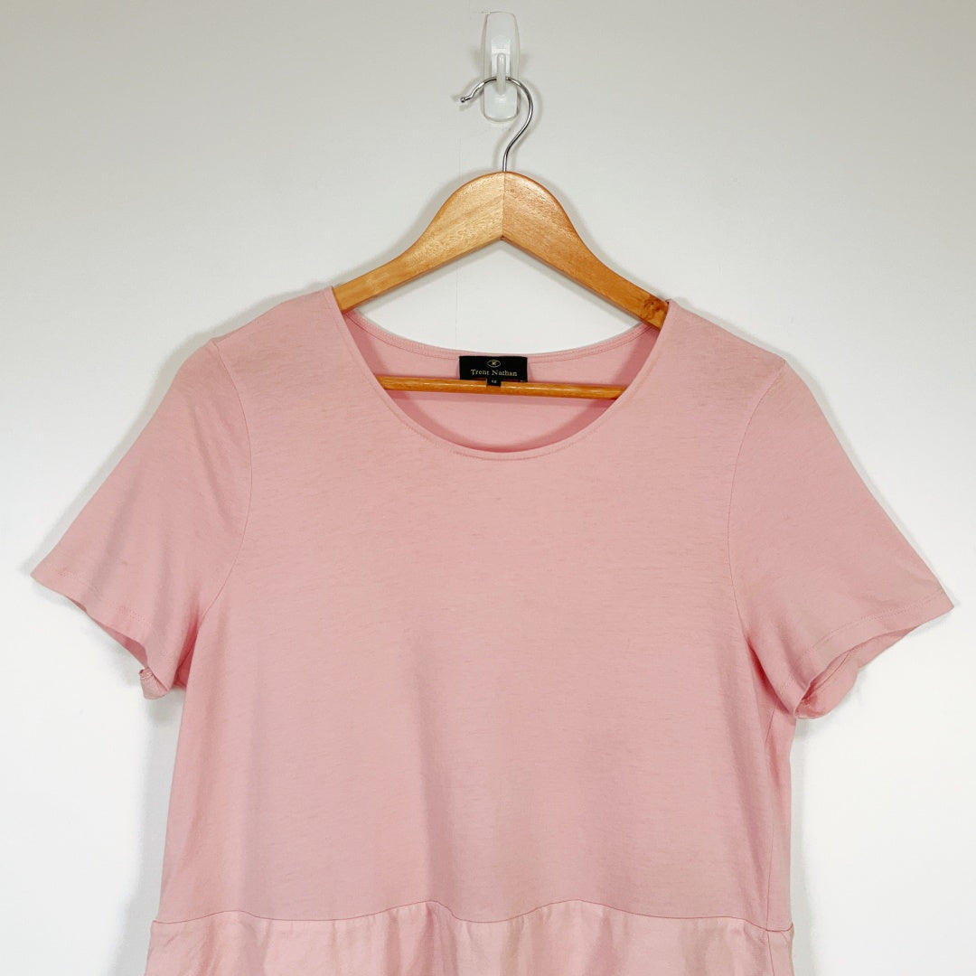 Feminine and comfortable pink top featuring a soft fabric and a flattering ruffle peplum hem. Perfect for everyday wear or a relaxed weekend outfit.