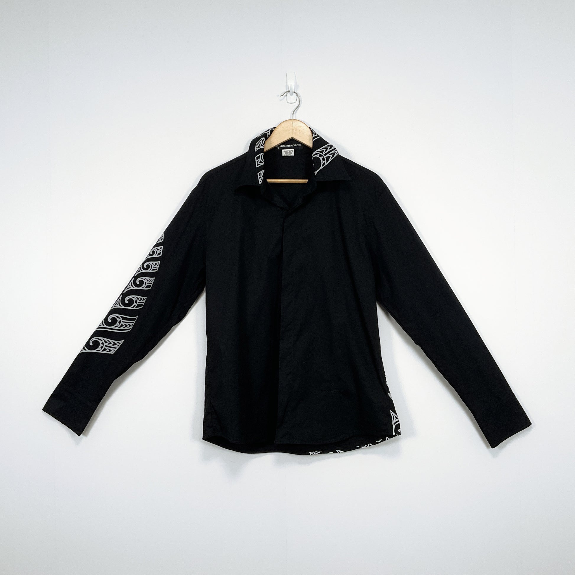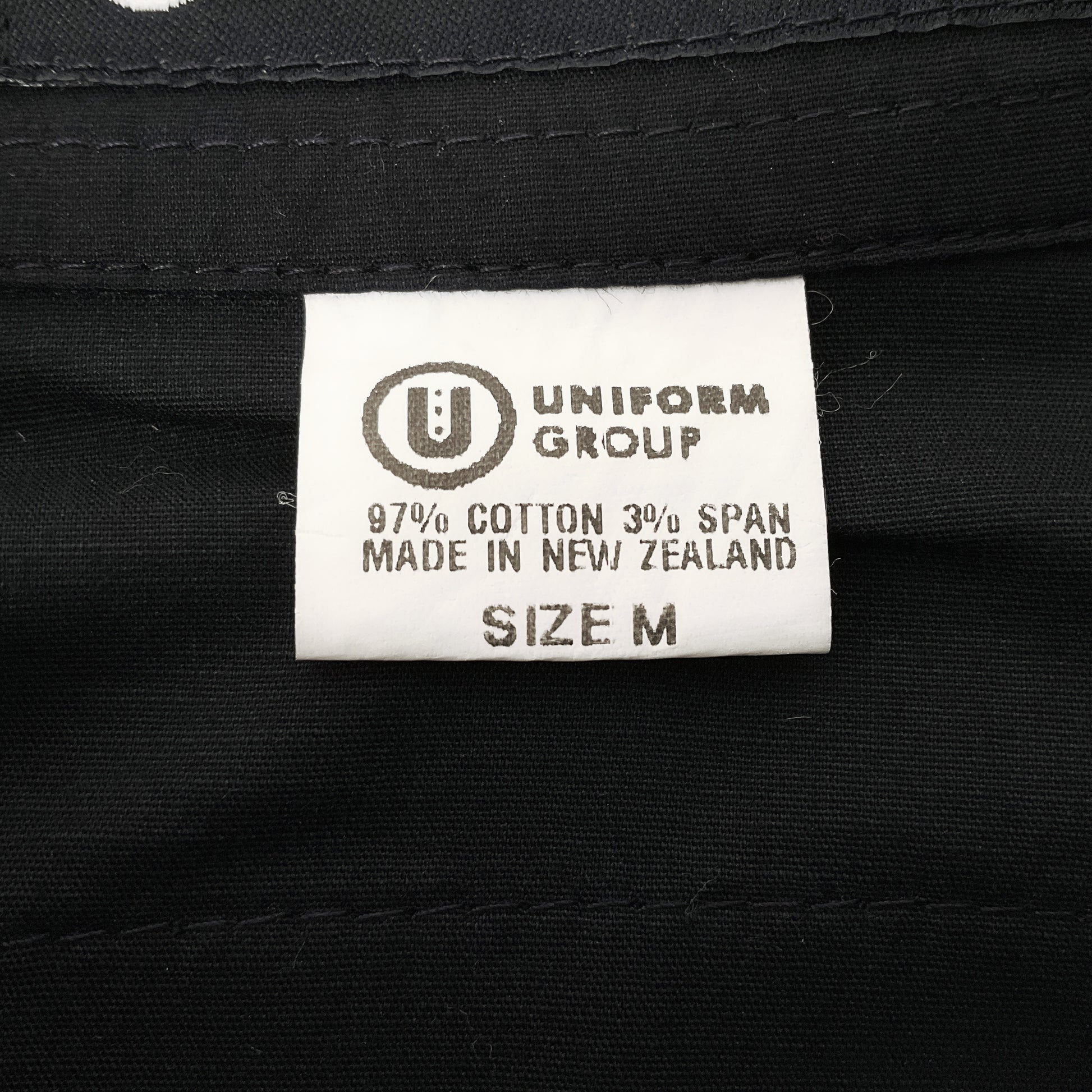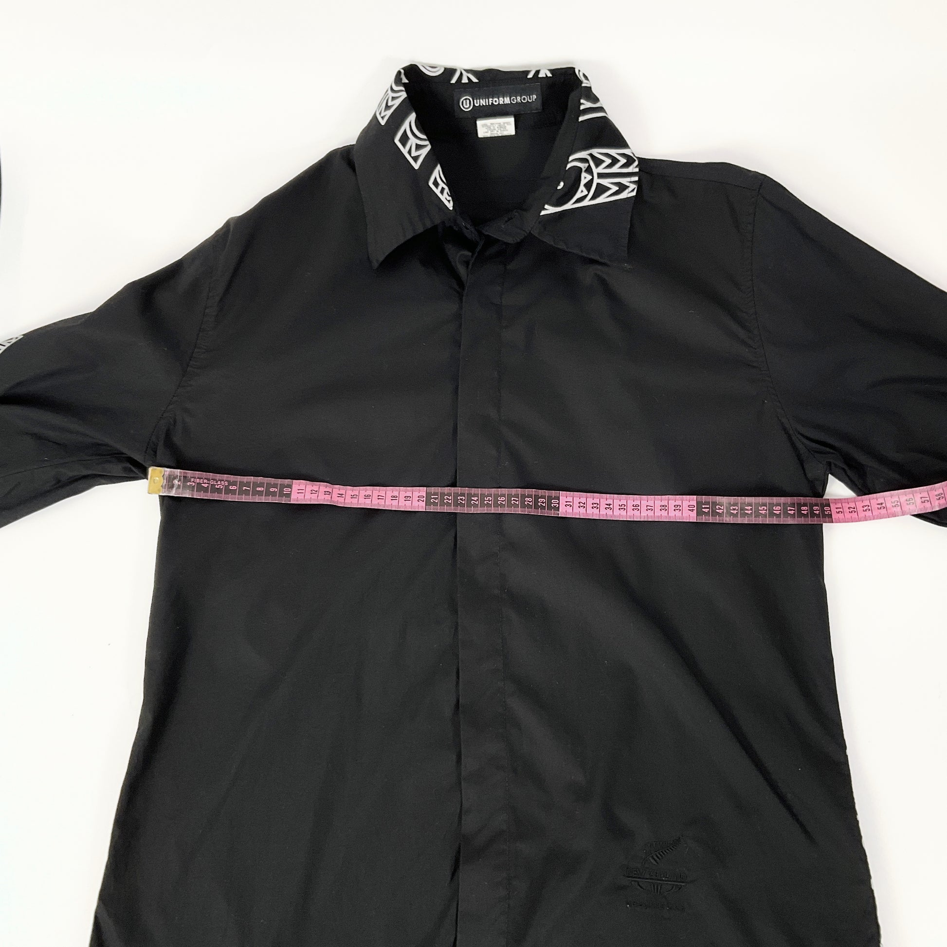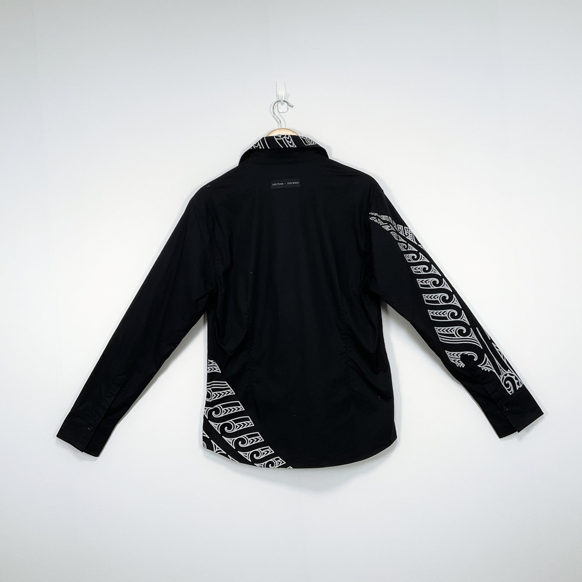 This sleek black long-sleeve shirt by Uniform Group blends formal style with athletic heritage. Made from 97% cotton and 3% spandex for comfort and stretch, it features white printed Māori-inspired motifs on the sleeve and collar, plus “New Zealand Melbourne 2006” branding on the lower front. The back is stamped with the inspiring slogan: “One team, one spirit.”