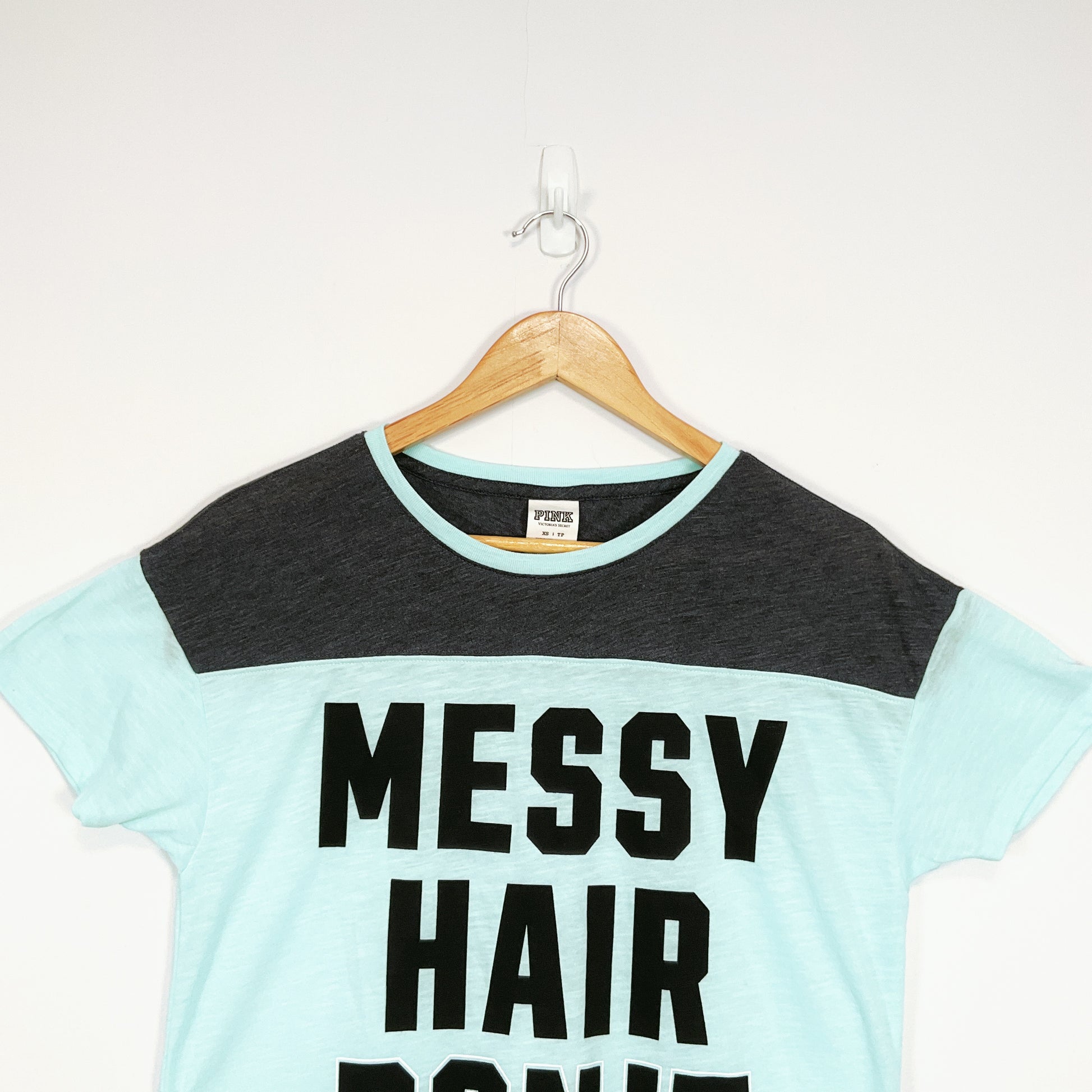 Light aqua and black short sleeve tee from PINK by Victoria’s Secret, featuring “ Messy Hair Don't Care” logo on front, made from a soft cotton-polyester blend. Size XS, brand new with tags.