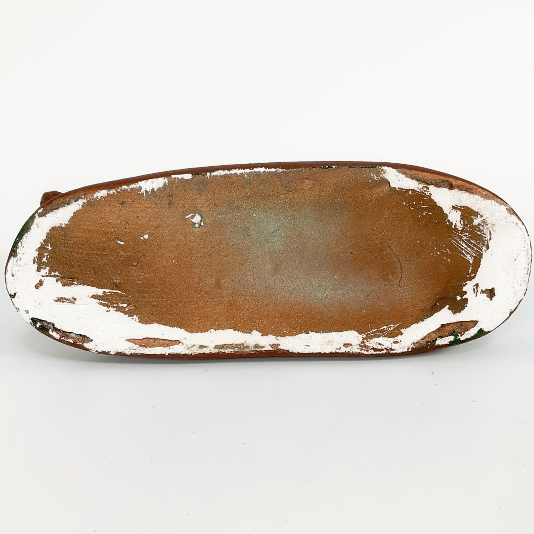 Brown clay sculpture of two horses leaning each other. The piece captures a quiet, intimate moment between the animals. Made from unglazed brown clay with visible texture and detail. There are a few small chips on one side of it, but it remains stable and visually striking. A lovely decorative piece for a shelf.