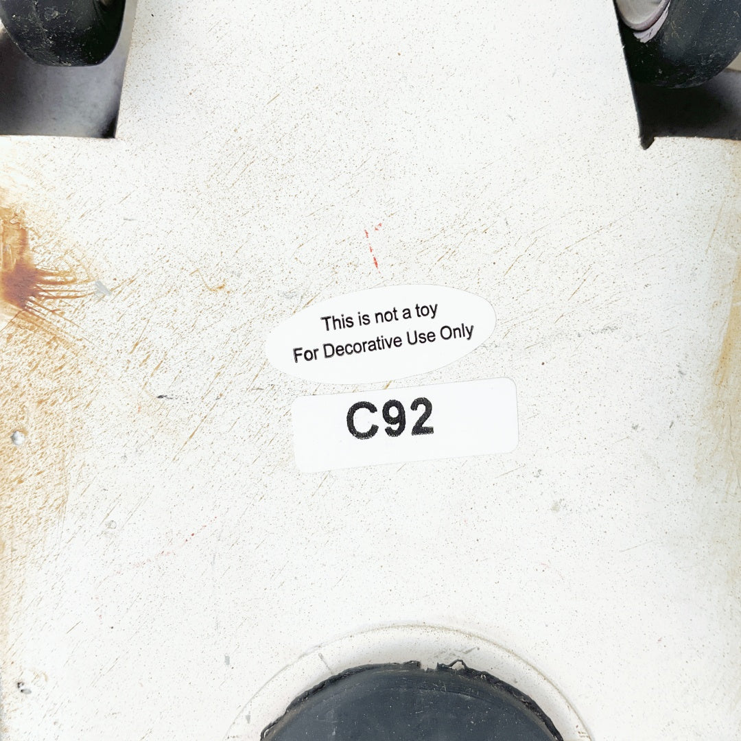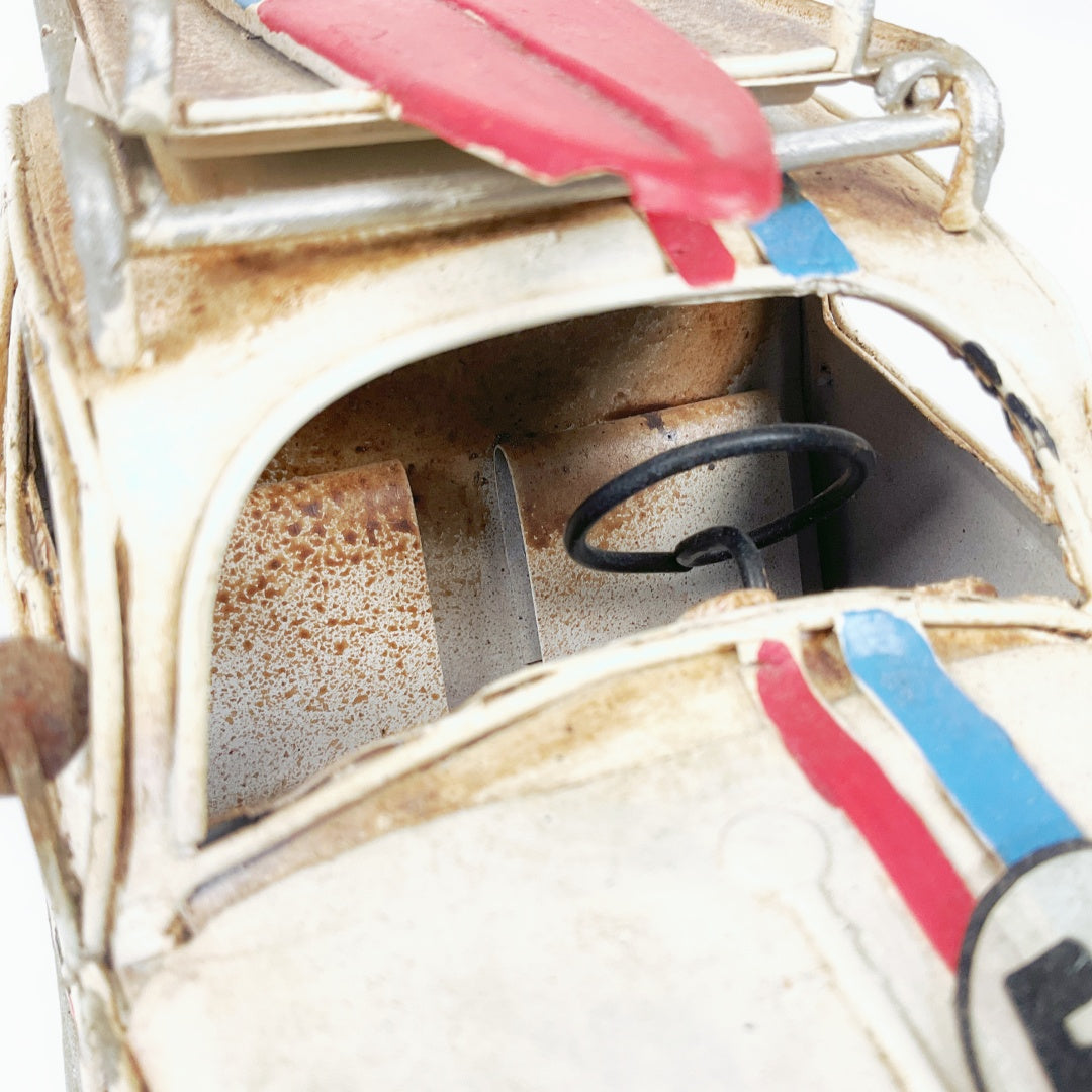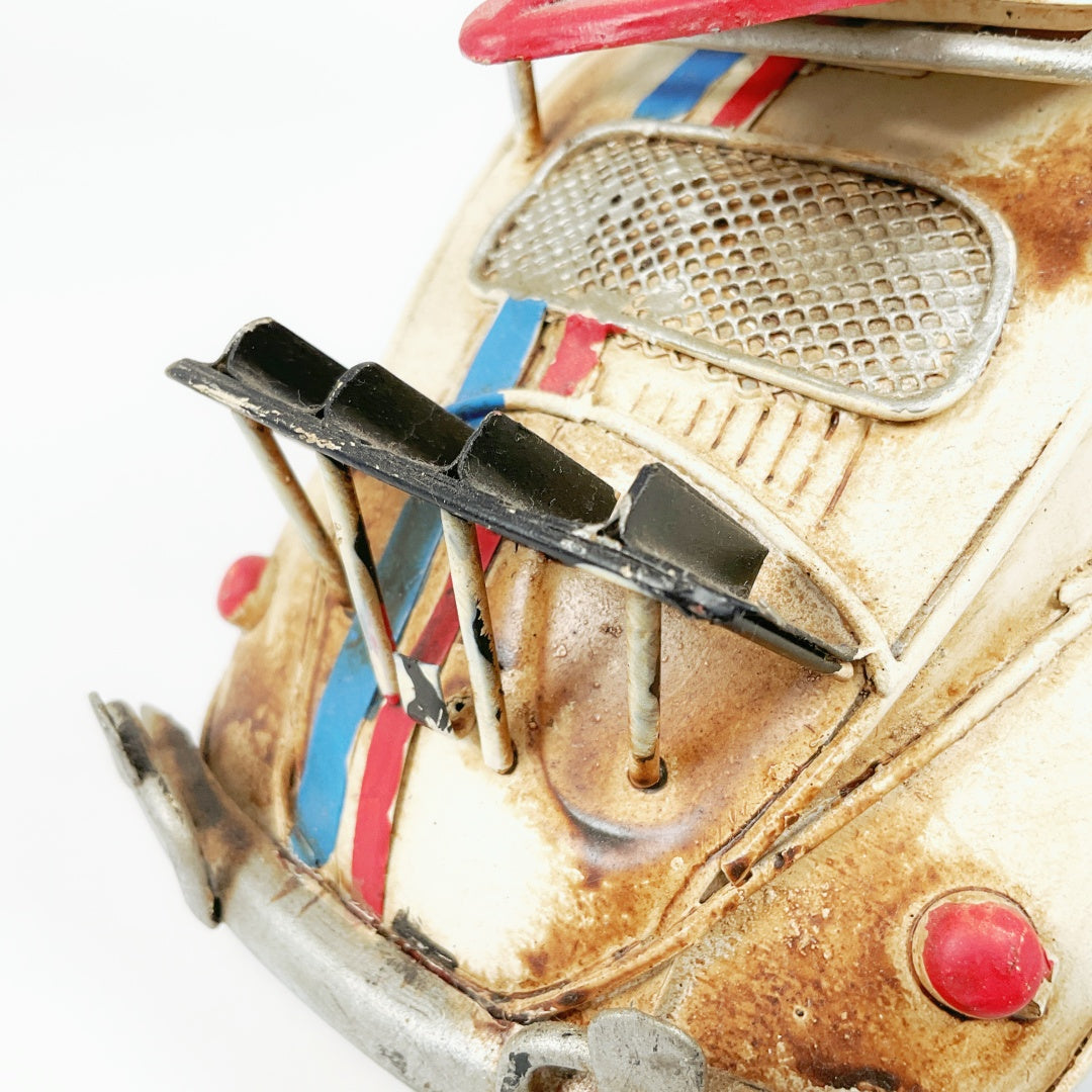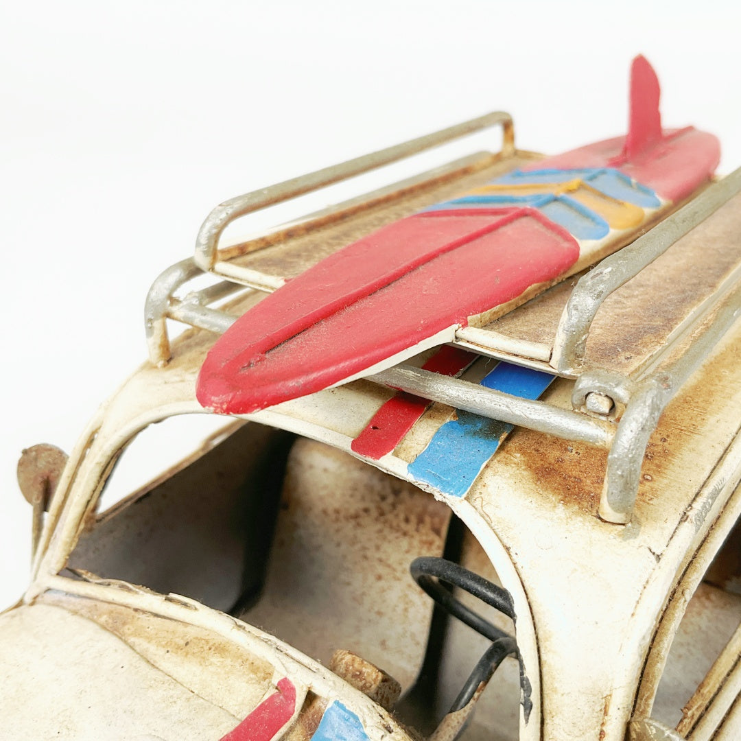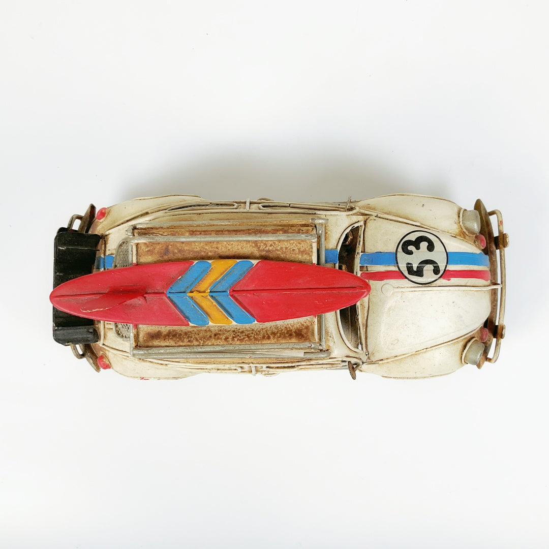 A vintage-style decorative model of a classic Volkswagen Beetle car, painted in an ย off-white color with blue and red racing stripe and the number'53'on the doors and hood. The model features intricate details like a roof rack holding two colorful surfboards, a slightly weathered finish for a retro look, and an open rear engine compartment. Perfect for display as a nostalgic collectible or beach-themed decor piece.