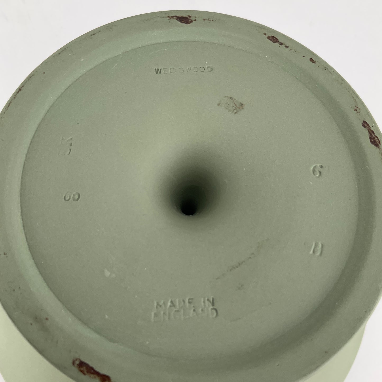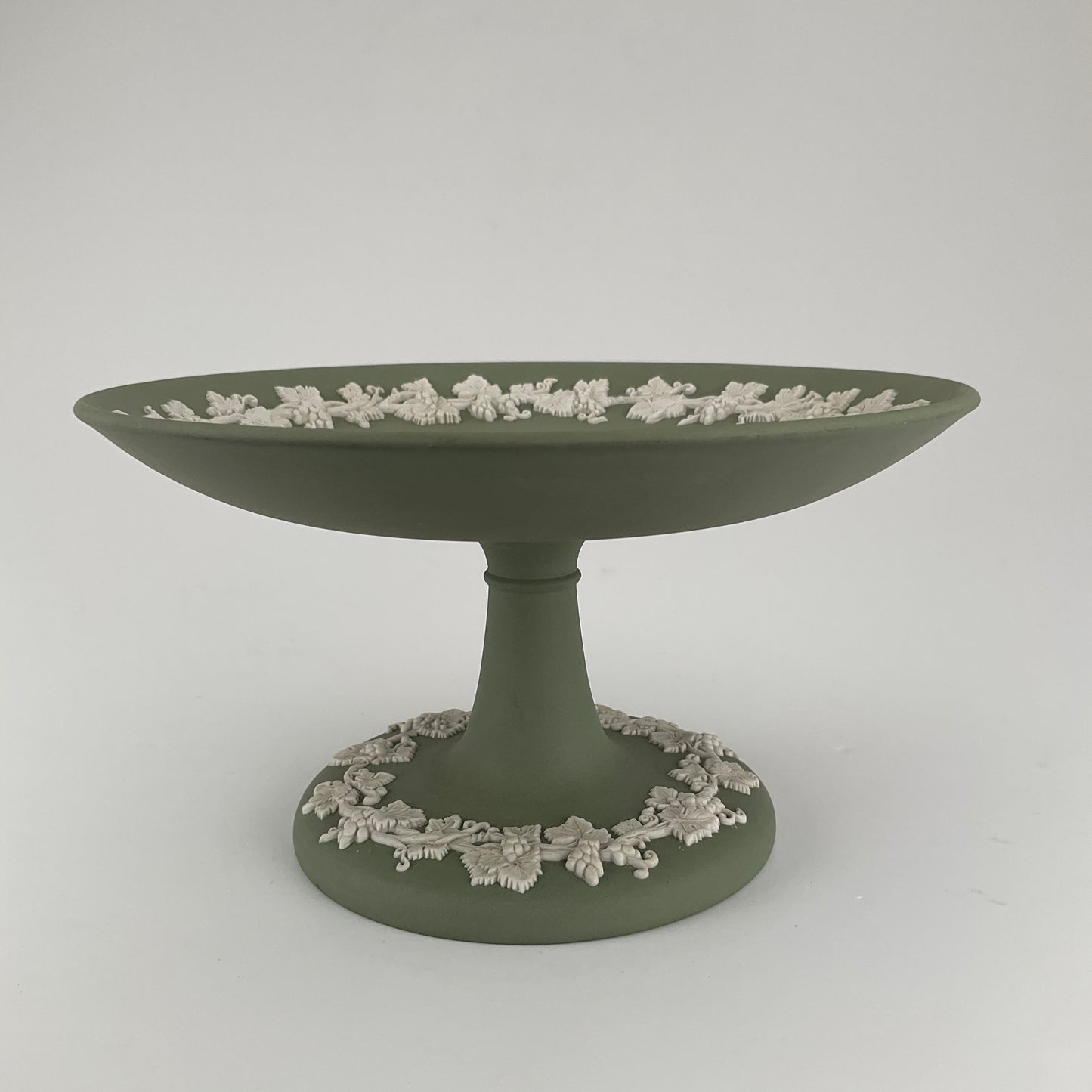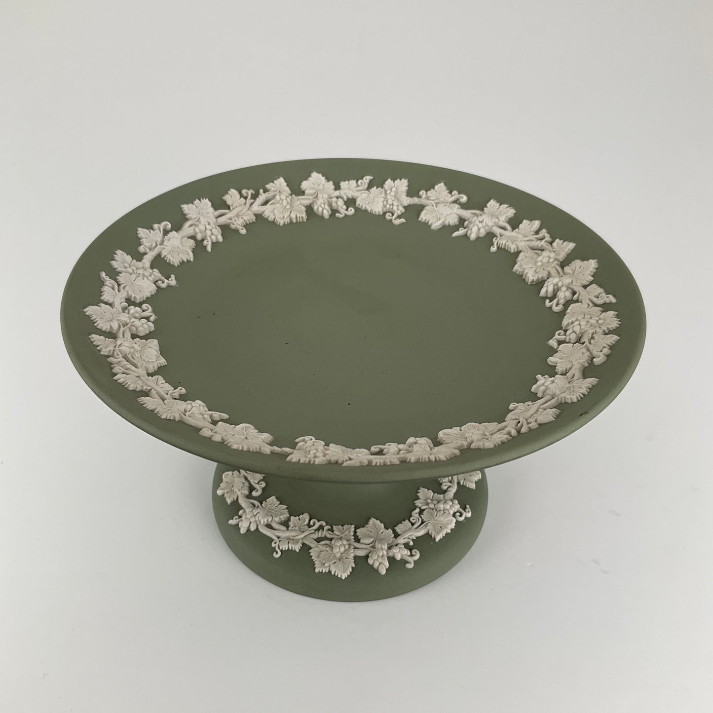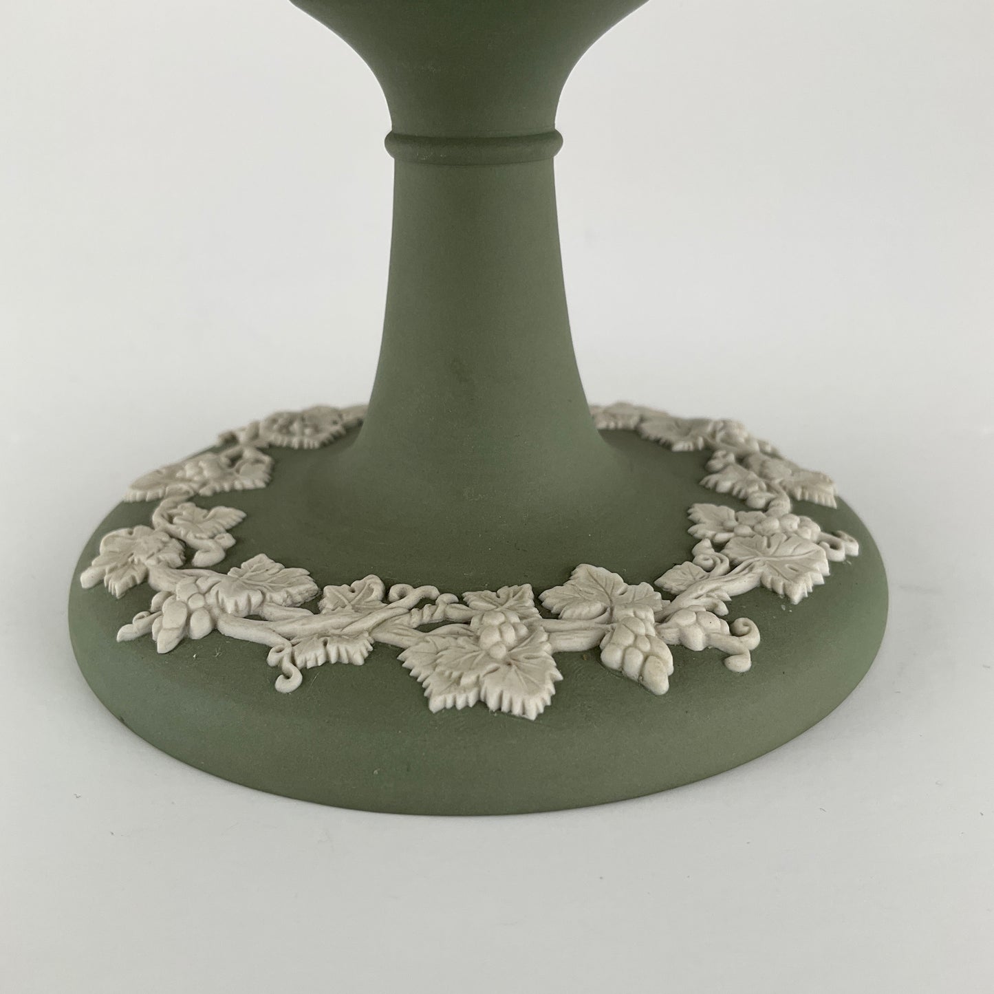 Jasperware pedestal/compote by Wedgewood. In sage green. No chips or cracks and the white floral design is intact also with no chips or cracks.