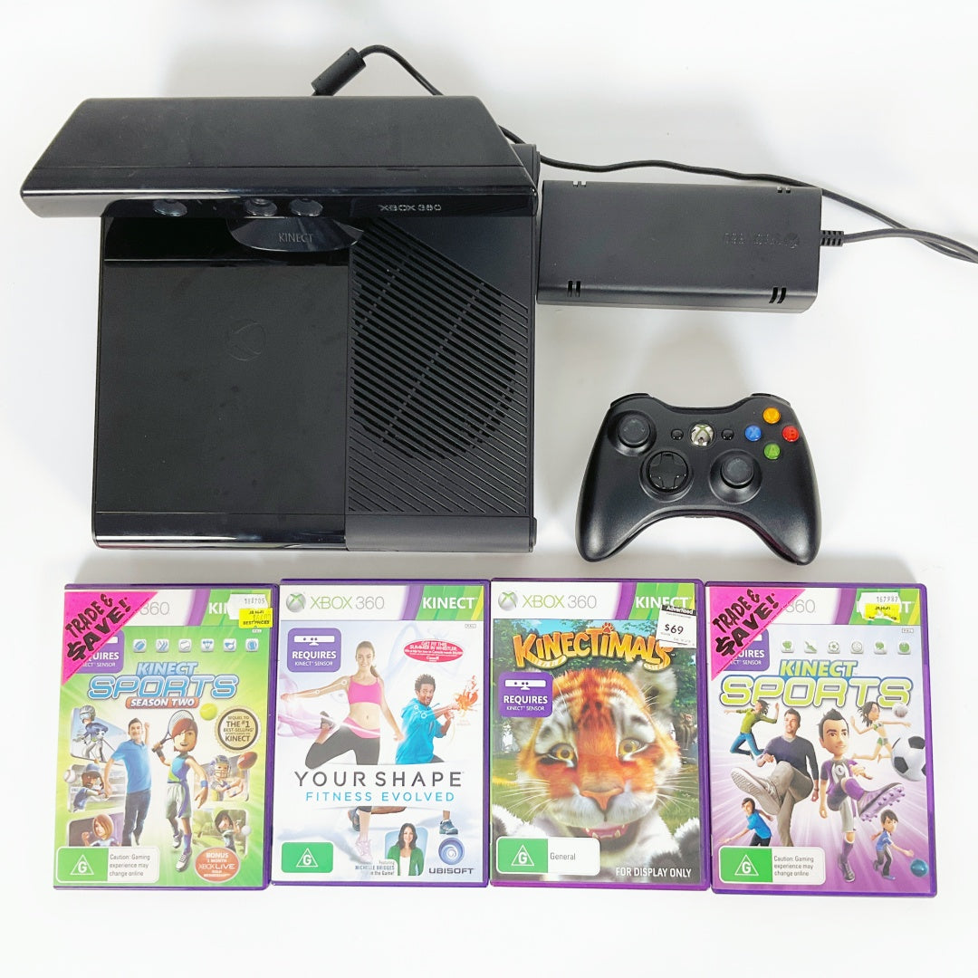 Bring fun and fitness to your living room with this complete Xbox 360 E entertainment bundle. The console comes with a Kinect motion sensor, four popular Kinect games, an original black wireless controller, and an HDMI cable β everything you need to start playing right away! Perfect for families, parties, or anyone who wants an easy and active gaming experience.