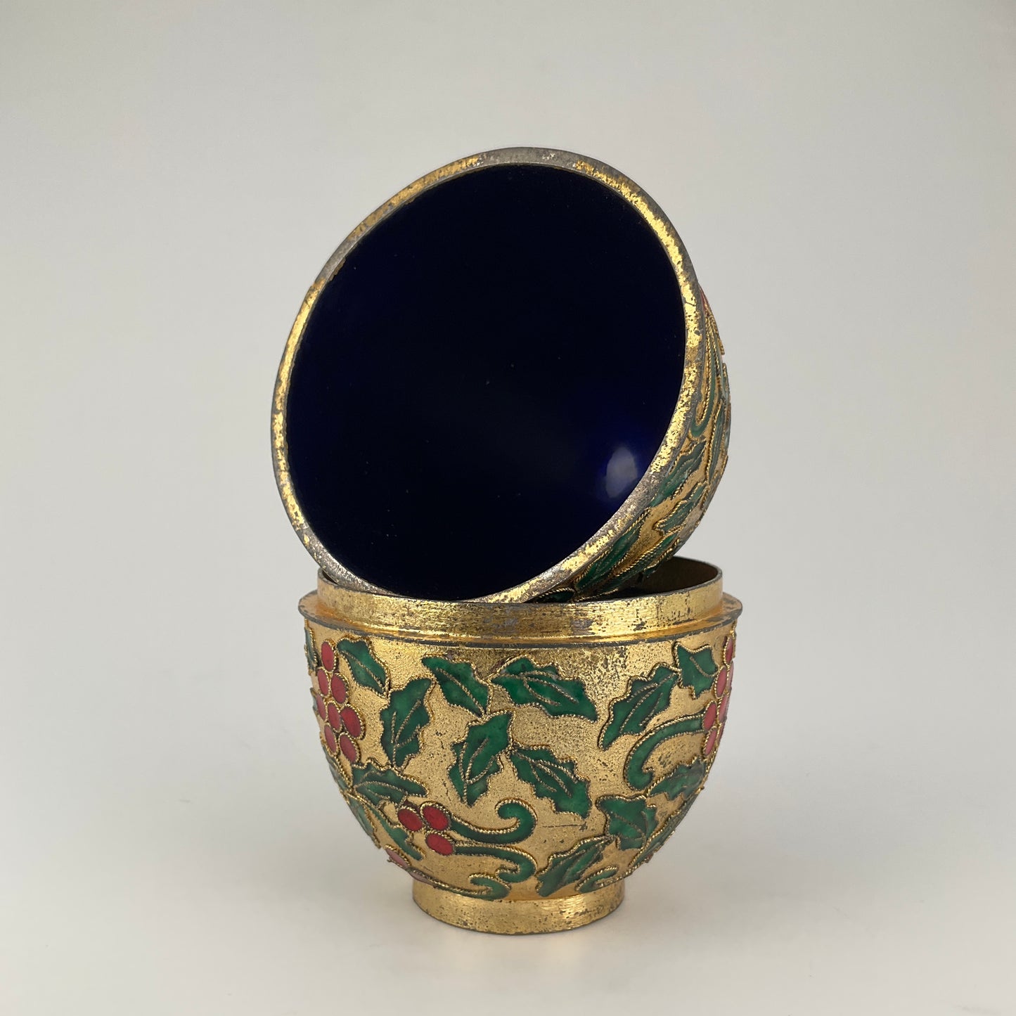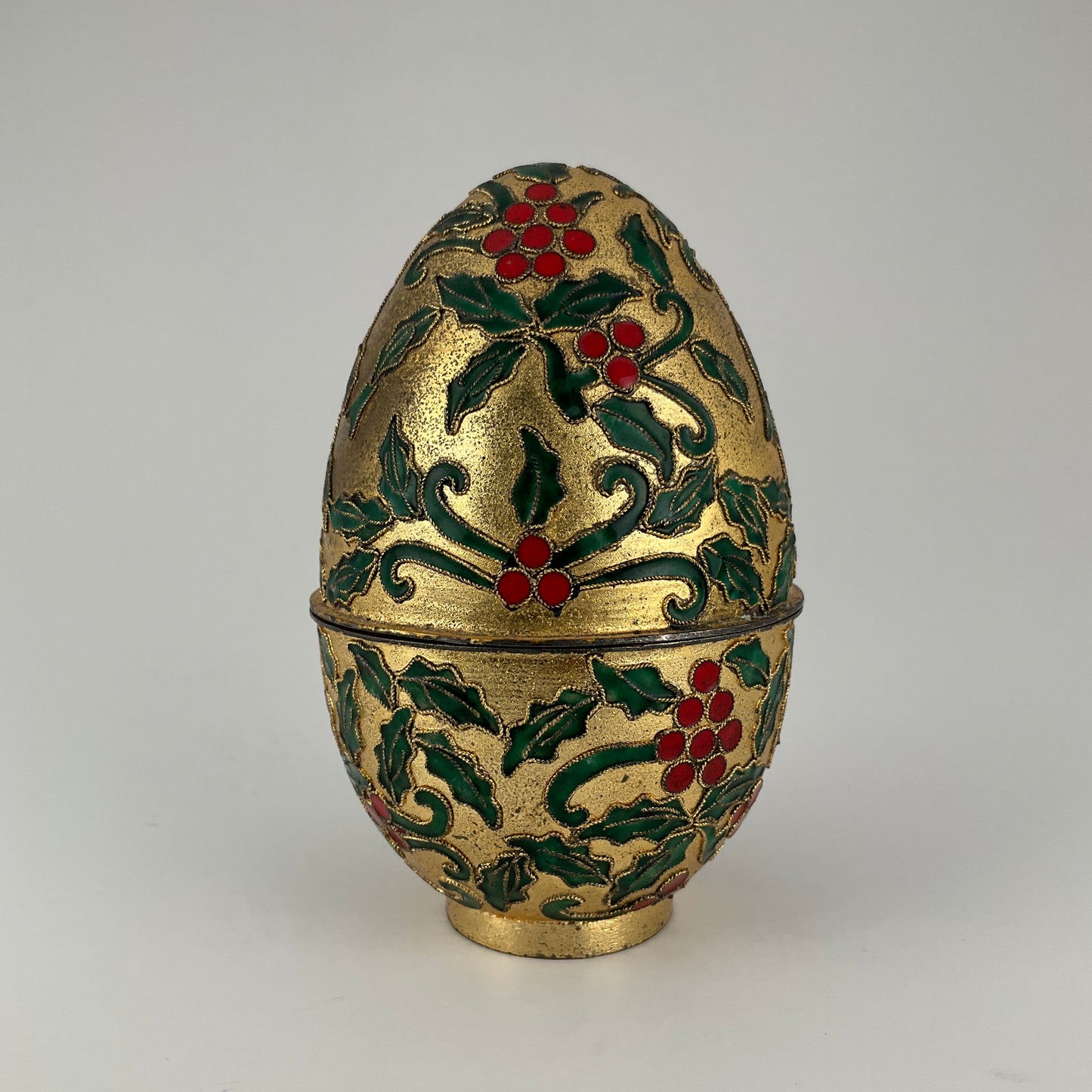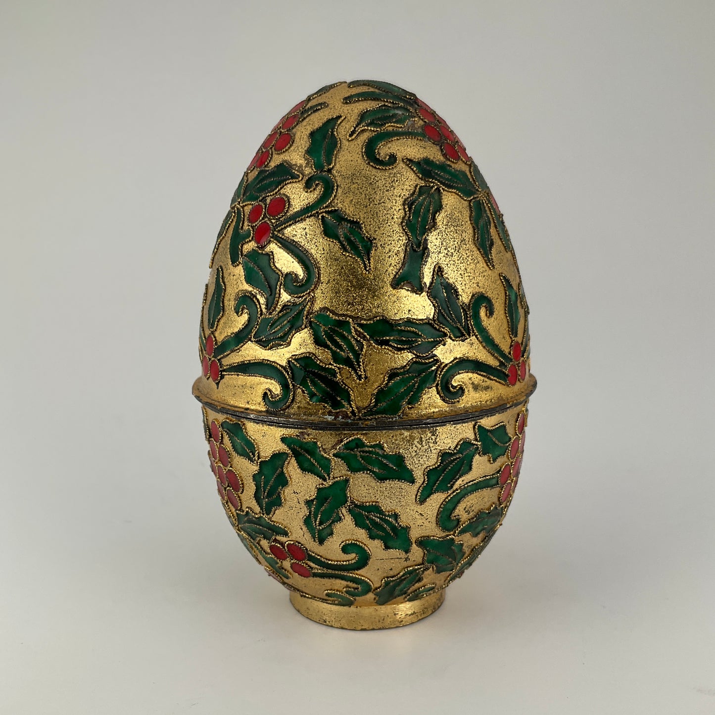 Metallic egg in gold colouring with Christmas holly design. Opens to hold items within.